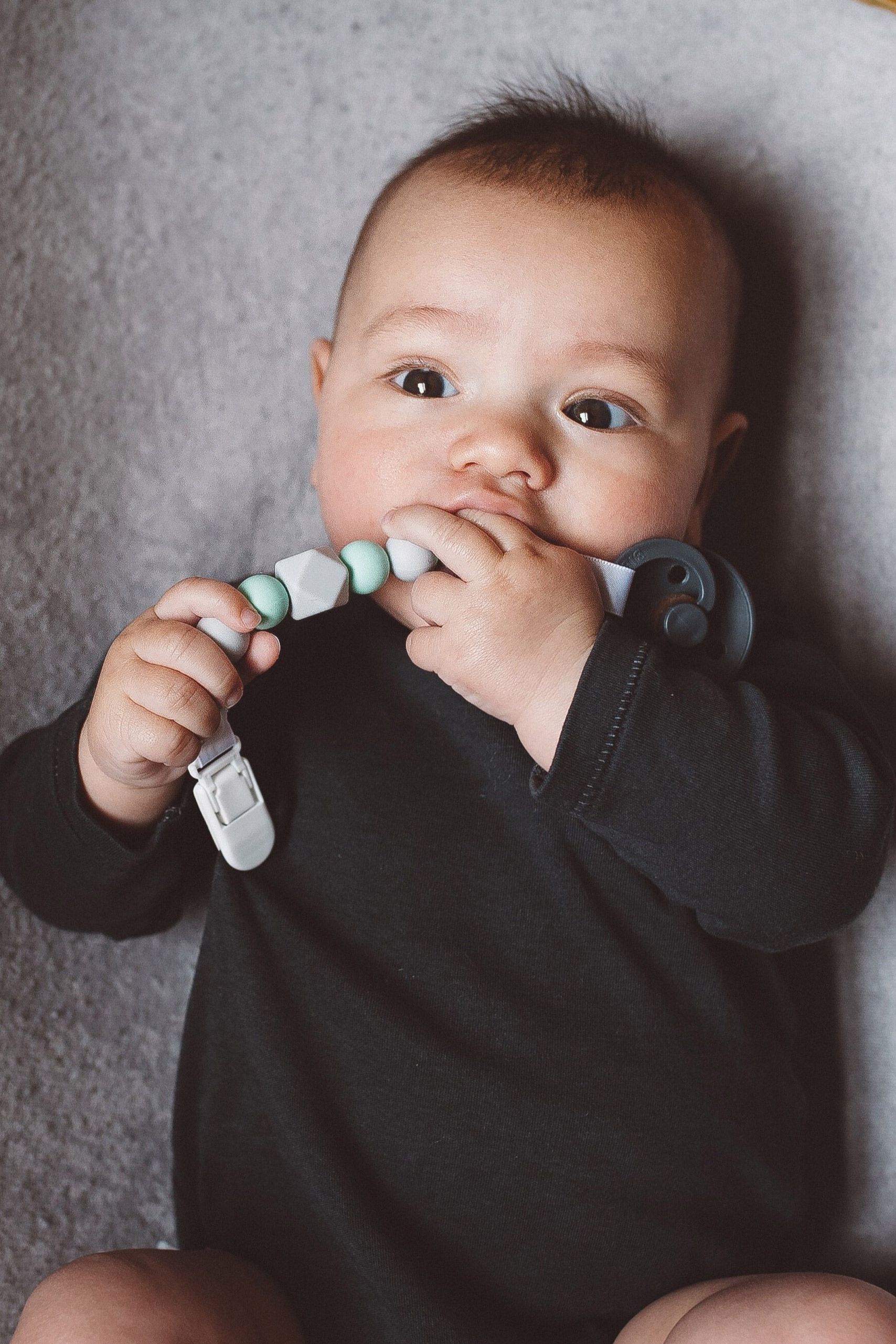 Die leichte Schnullerkette kann dank des Clips überall befestigt werden, zum Beispiel an der Kleidung, am Kinderwagen oder am Autositz, und sorgt dafür, dass der Lieblingsschnuller nicht verloren geht. Außerdem dient die Kette aus BPA-freien Silikonperlen als ideales Beißspielzeug beim Zahnen. Farbe: mint/grau