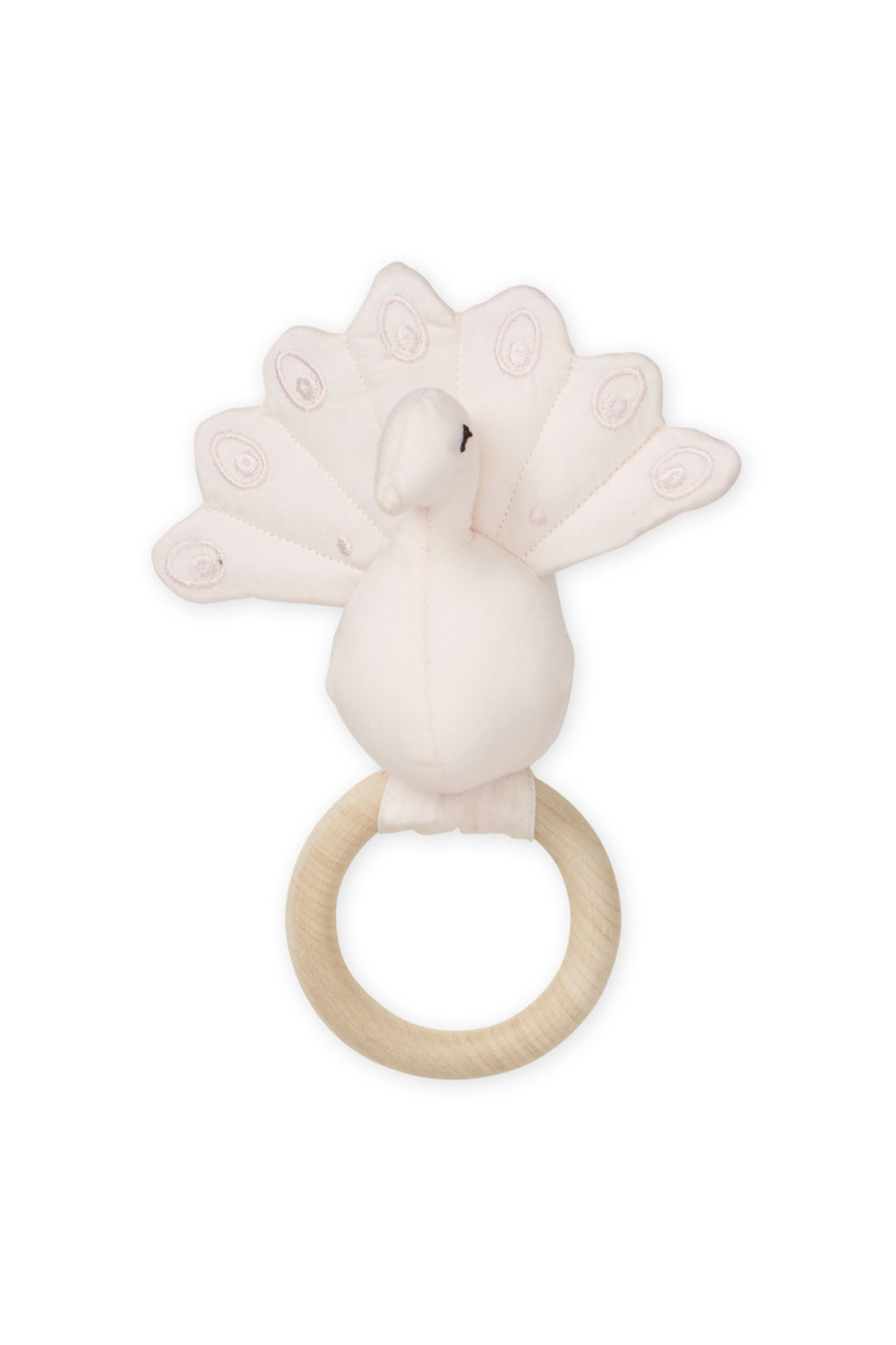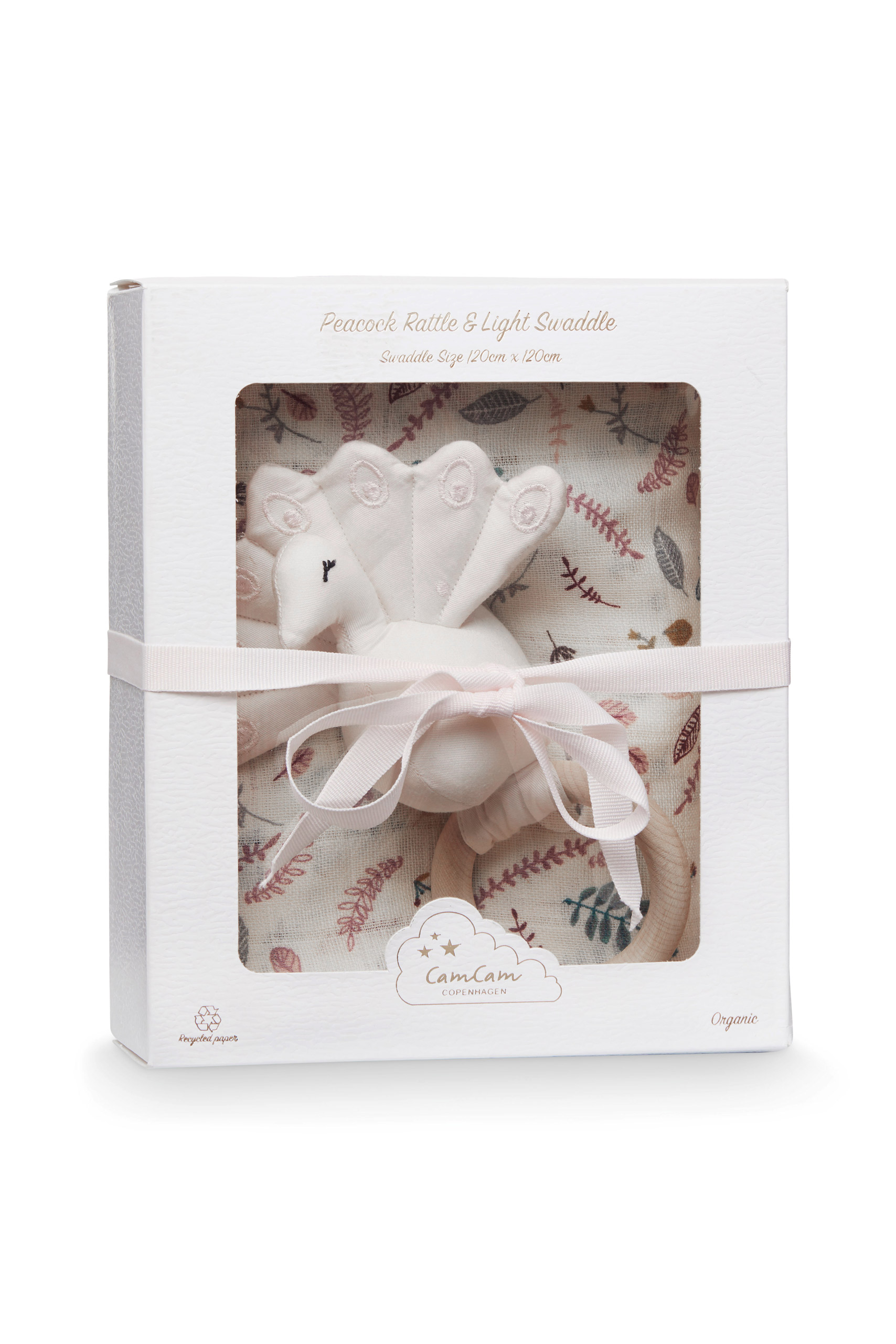 Süße Geschenkebox mit farblich aufeinander abgestimmtem Puck- und Spucktuch aus Bio-Baumwolle und einer Rassel (Pfau) mit integriertem Glöckchen. Farbe: rose