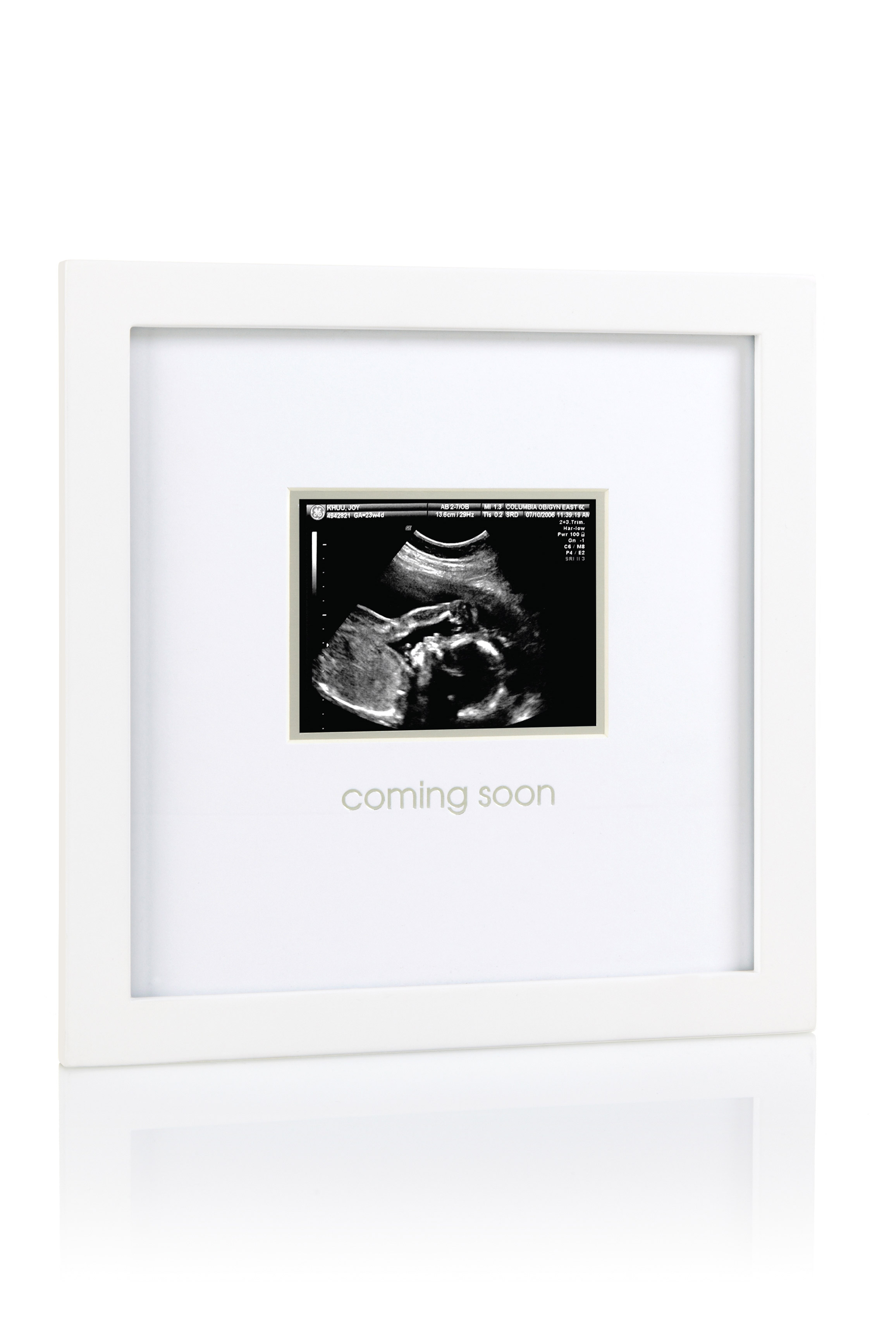 Liebe auf den ersten Blick: dieser Rahmen bietet Platz für das erste Ultraschallbild deines Babys. Mit der Bildunterschrift 'Coming Soon'. Maße: ca. 24x24x1,4cm, Bildausschnitt ca. 10x8cm. Farbe: weiß