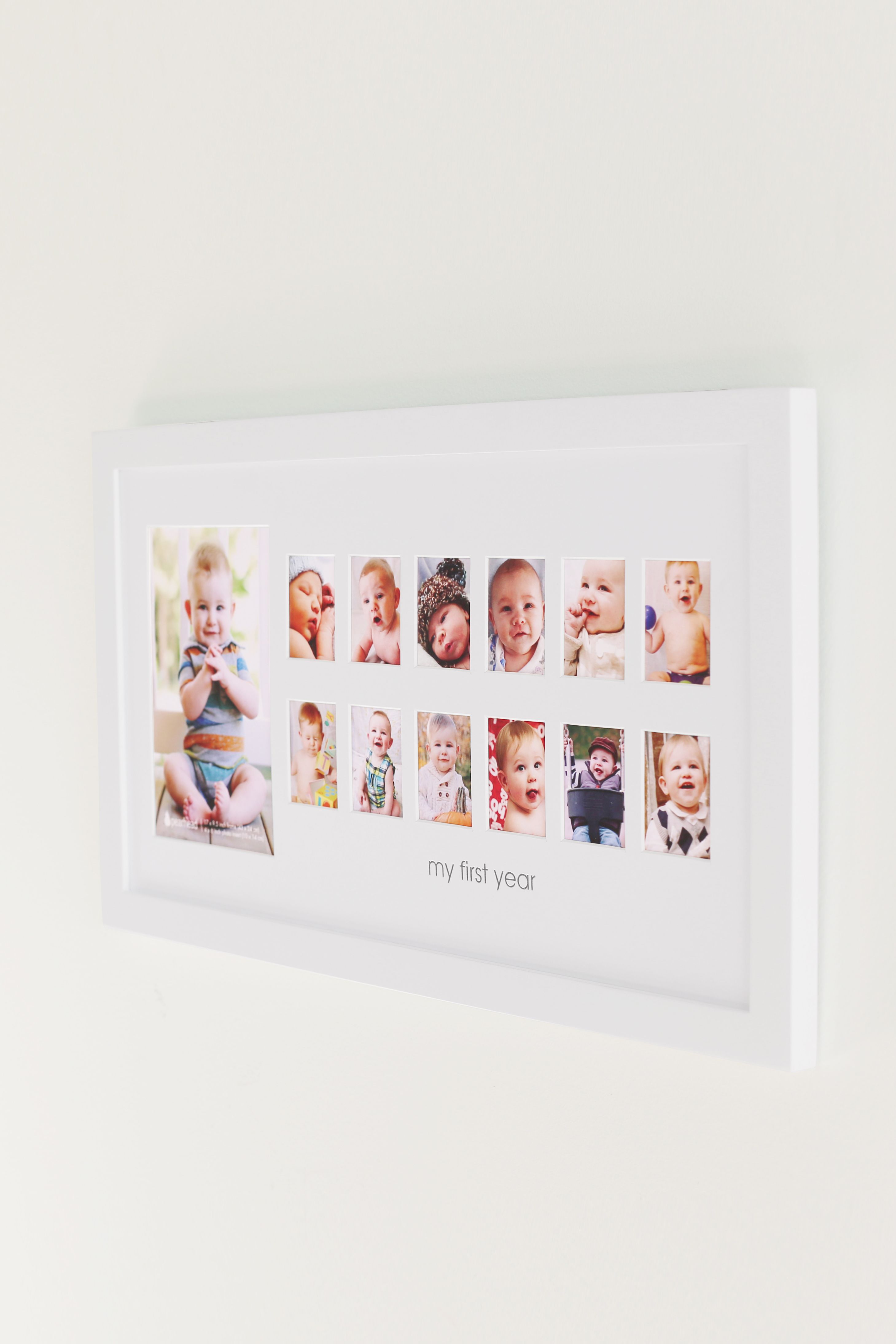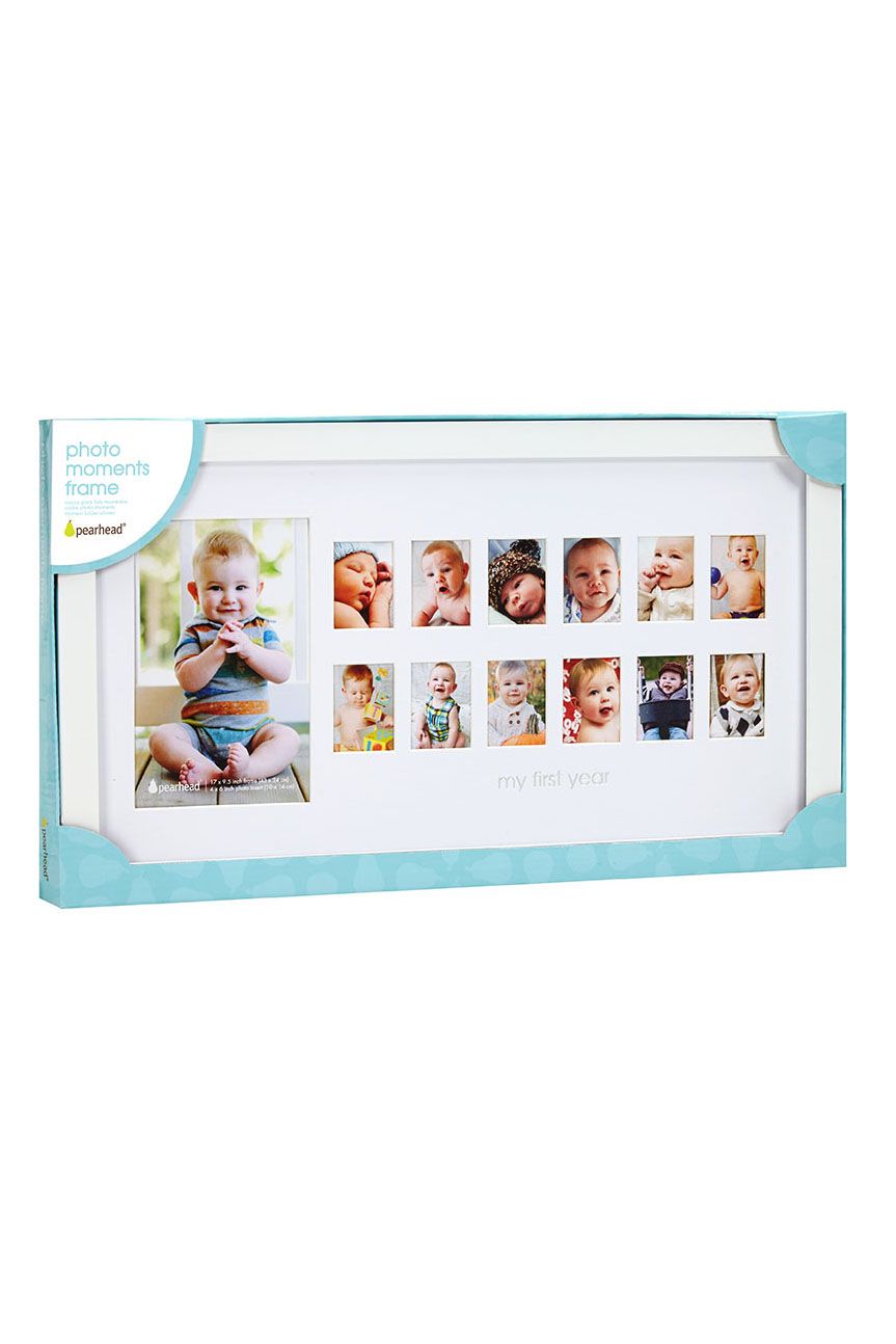Bilderrahmen für 12 kleine und ein großes Bild aus Babys erstem Lebensjahr. Die kleinen Bilder haben eine Größe von ca. 3,5 x 4,5 cm, das große Bild von ca. 10 x 15 cm. Mit silberfarbenem Schriftzug 'my fist year' auf dem Passepartout. Größe gesamt ca. 43 x 24 x 1,5 cm. Farbe: weiß