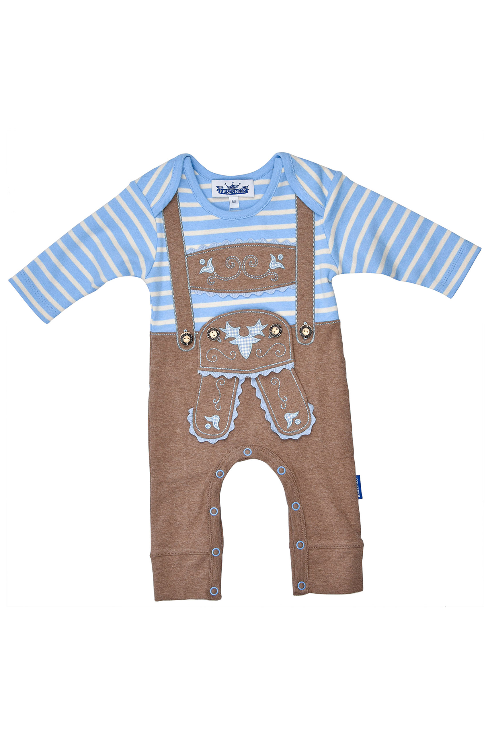 Trachten Strampler aus elastischem Material mit Schlupfkragen und Steifenmuster im Lederhosen Stil, exklusiv aus unserer Baby Trachten Kollektion! Die Druckknöpfe im Schritt erleichtern ein leichtes An- und Ausziehen. Farbe: braun/hellblau