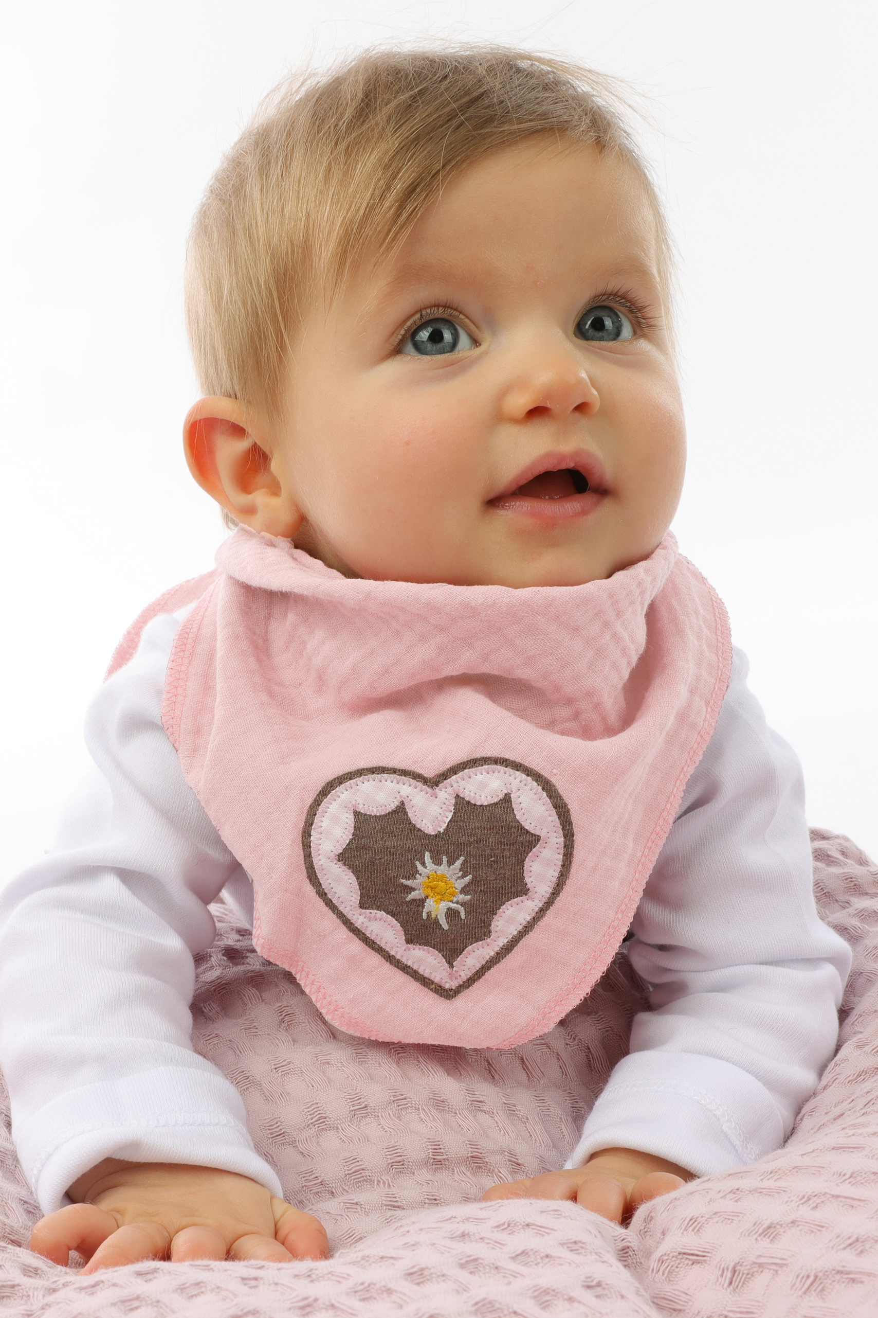 Musselin Trachten Halstuch aus weichem Baumwollmusselin mit gesticktem Lebkuchenherz. Das Tuch kann mit einer Schleife verschlossen werden. Es macht den Trachtenlook komplett. Farbe: rosa