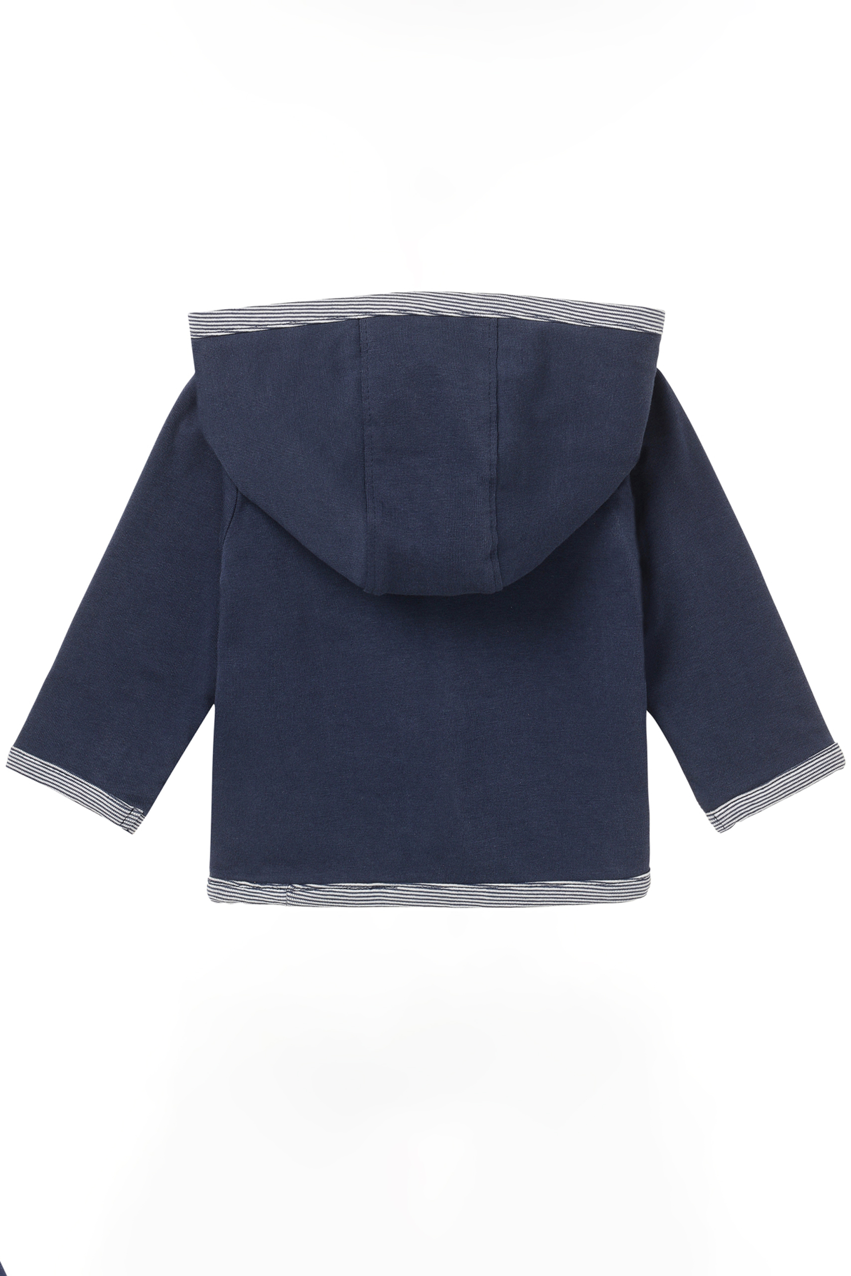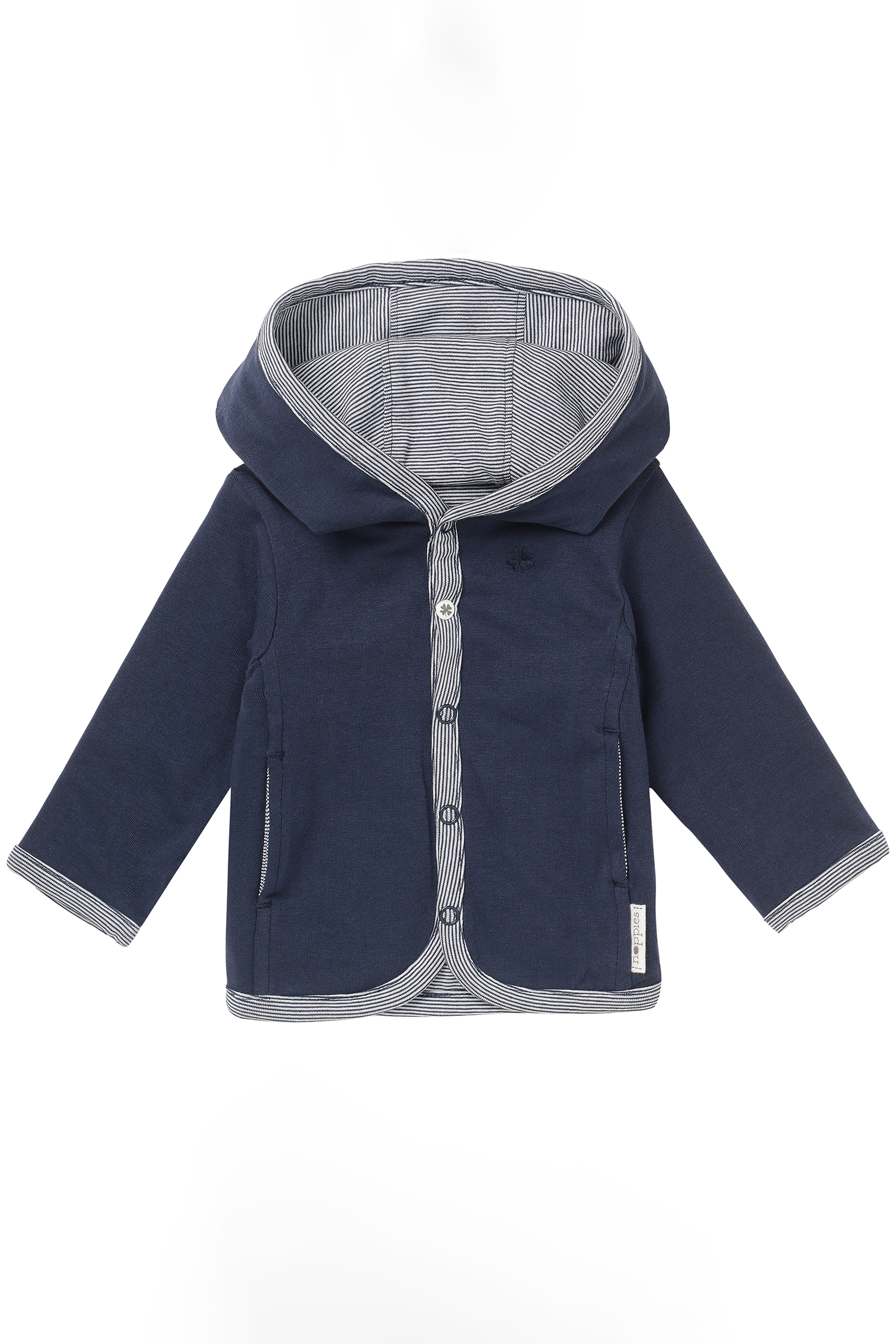Wendejacke für Babys aus besonders weicher, GOTS zertifizierter Bio-Baumwolle mit kleinem Kleeblatt-Motiv. Die Kapuzenjacke kann entweder einfarbig blau oder gestreift getragen werden. Geschlossen wird sie über Druckknöpfe. Farbe: navy