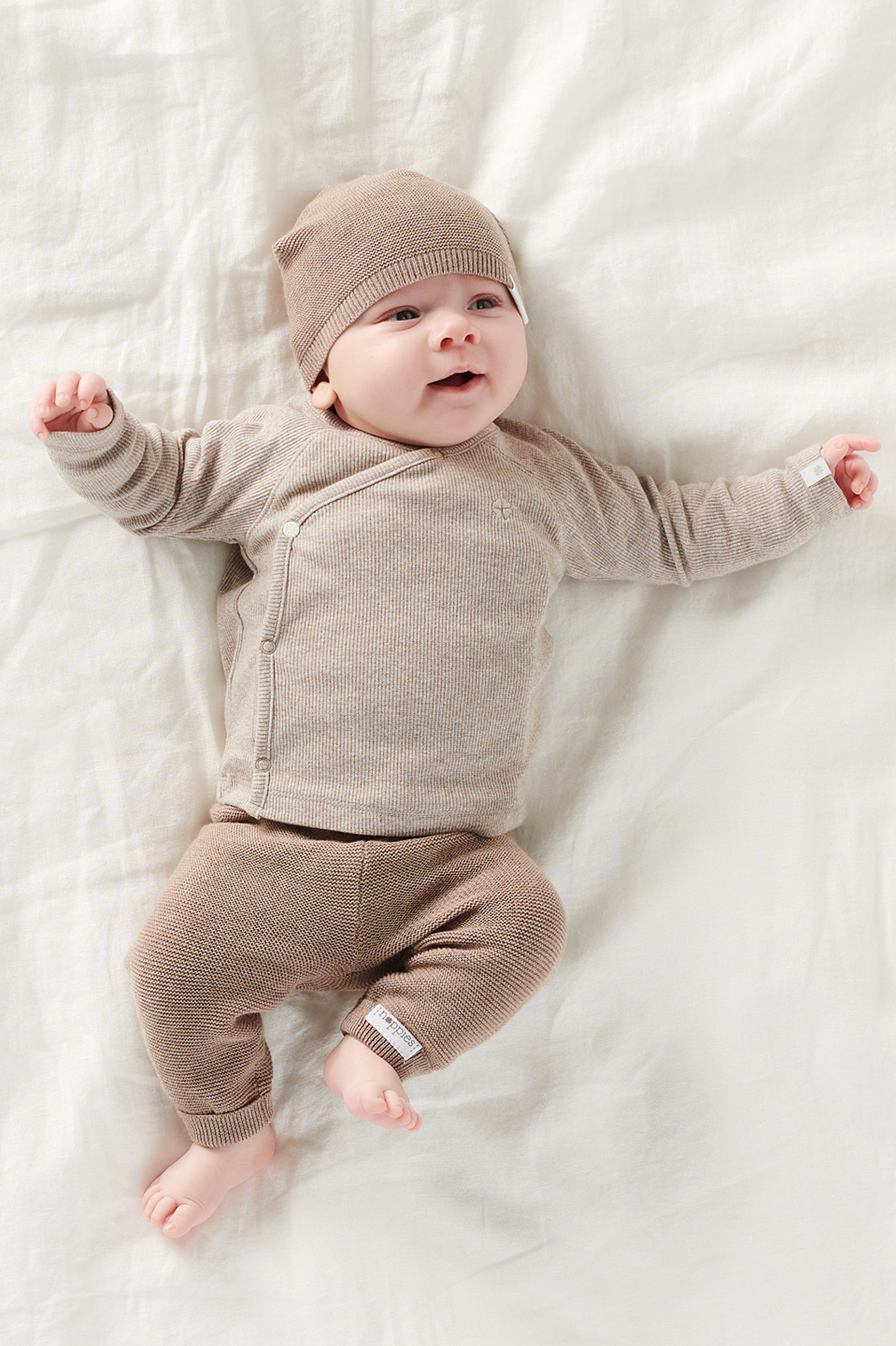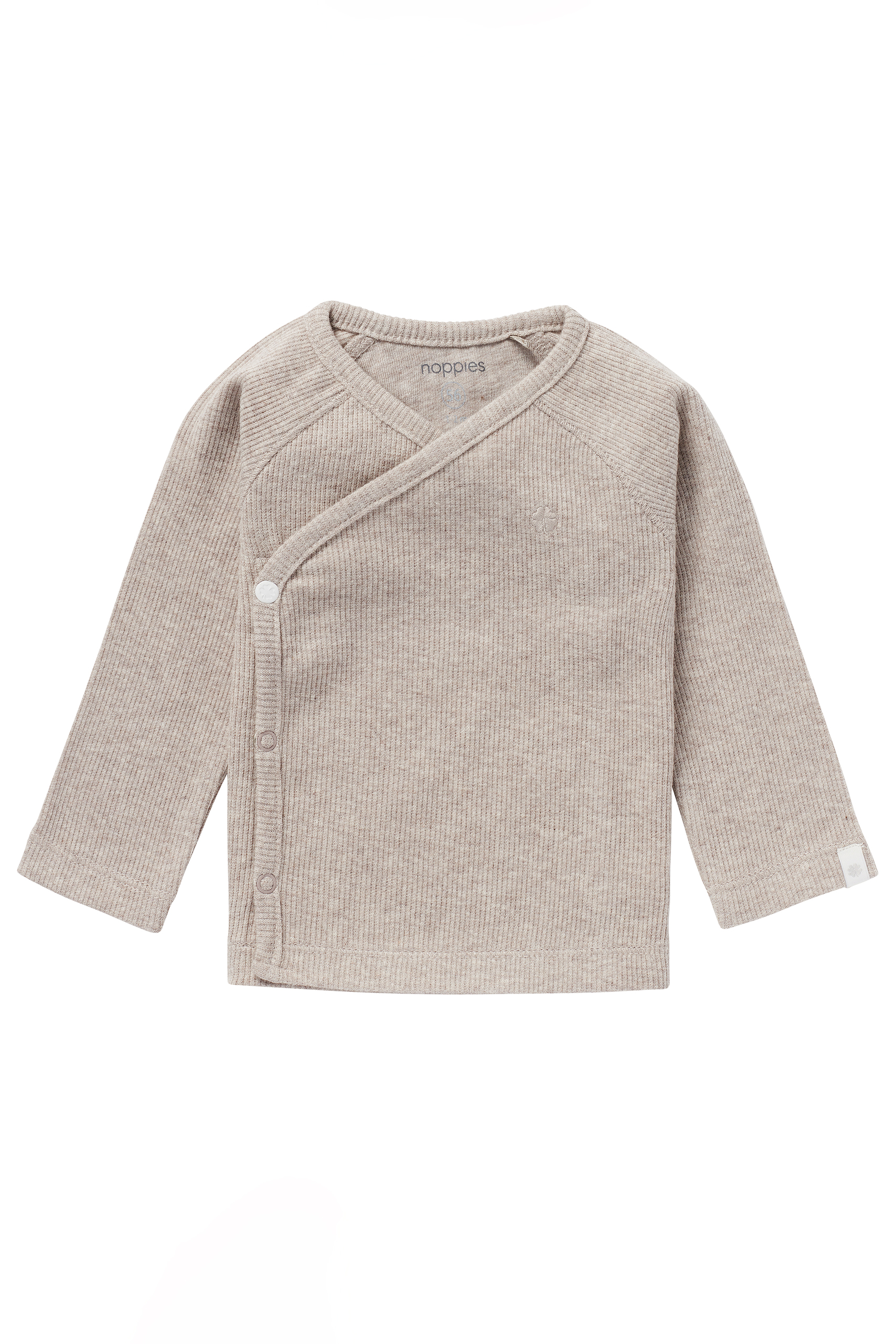 Weiches, geripptes Wickeloberteil für Babys mit langen Ärmeln aus GOTS zertifizierter Bio-Baumwolle und recyceltem Material. Dank der Wickeltechnik und der praktischen Druckknöpfe muss das Oberteil beim An- und Ausziehen nicht über den Kopf gezogen werden. Passt perfekt zur Rippstrick Babyhose taupe. Farbe: taupe