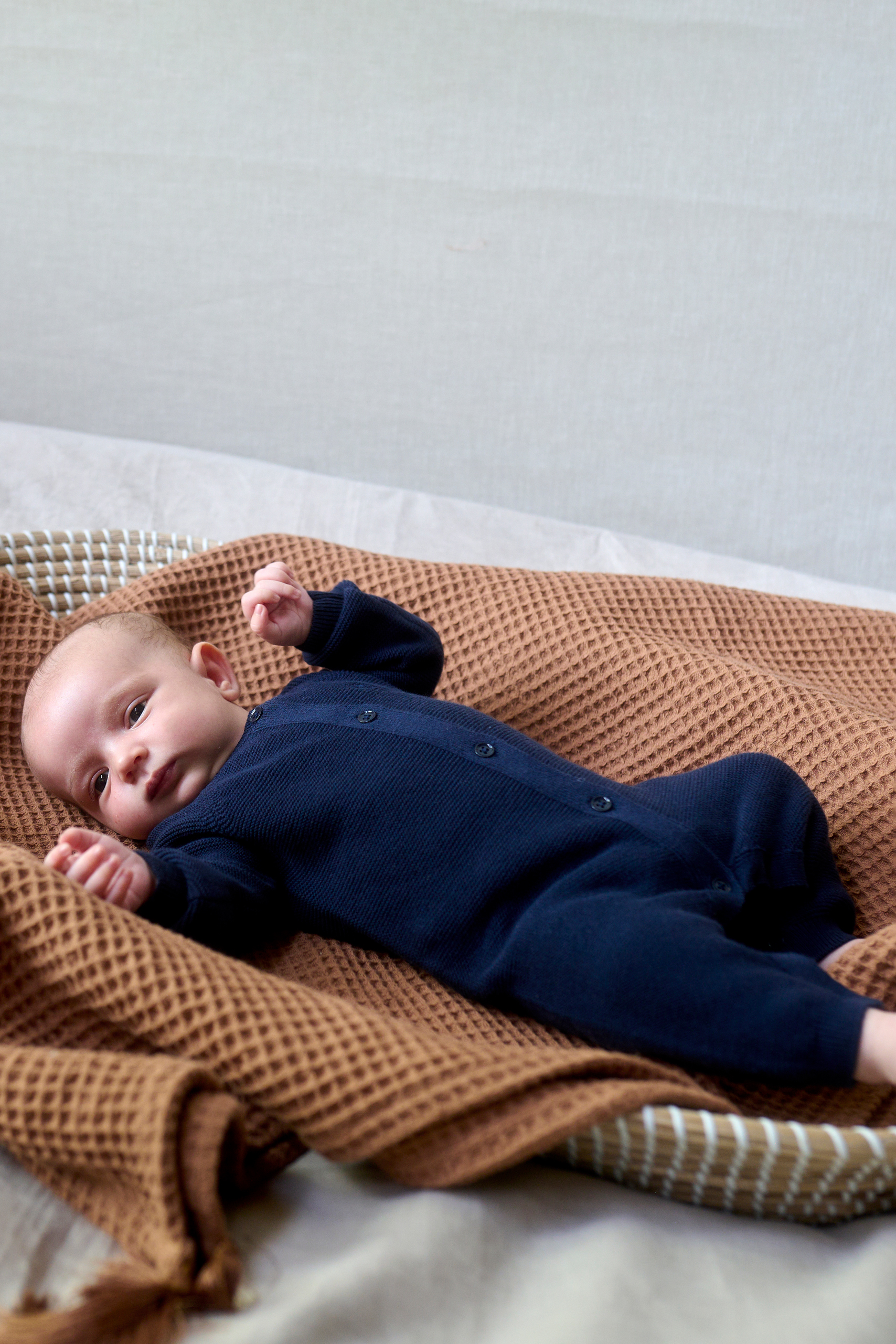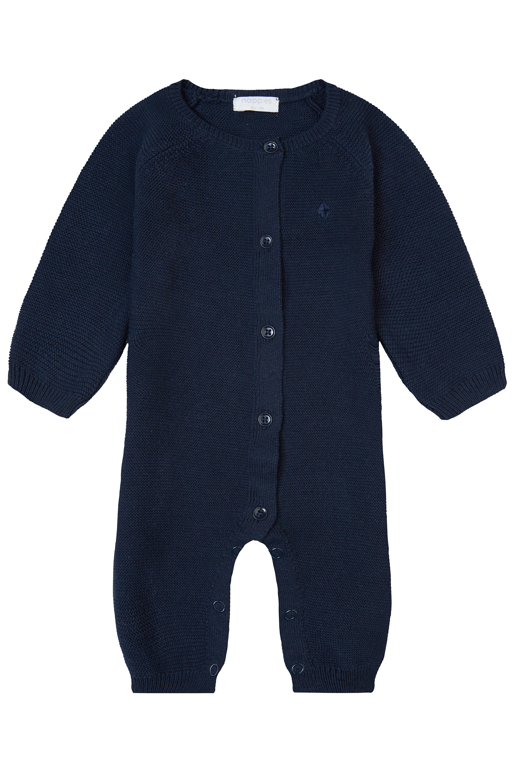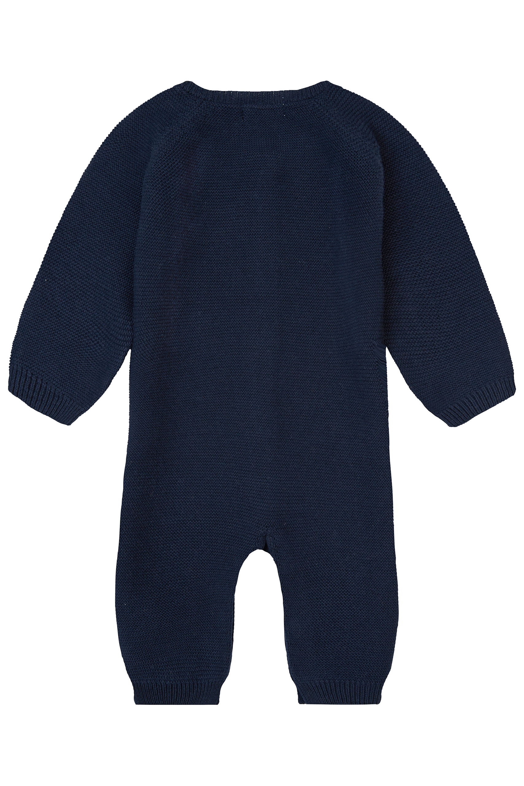 Organic Strickstrampler aus nachhaltiger Bio-Baumwolle mit Knopfleiste. Dank der durchgehenden Knopfleiste, welche bis zu den Innenseiten der Beine führt, kannst du dein Baby schnell und einfach umziehen und wickeln. Durch den weichen Strickstoff ist der Strampler so angenehm zu tragen. Farbe: navy