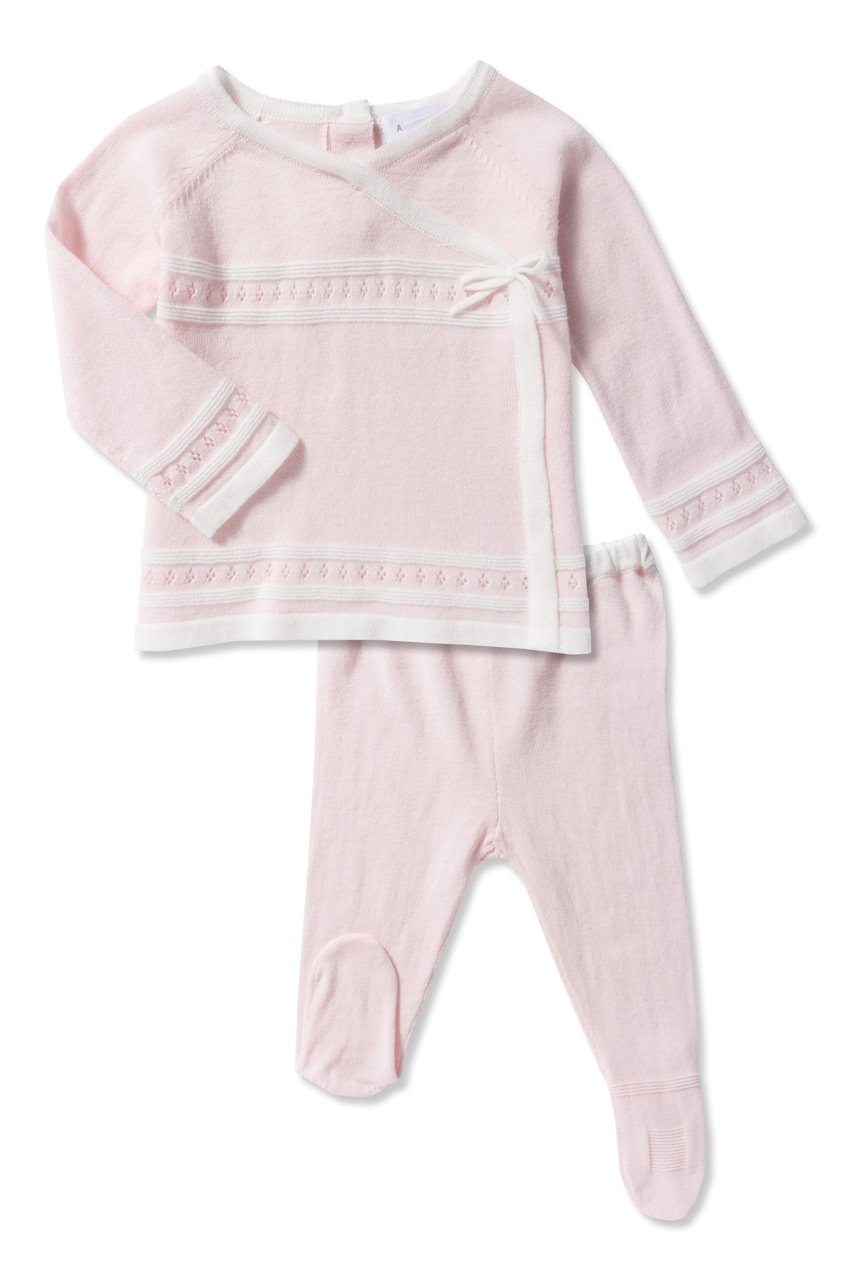 Langärmeliger Zweiteiler aus Baumwolle im Kimono-Stil mit süßen Strickdetails und Schleifchen. Das Unterteil hat einen Gummibund und kann einfach an- und ausziehen lassen. Farbe: rosa/weiß