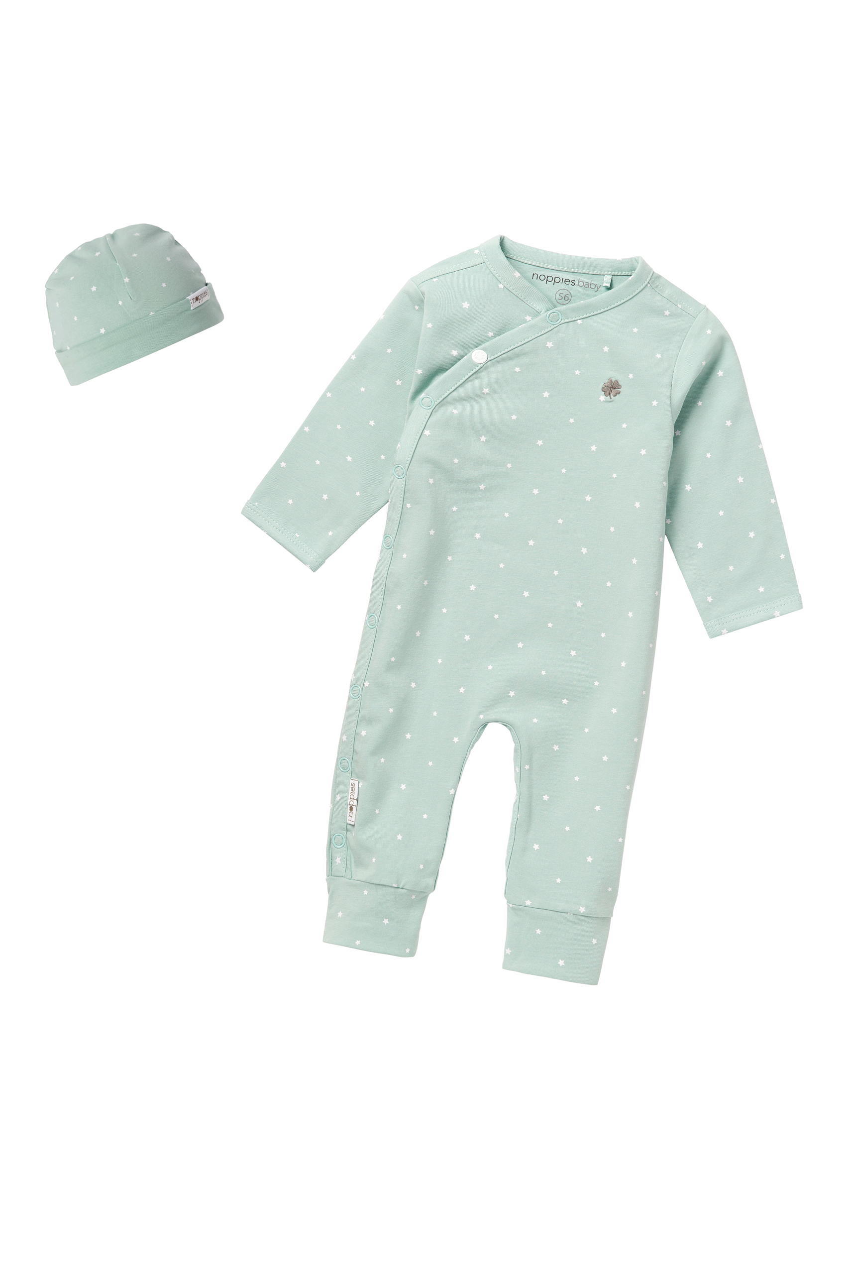 2er Set für Babys bestehend aus einem Strampler und der passenden Wendemütze. Beide Teile sind aus besonders weicher, GOTS zertifizierter Bio-Baumwolle. Der Strampler hat eine Knopflieste, die das An- und Ausziehen erleichtert. Die Mütze kann einfarbig oder mit Pünktchen getragen werden. Farbe: mint