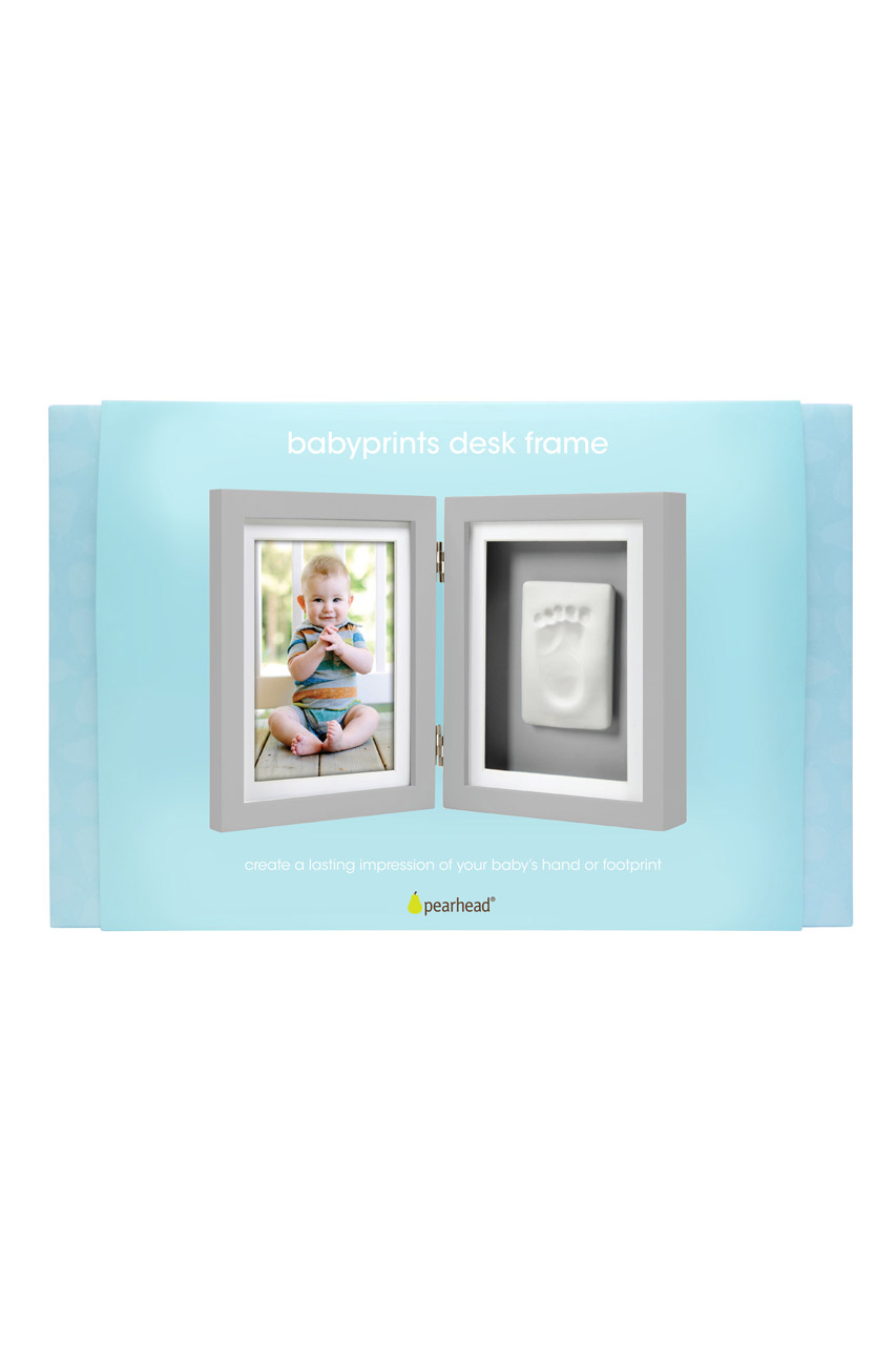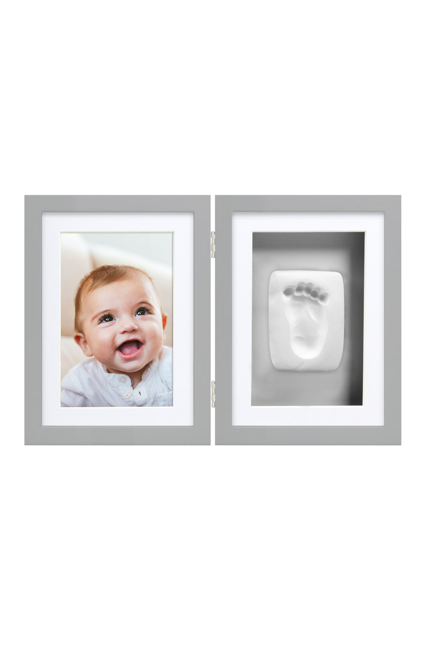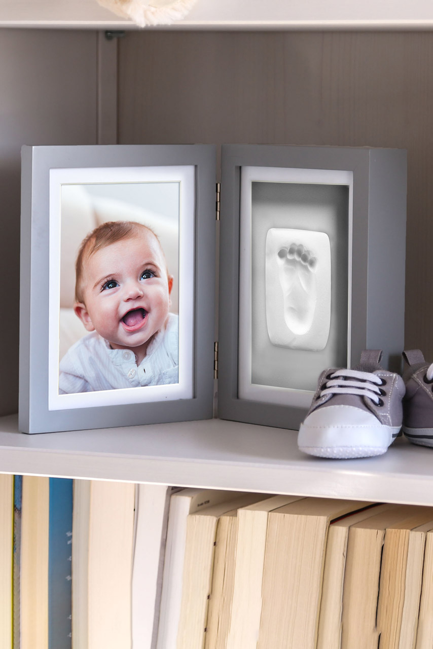 Stand-Bilderrahmen mit Baby Abdruckset, grauer Hintergrund