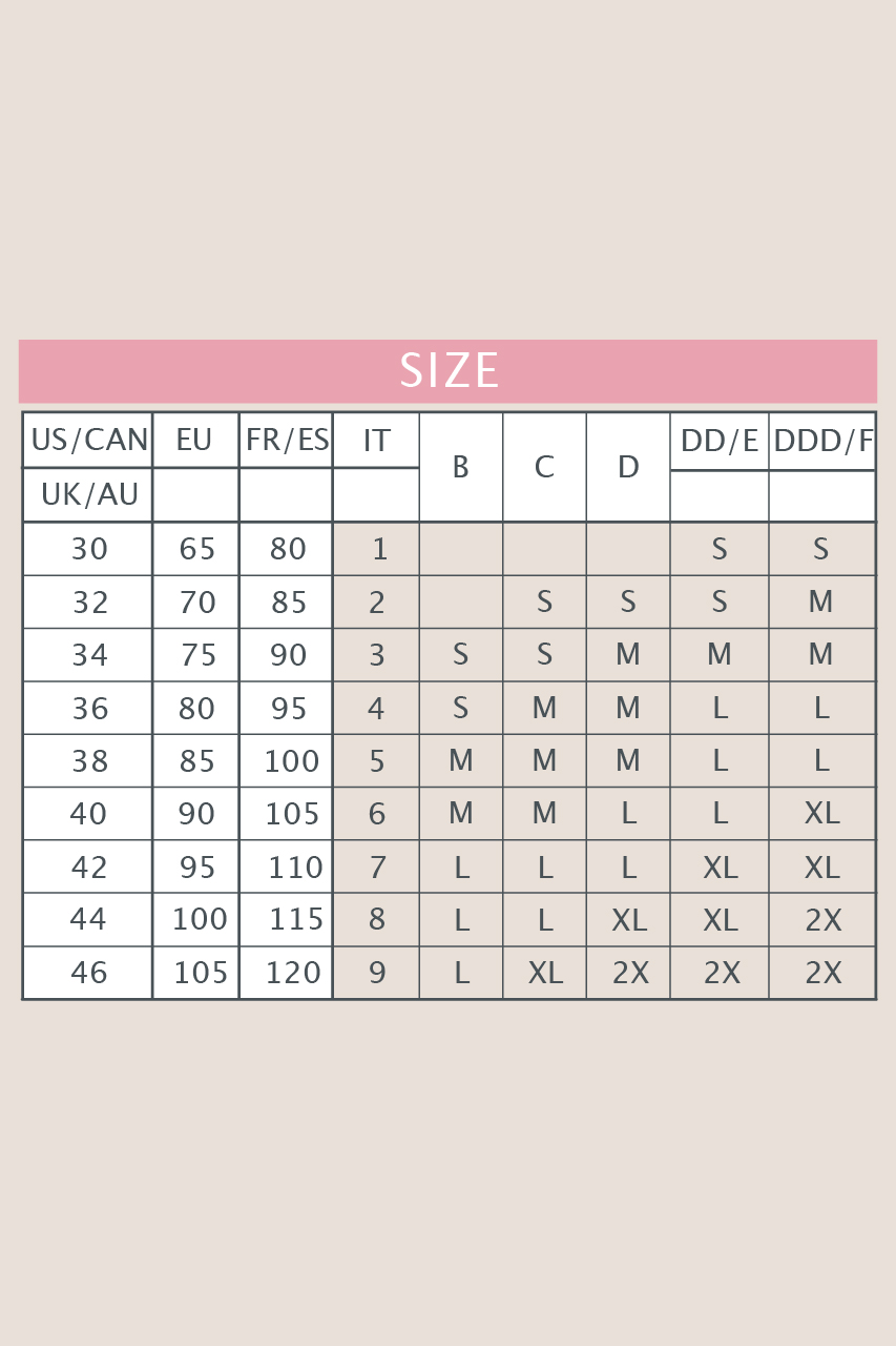 - XL: 40 Cup F, 42 Cup E-F, 44 Cup D-E, 46 Cup C