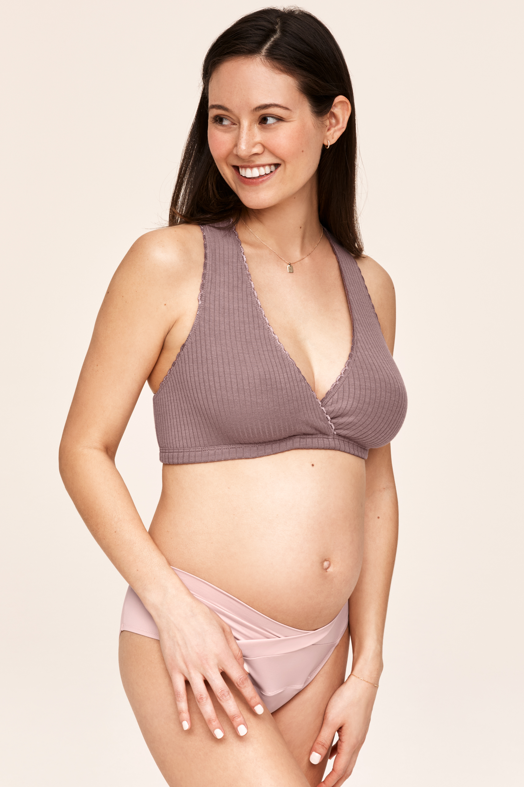 Schlaf Still BH ohne Bügel aus weichem Ripp-Jersey, mit feiner Spitzenborte am Cache-Coeur Ausschnitt. Dank des weichen Materials und keinem Verschluss, ist der BH besonders komfortabel, auch super nachts zu tragen und passt sich deiner Brust ideal während der Schwangerschaft und Stillzeit an. Stille dein Baby ganz schnell und easy auch nachts, indem du die Lagen des Cache-Coeur Ausschnitts auseinander schiebst. Farbe: altrosa