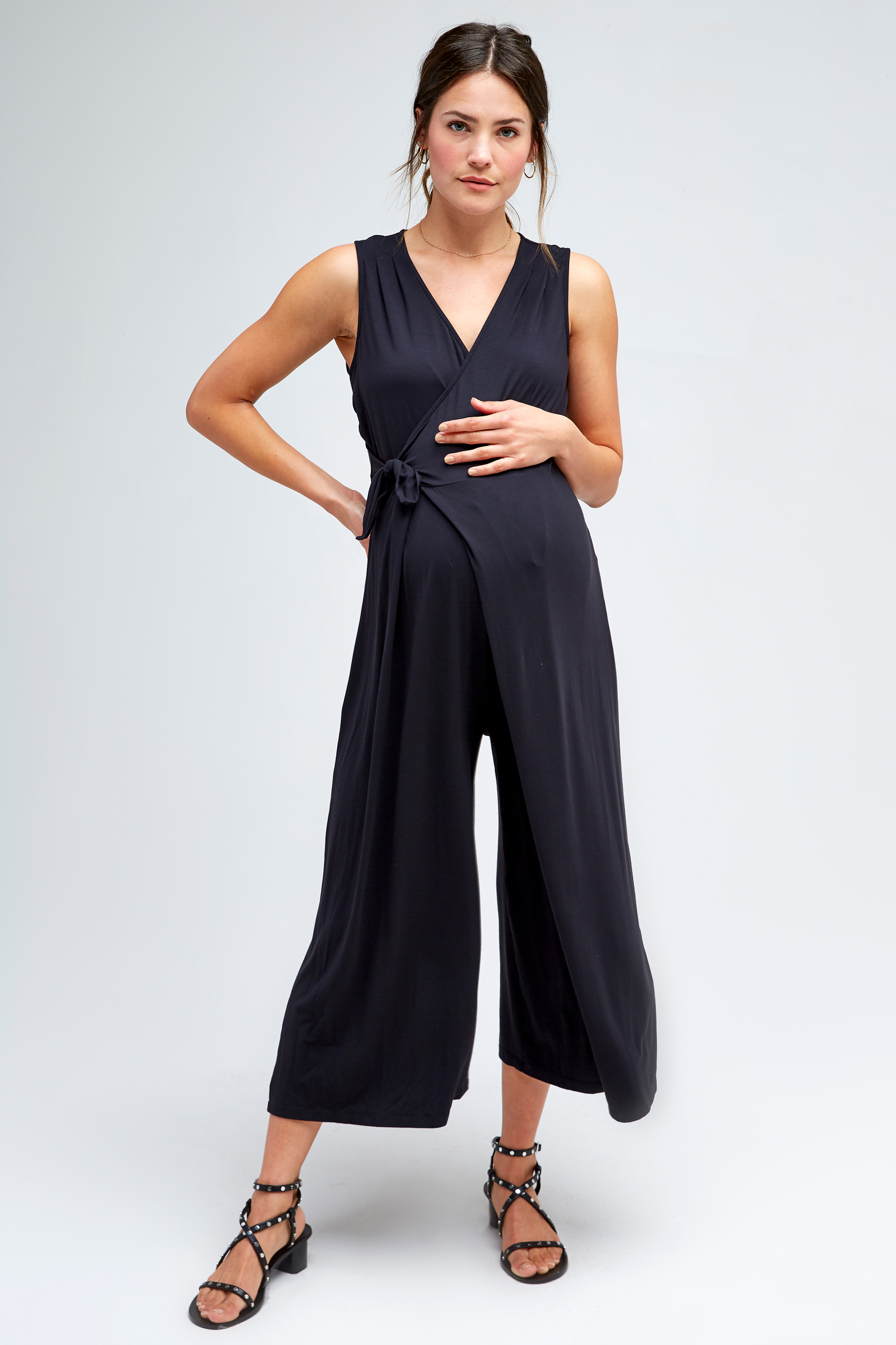 Umstands- und Still Jumpsuit aus weicher Bambus-Viskose mit schönem Wickeldesign, seitlicher Bindung und weitem Bein in 3/4 Länge. Die spezielle Schnittführung gibt deinem Bauch in jeder Phase deiner Schwangerschaft ausreichend Platz. Das perfekte Outfit fürs Büro, zum Shopping oder abends zum Dinner! Farbe: schwarz