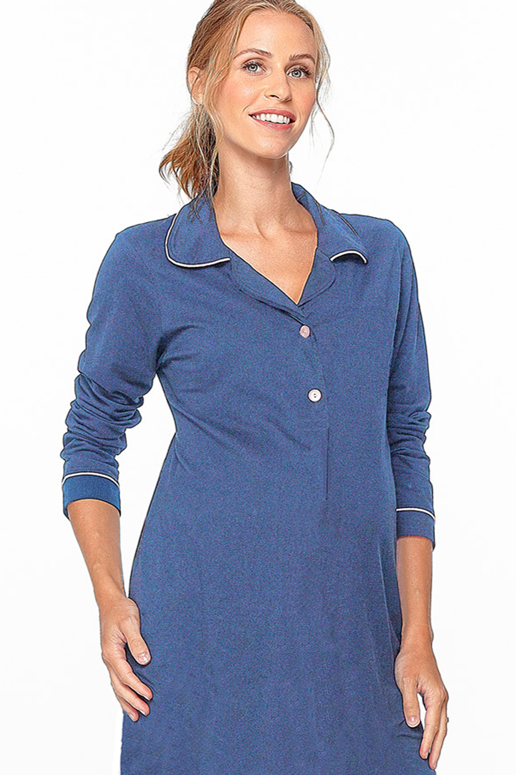 Leichtes Umstands- und Still-Nachthemd mit Hemdkragen und abgerundetem Saum mit seitlichen Schlitzen. Über die Knopfleiste erhältst du einen schnellen Zugang zur Brust. Ideal für die gesamte Schwangerschaft und Stillzeit. Farbe: blau