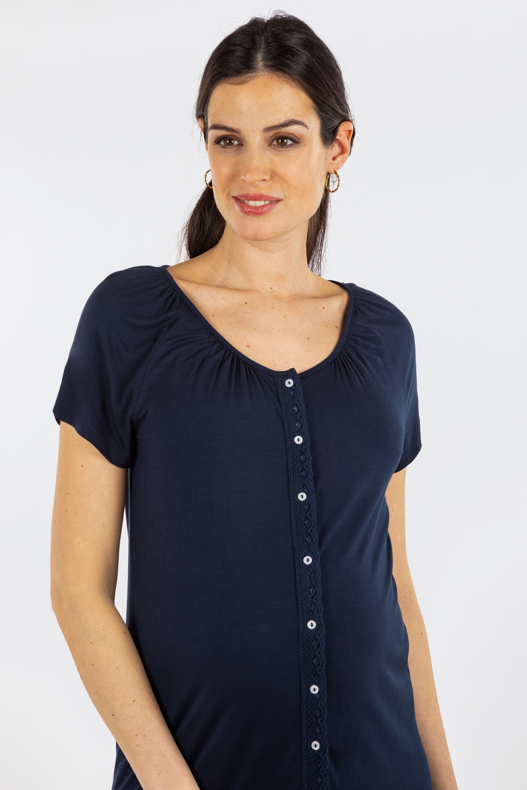 Eco Viskose Umstands- und Stillnachthemd mit Rundhalsauschnitt, kurzen Ärmeln und durchgehender Knopfleise mit Zierborte im angesagten Häkel-Stil. Das elastische Material bietet deinem wachsendem Babybauch genügend Platz zu jeder Phase deiner Schwangerschaft. Dank der durchgehender Knopfleiste mit hübschen Perlmuttknöpfen, kannst du später wunderbar darin stillen. Farbe: navy