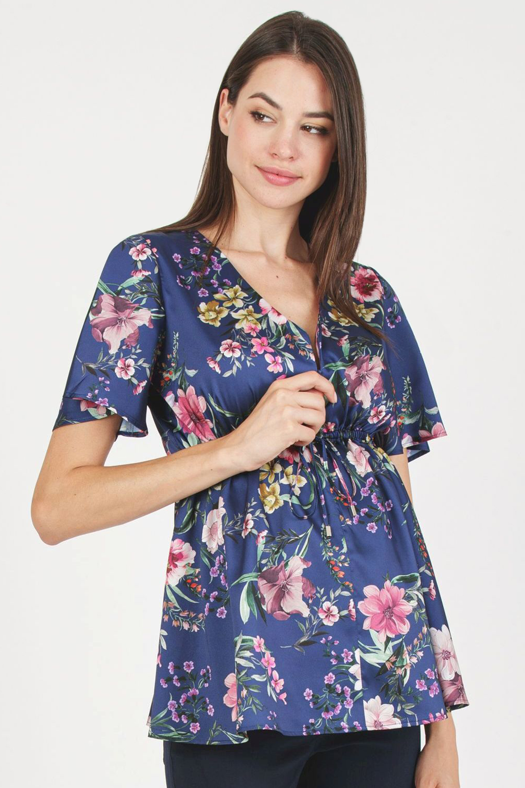 Umstands- und Stillbluse aus schimmernden Satin mit V-Ausschnitt und kurzen Flügelärmeln. Der integrierte Tunnelzug in der Taille kann zu einer Schleife gebunden werden. Durch den verdeckten Reißverschluss im Ausschnitt hast du einen einfachen Stillzugang und so bleibt dir die Bluse auch nach der Geburt erhalten. Farbe: blau/print