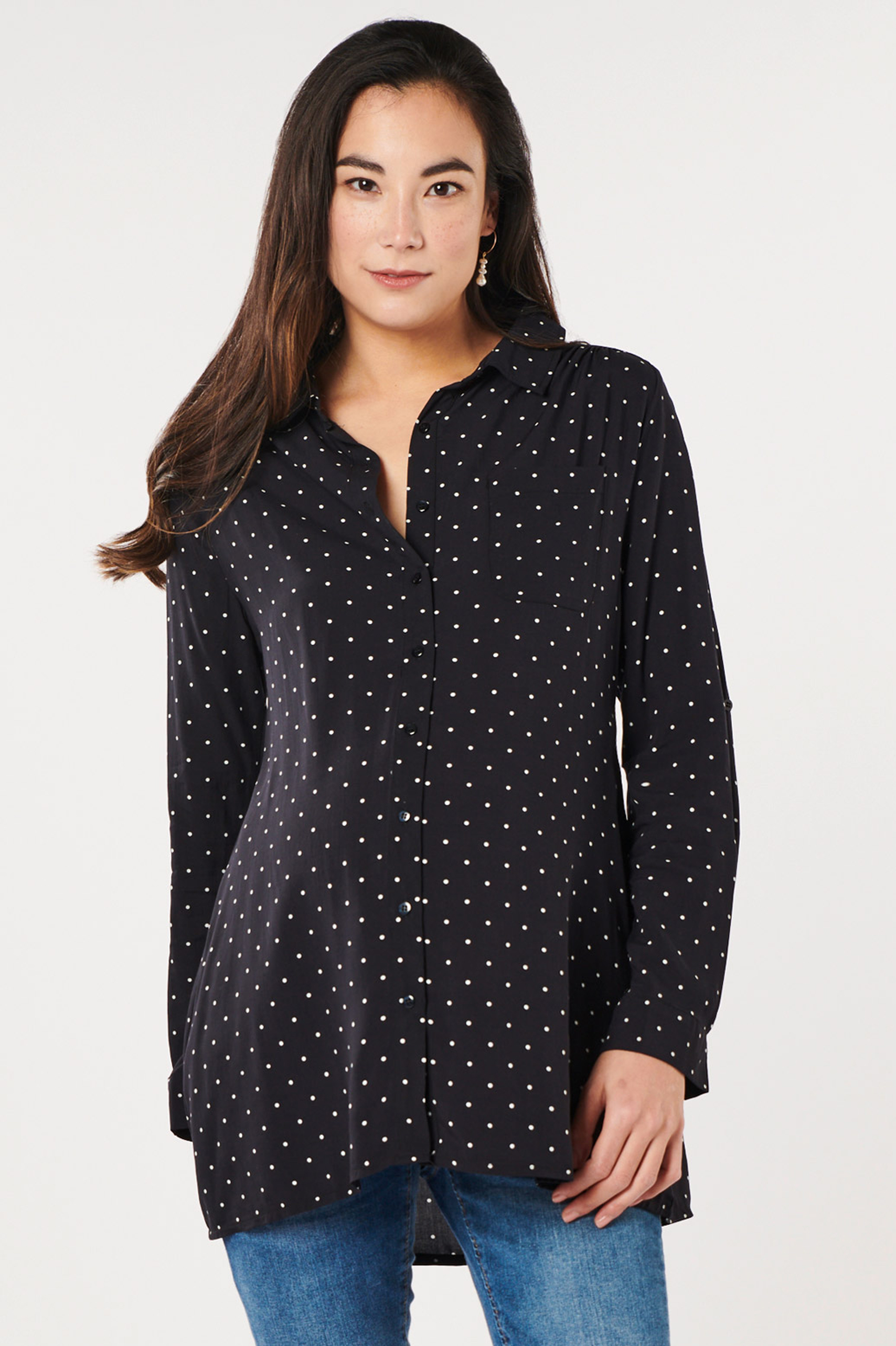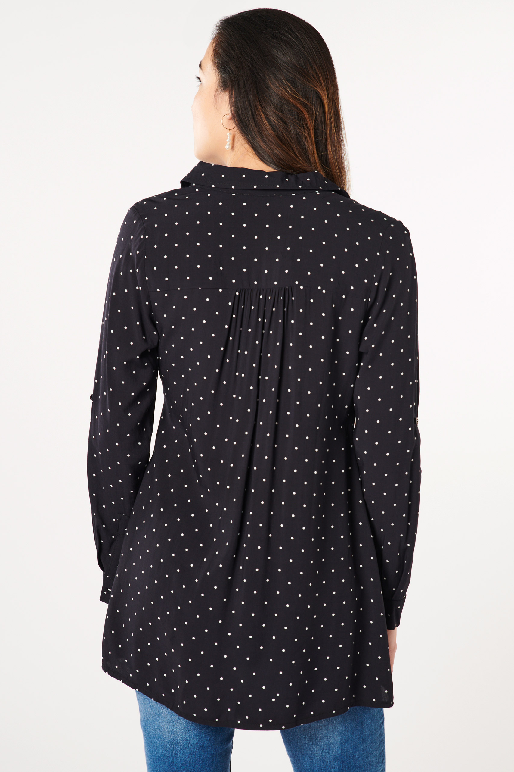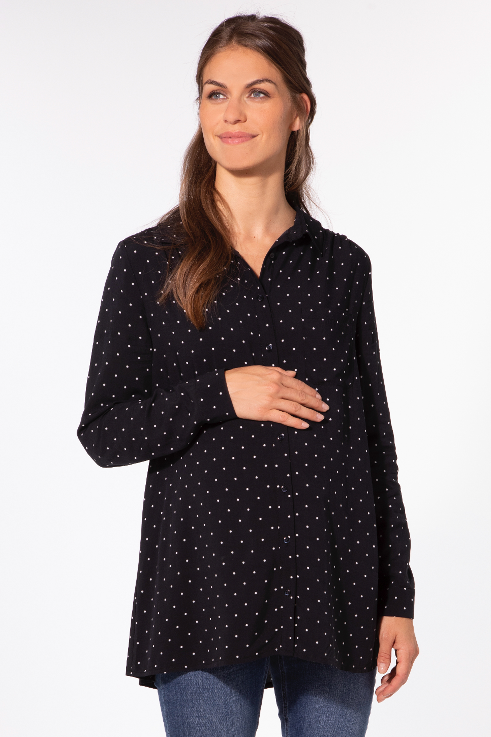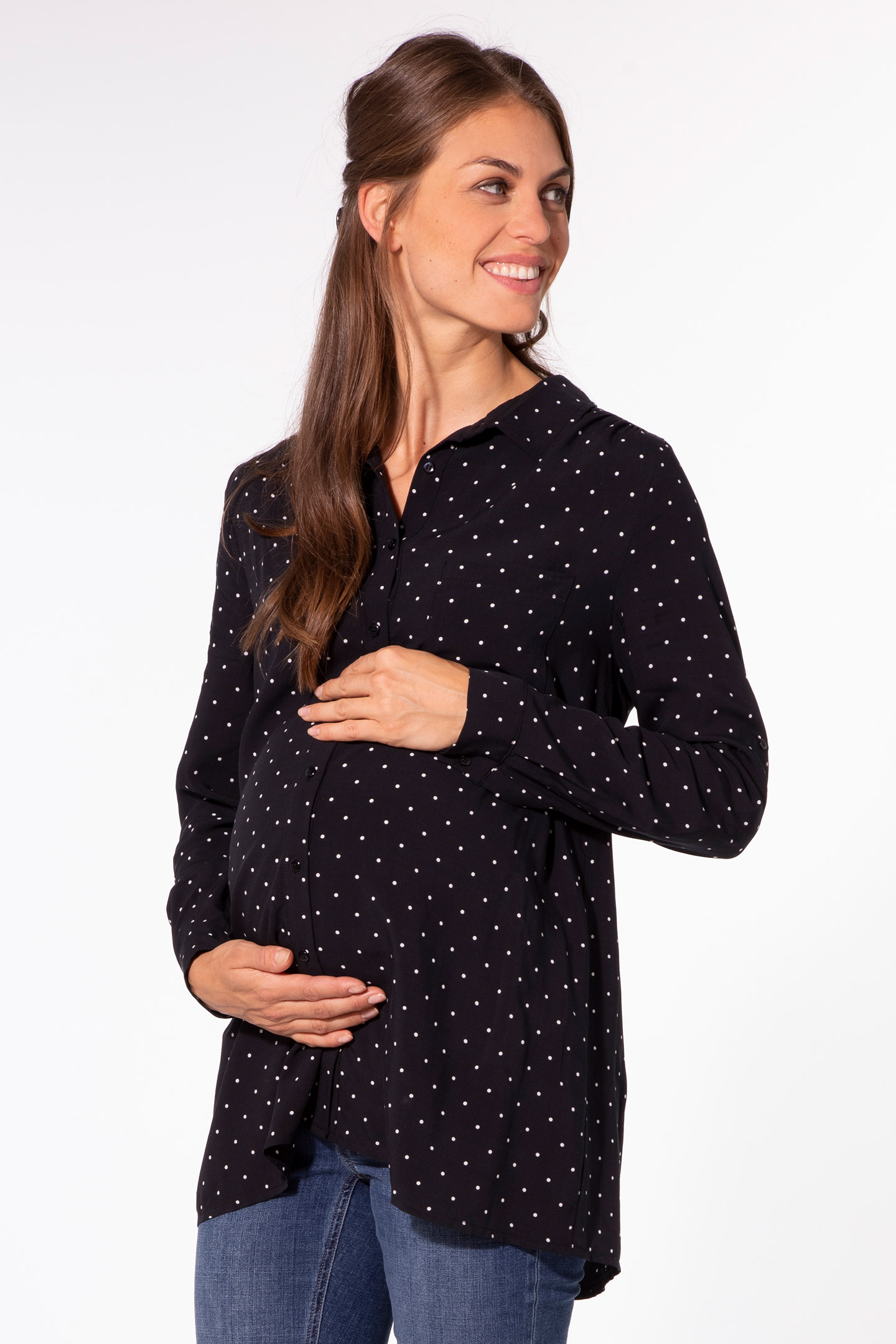 Umstands- und Stillhemdbluse mit Allover-Polka-Dot-Print, Brusttasche und kleinen Raffungsdetails an den Schultern und am Rücken. Die Ärmel können hochgekrempelt mit Knopf und Riegel befestigt werden. Die Bluse ist für Schwangerschaft und Stillzeit geeignet und bietet dir mit der durchgängigen Knopfleiste einen einfachen Stillzugang. Farbe: schwarz/weiß
