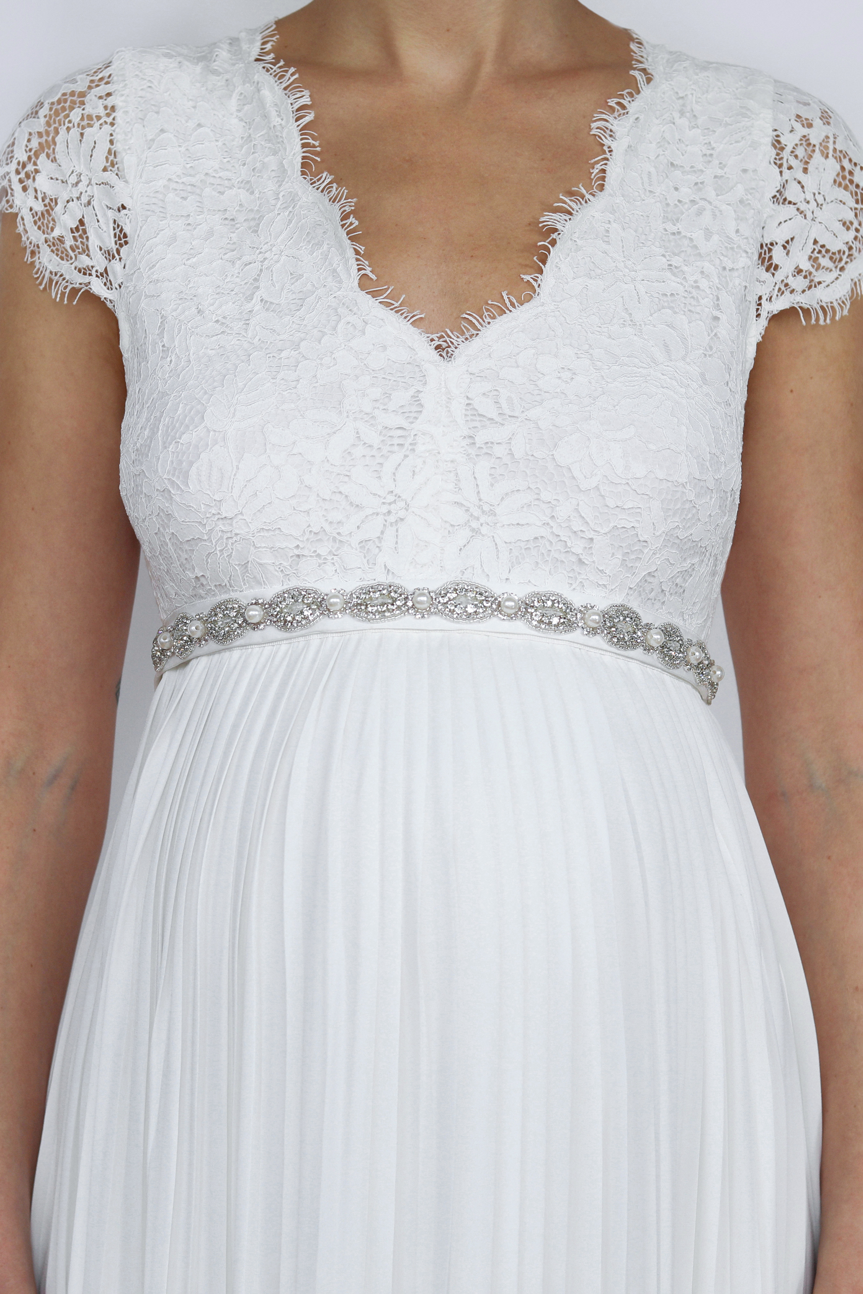Die Schmuckschärpe lässt sich perfekt zu deinem Brautkleid mit Babybauch kombinieren. Sie wurde aufwändig mit vielen, schimmernden Schmucksteinen bestickt und sorgt für ein funkelndes Highlight bei deinem Hochzeitsoutfit. Farbe: elfenbein