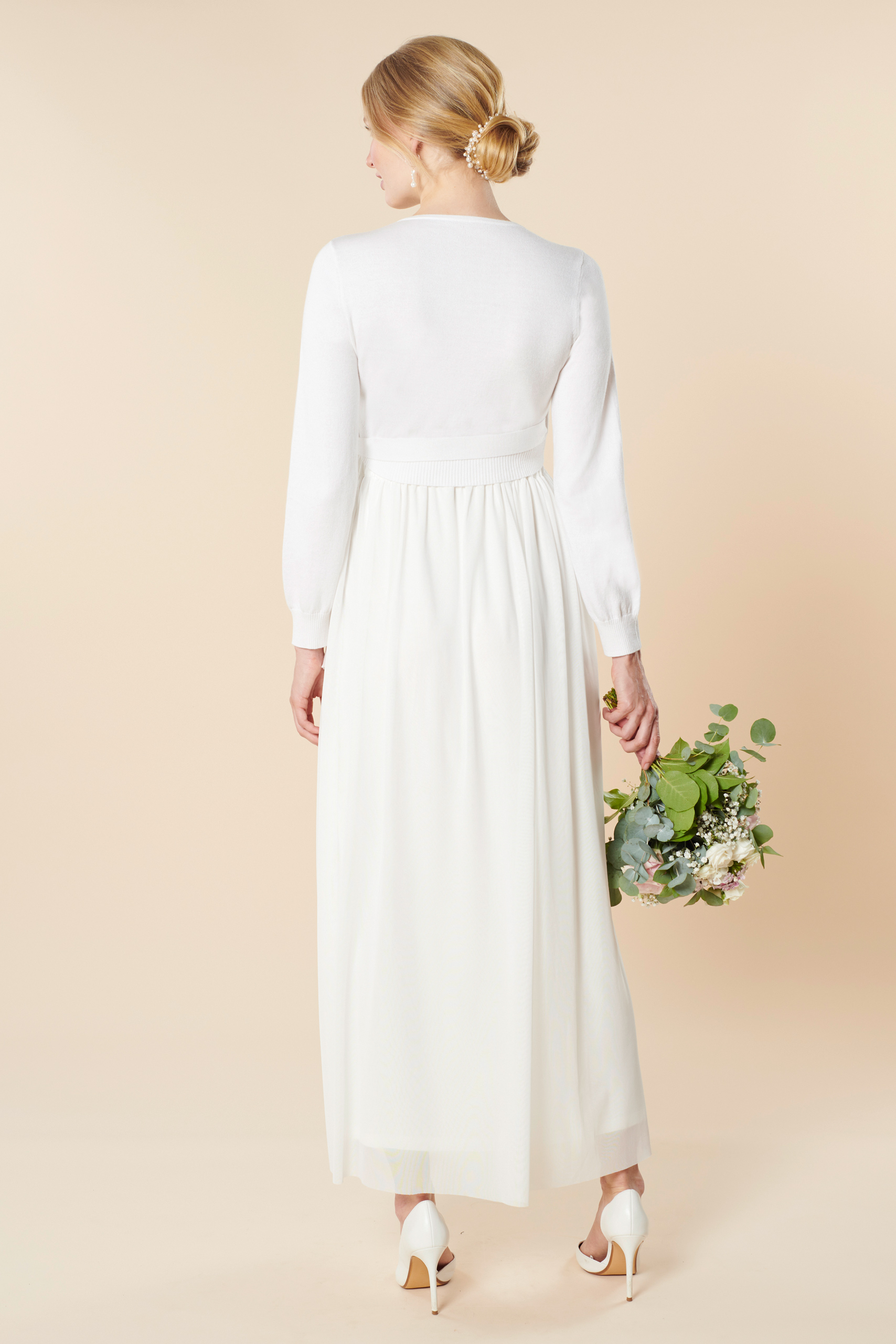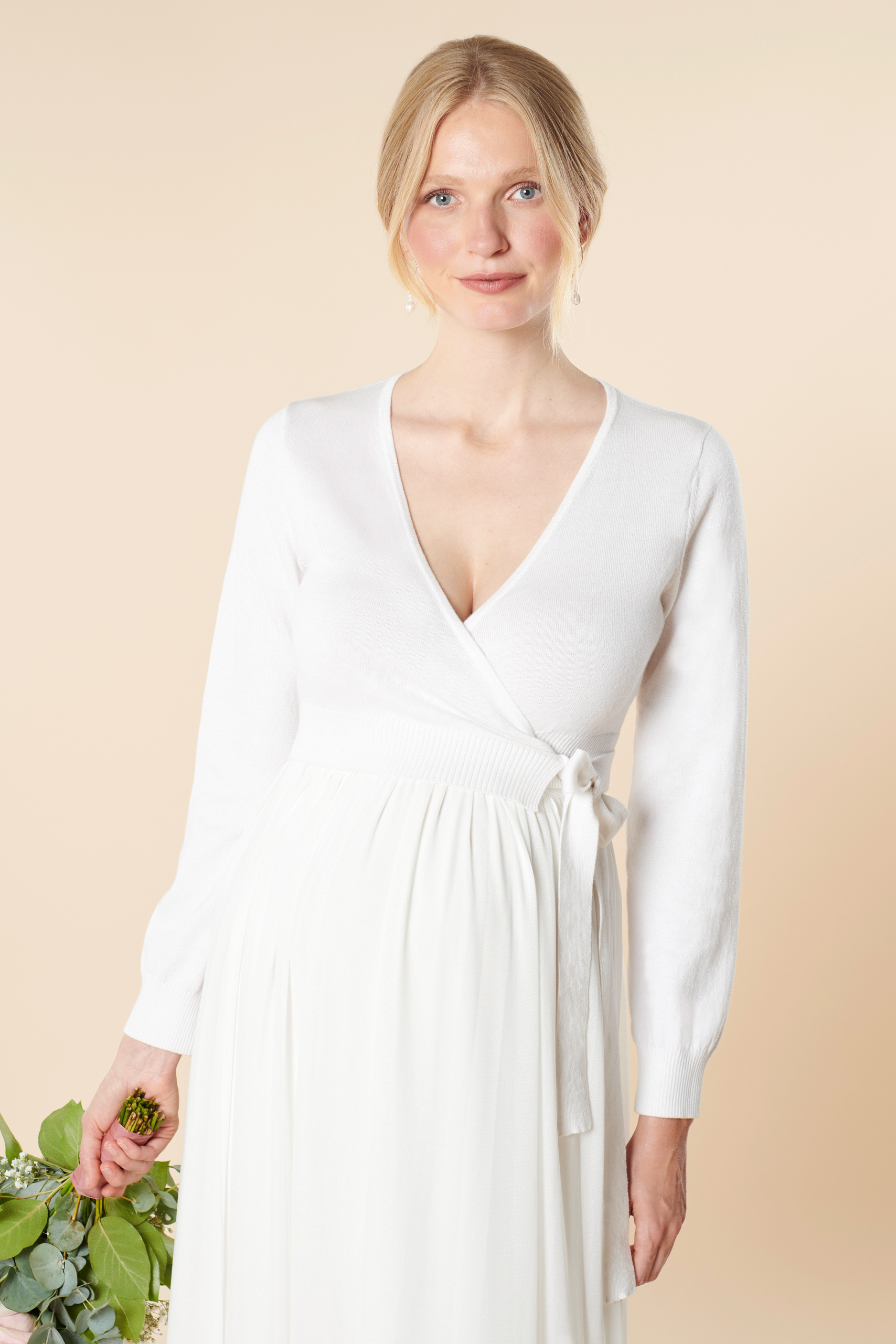 Umstandsbolero zum Wickeln mit Kaschmir und V-Ausschnitt. Durch den kurzen Schnitt wird die Empire Line betont und lässt sich einfach zu jedem Brautkleid kombinieren. Farbe: elfenbein