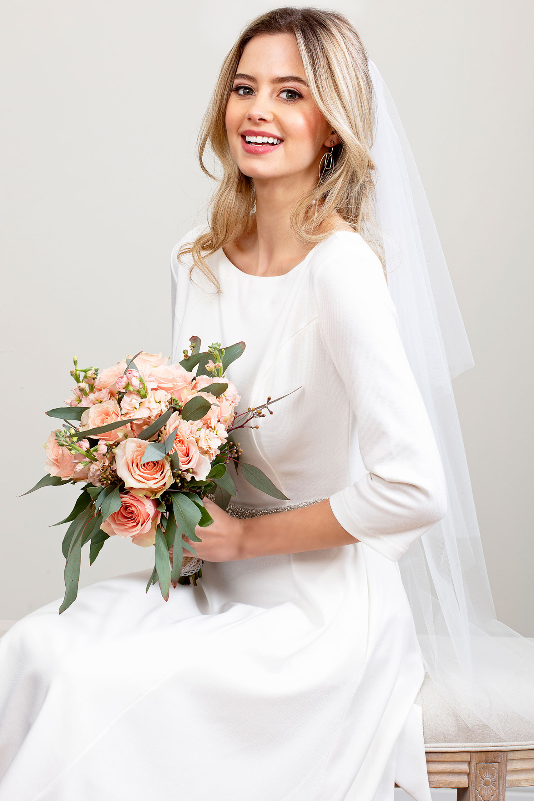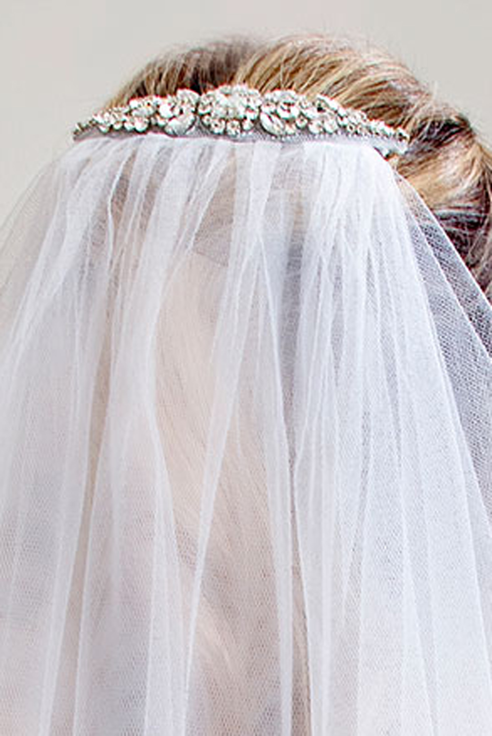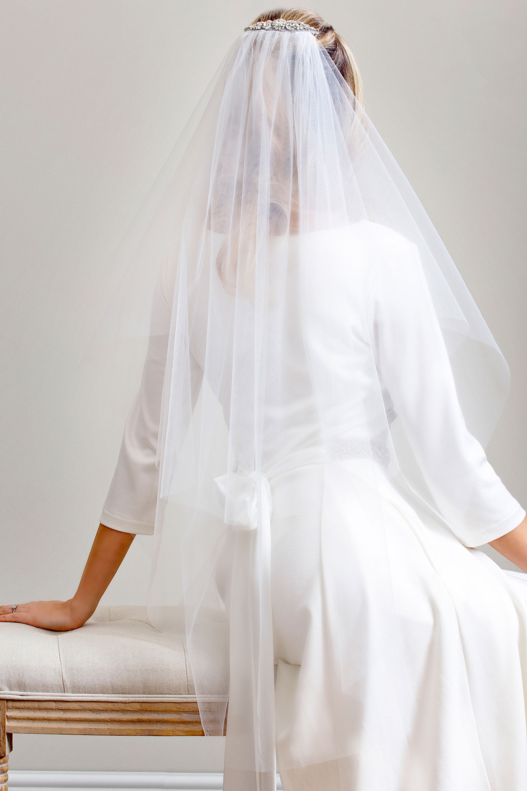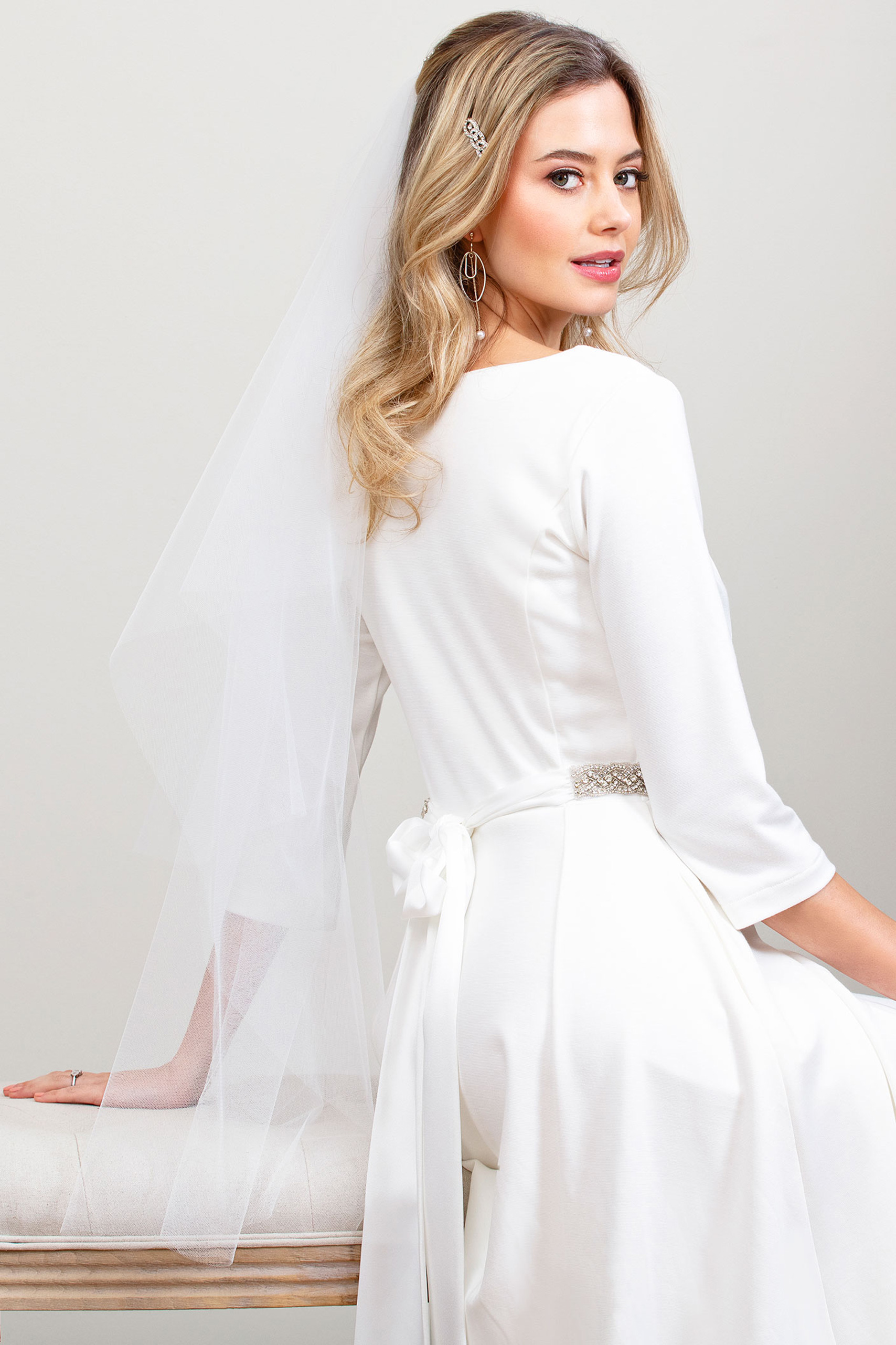 Zweistufiger Schleier mit Schnittkante aus weichem Tüll in Elfenbeinweiß und mit funkelndem Schmuckstein-Haarkamm. Die Schleierlänge beträgt vom Kamm bis zum Saum ca. 92cm, sodass er etwa in Höhe deiner Fingerspitzen endet. Ein wunderbar eleganter, zeitloser Brautschleier, der deinem Umstandsbrautkleid ein glamouröses Finish verleiht. Farbe: elfenbein