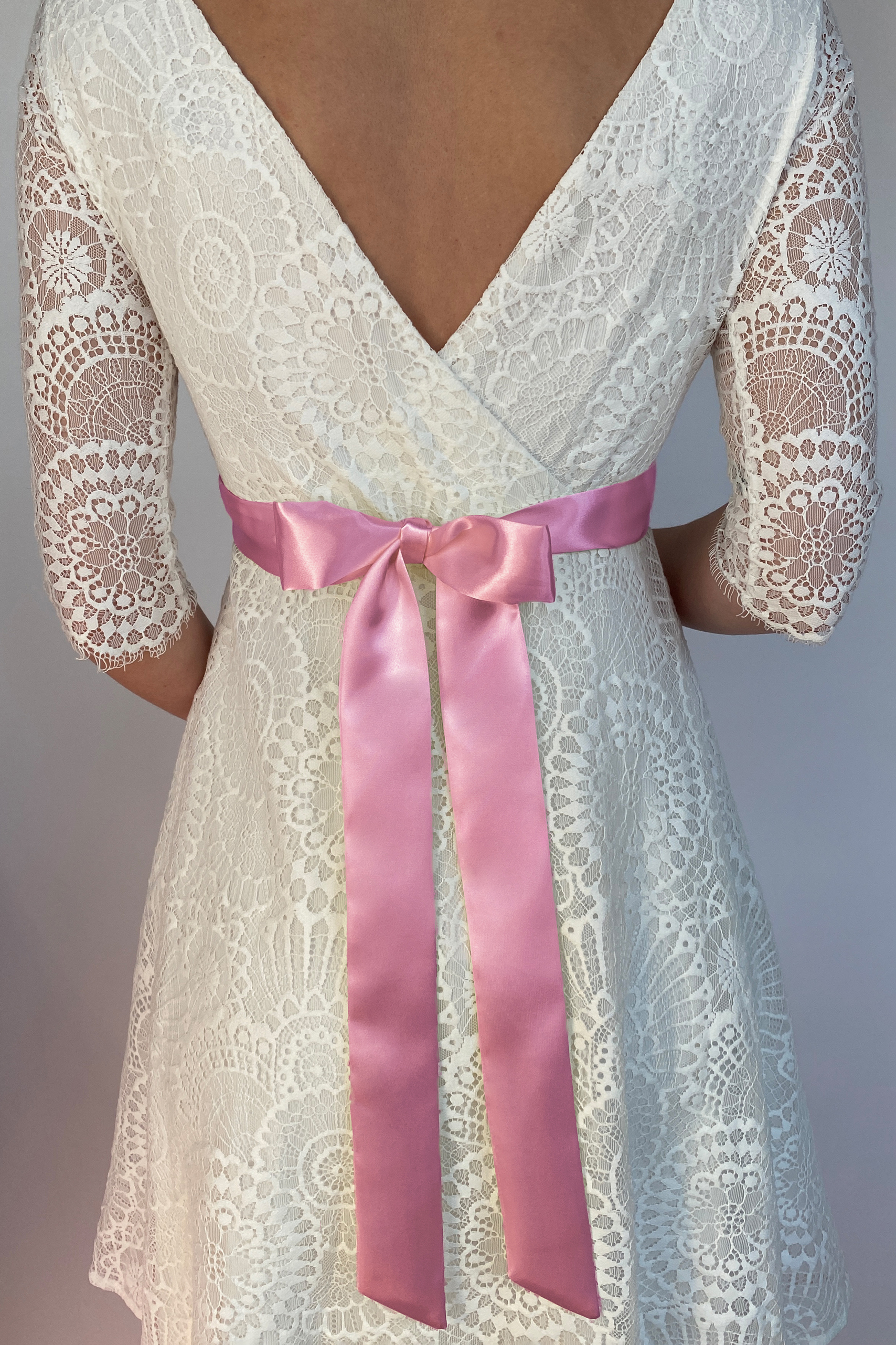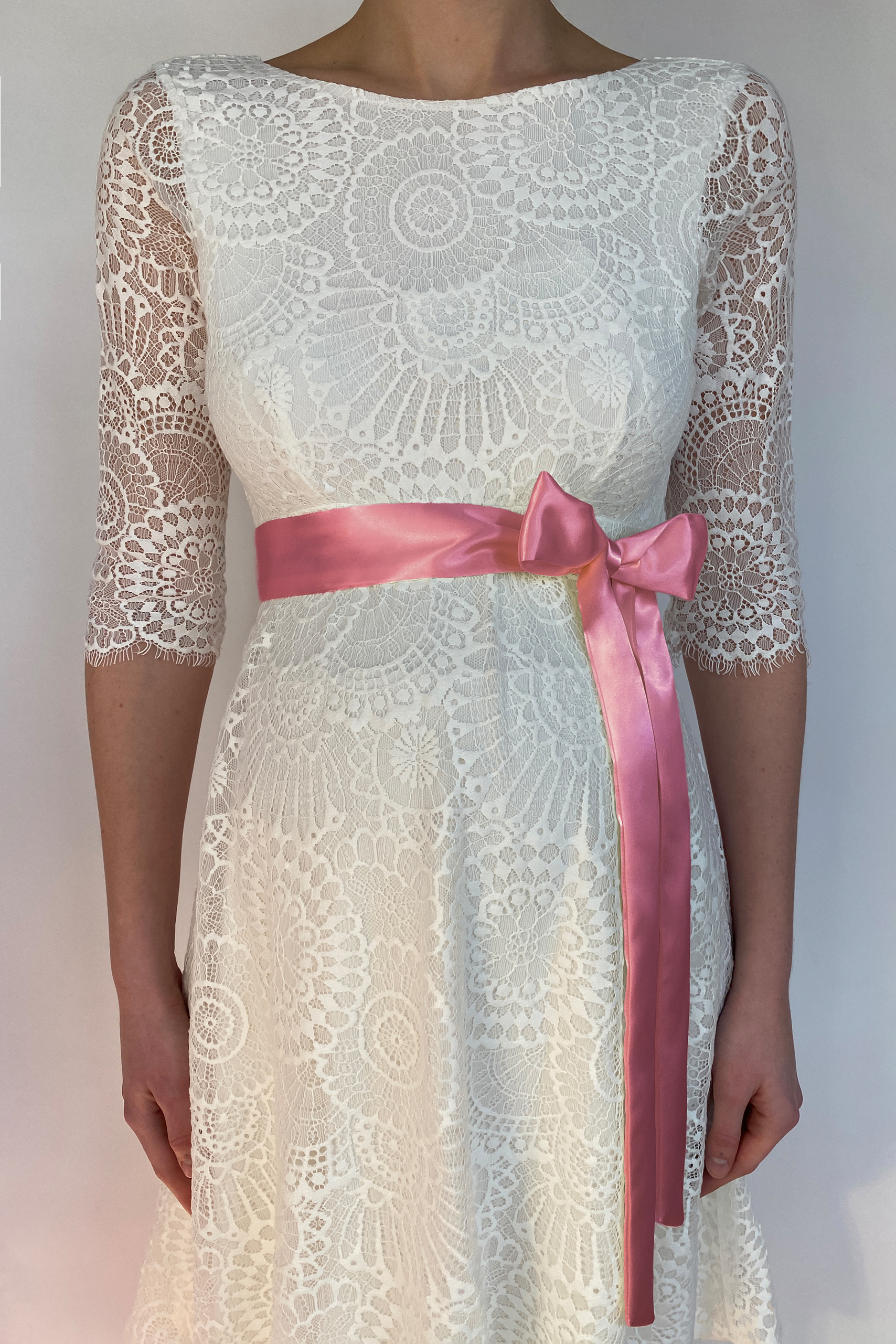 Unser Model trägt die Satinschärpe zu unserem A-Linie Umstandsbrautkleid mit Rückenausschnitt