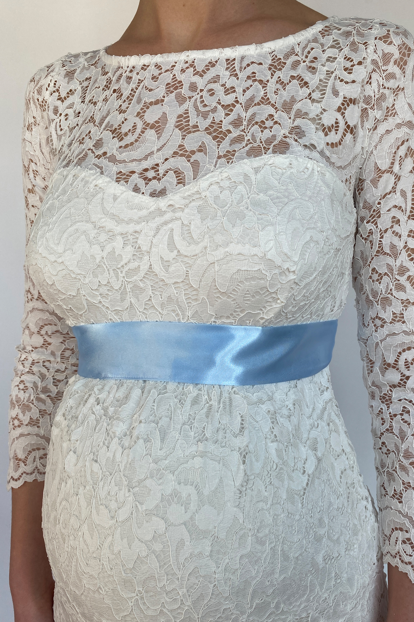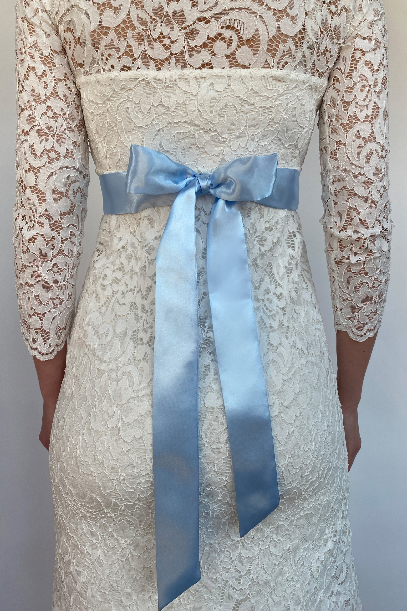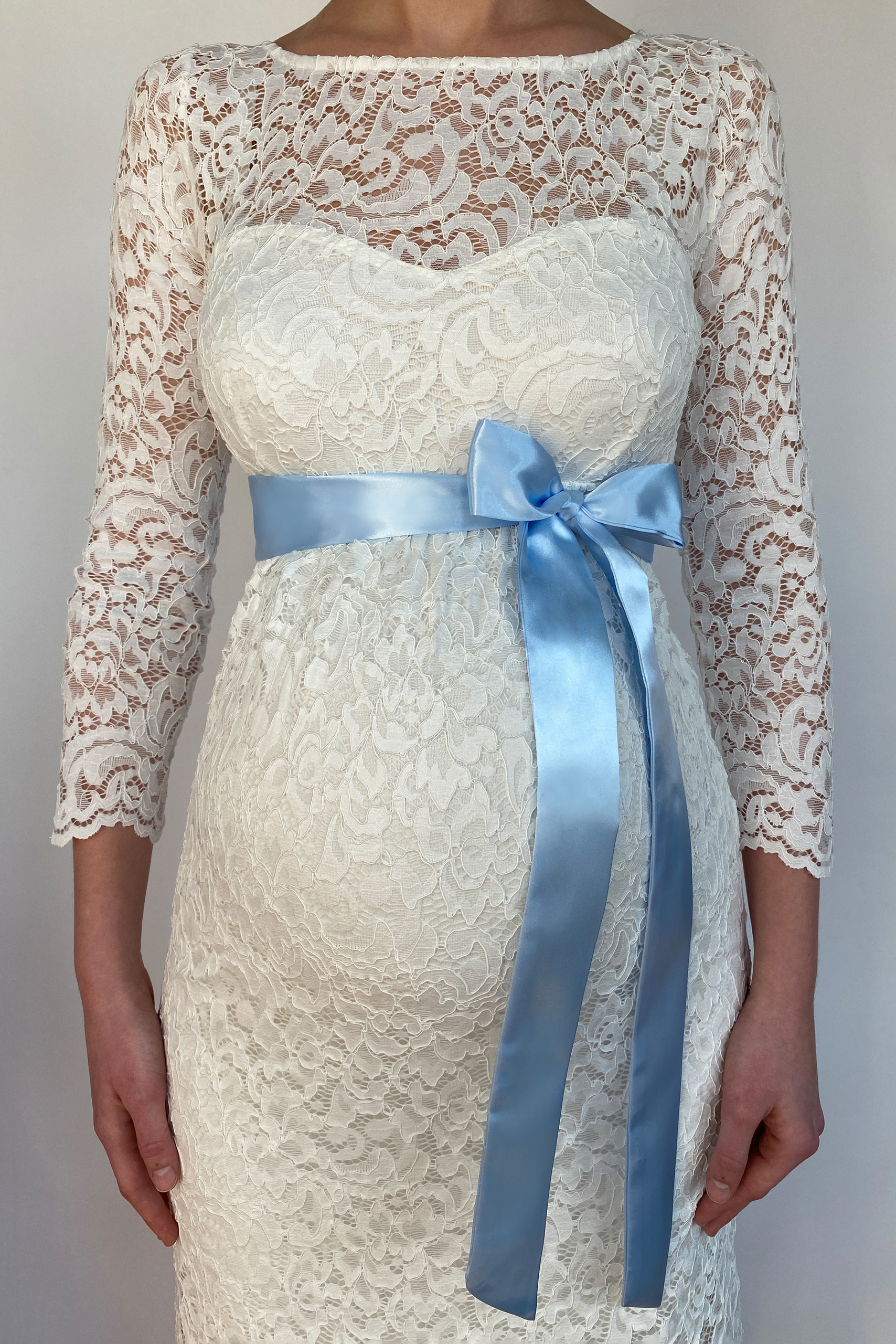 Unser Model trägt die Satinschärpe zu unserem Umstandsbrautkleid mit Herz-Dekolleté.