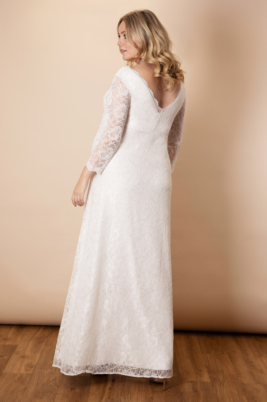 Dieses bodenlange Umstandsbrautkleid aus elfenbeinfarbener Spitze wird über einem stretchigen, super bequemen Unterkleid getragen. Die transparenten Spitzenärmel und der verzierte V-Ausschnitt an der Brust und im Rücken verleihen ihm besondere Eleganz, unser Plus Size Schnitt gibt dir extra Komfort. Farbe: elfenbein