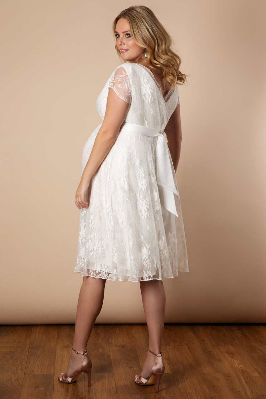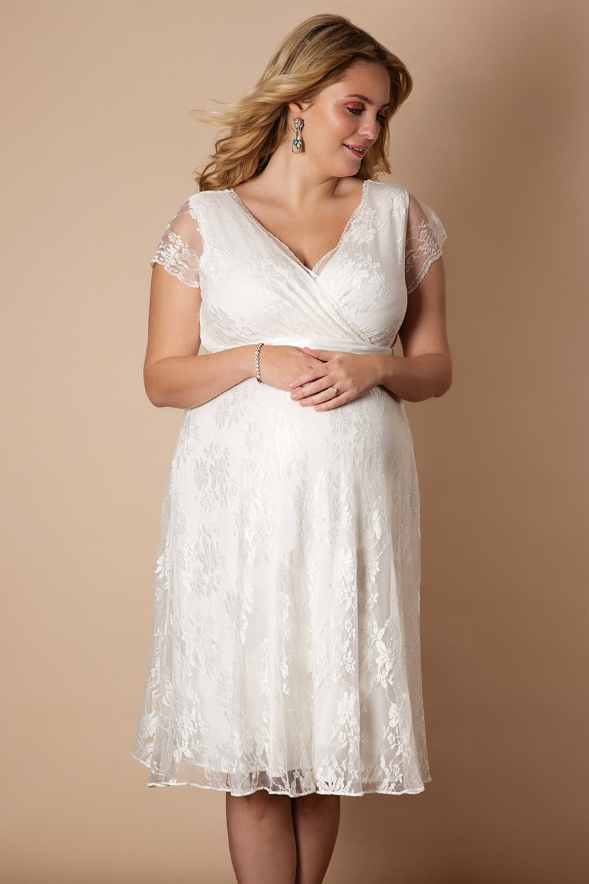 Umstandsbrautkleid in Knielänge aus feiner Spitze mit schwingendem Rockteil und Cache-coeur-Ausschnitt. Die abnehmbare Schärpe betont besonders schön deine Empire-Linie, der Plus Size Schnitt gibt dir den nötigen Komfort. Pflegehinweis: nicht maschinenwaschbar, bitte in der Reinigung reinigen. Farbe: elfenbein