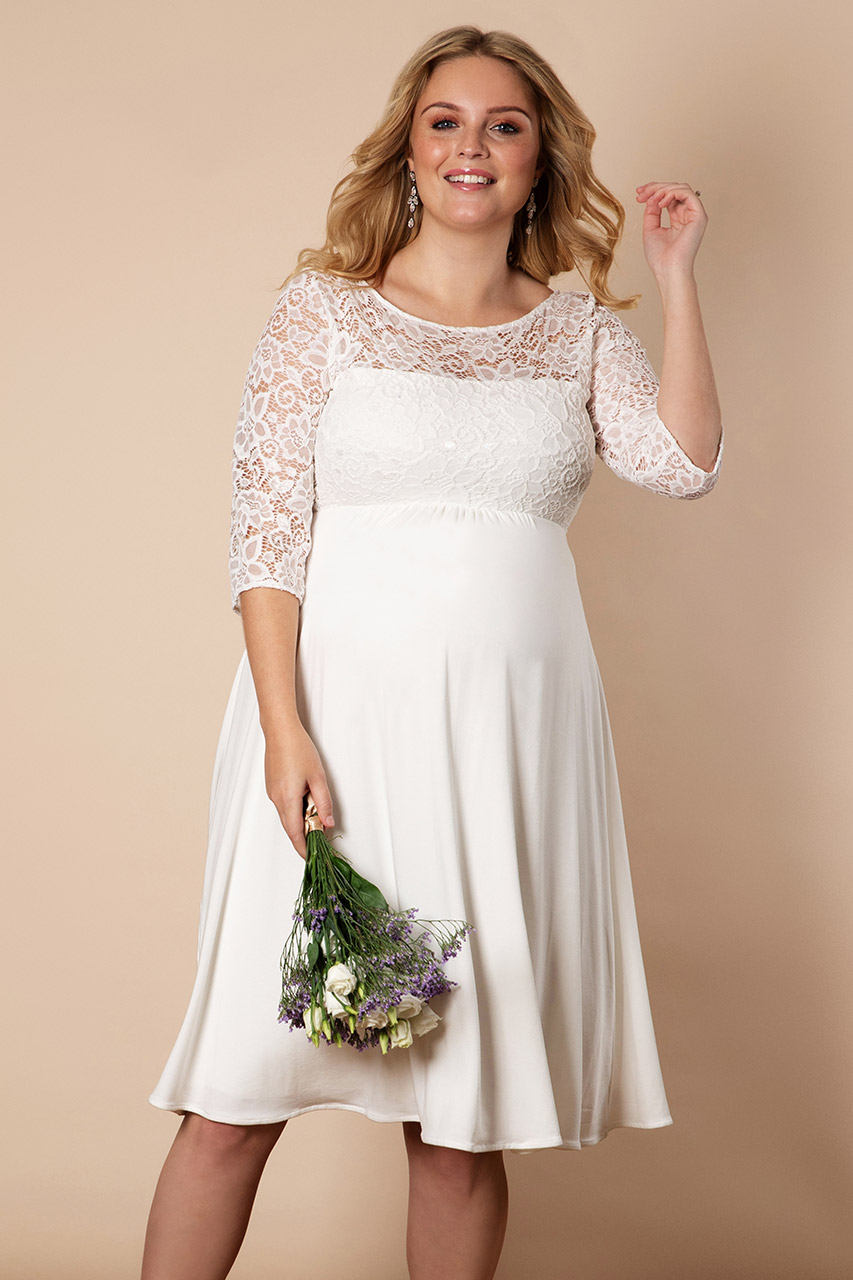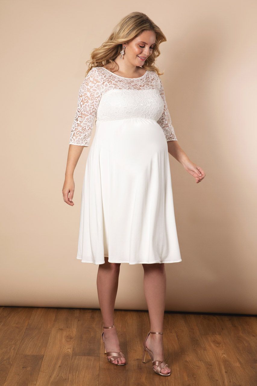 Dieses knielange Umstandsbrautkleid mit tiefem V-Ausschnitt im Rücken und transparenten 3/4 Ärmeln aus Spitze trägt sich besonders leicht und bequem. Die abnehmbare Schärpe formt eine schöne Empire-Linie, der Plus Size Schnitt gibt dir extra Tragekomfort. Farbe: elfenbein