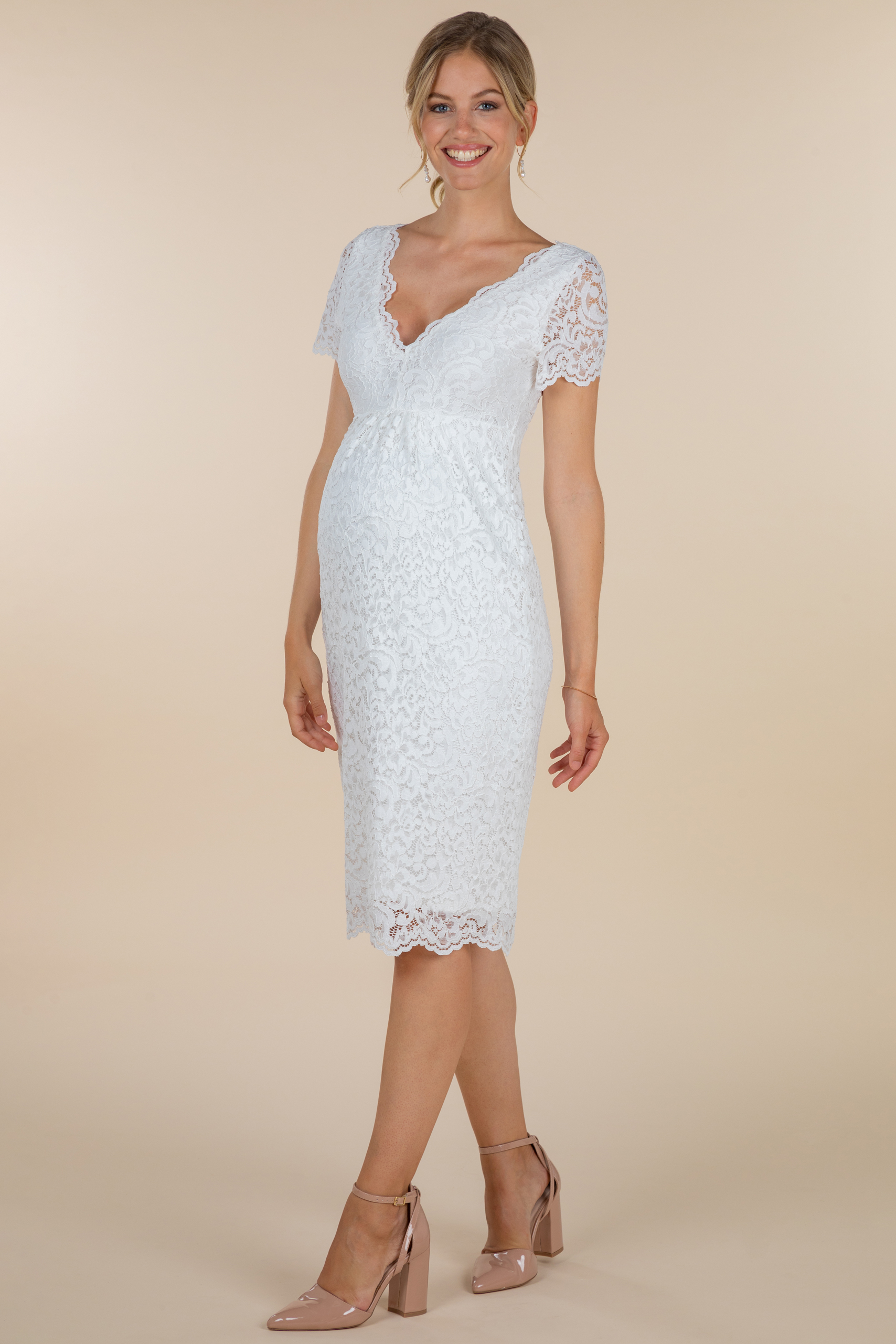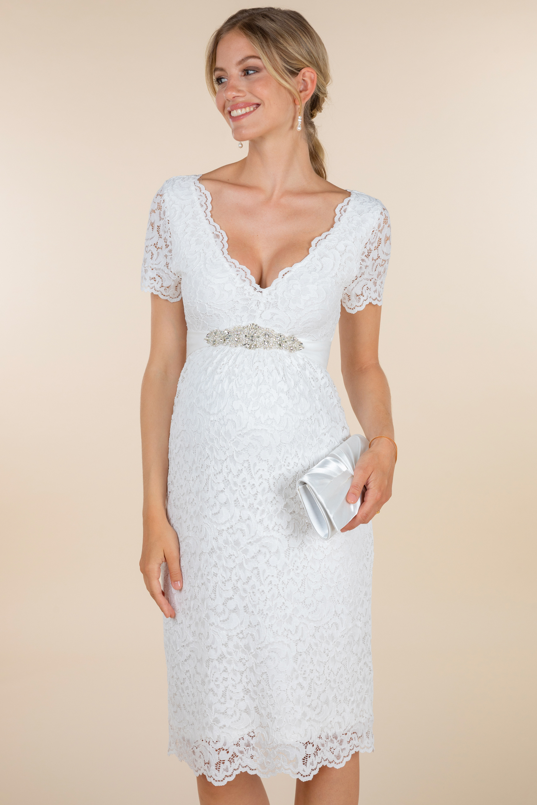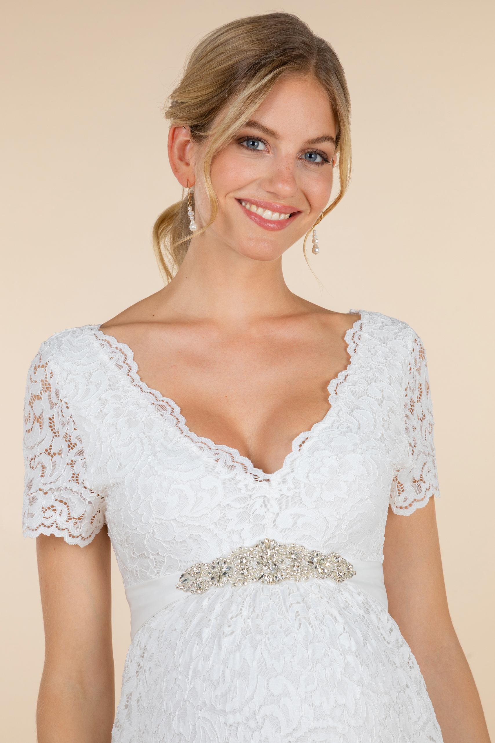 V-Neck Umstandsbrautkleid mit Rückenausschnitt und kurzen Ärmeln aus flexiblen Material. Der weiche, elastische Stoff des knielangen Brautkleides lässt deinem Babybauch genug Spielraum, ohne dich dabei einzuengen. Die Besonderheit des Kleides ist die durchgängige, wunderschöne Spitze, welche dir einen charmanten und femininen Look verleiht. Zudem sorgen Details wie der Ausschnitt am Rücken für einen extra Hingucker. Durch die abnehmbare Satinschärpe in elfenbein (im Lieferumfang enthalten) wird deine Empire-Linie betont und du erhältst eine wunderschöne Silhouette.Farbe: elfenbein