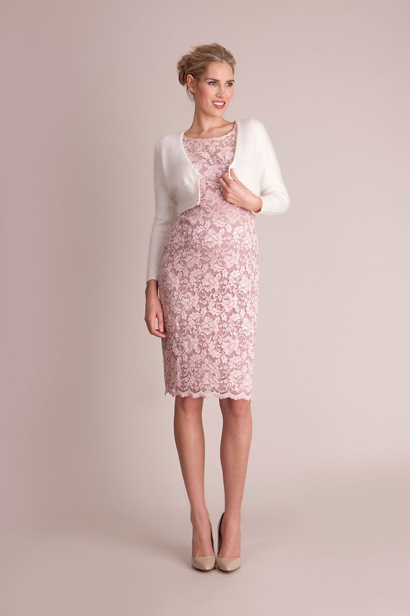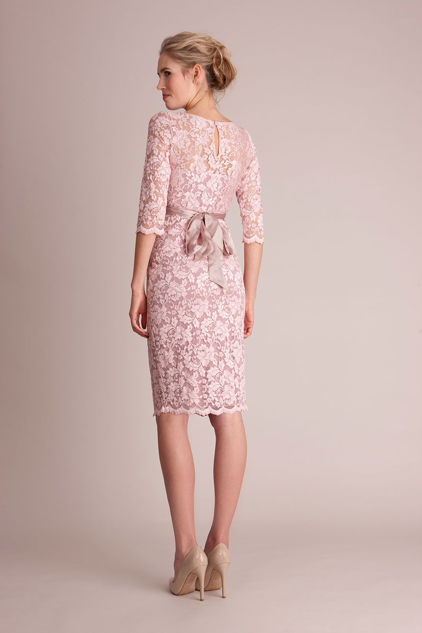 Umstandsbrautkleid mit elegantem Rundhalsausschnitt und kleinem Keyhole-Detail am Rücken. Aus wunderschöner Spitze mit elastischem Unterkleid. Die abnehmbare Satinschärpe zur Betonung der Empire Linie kann entweder vorne oder hinten gebunden werden.