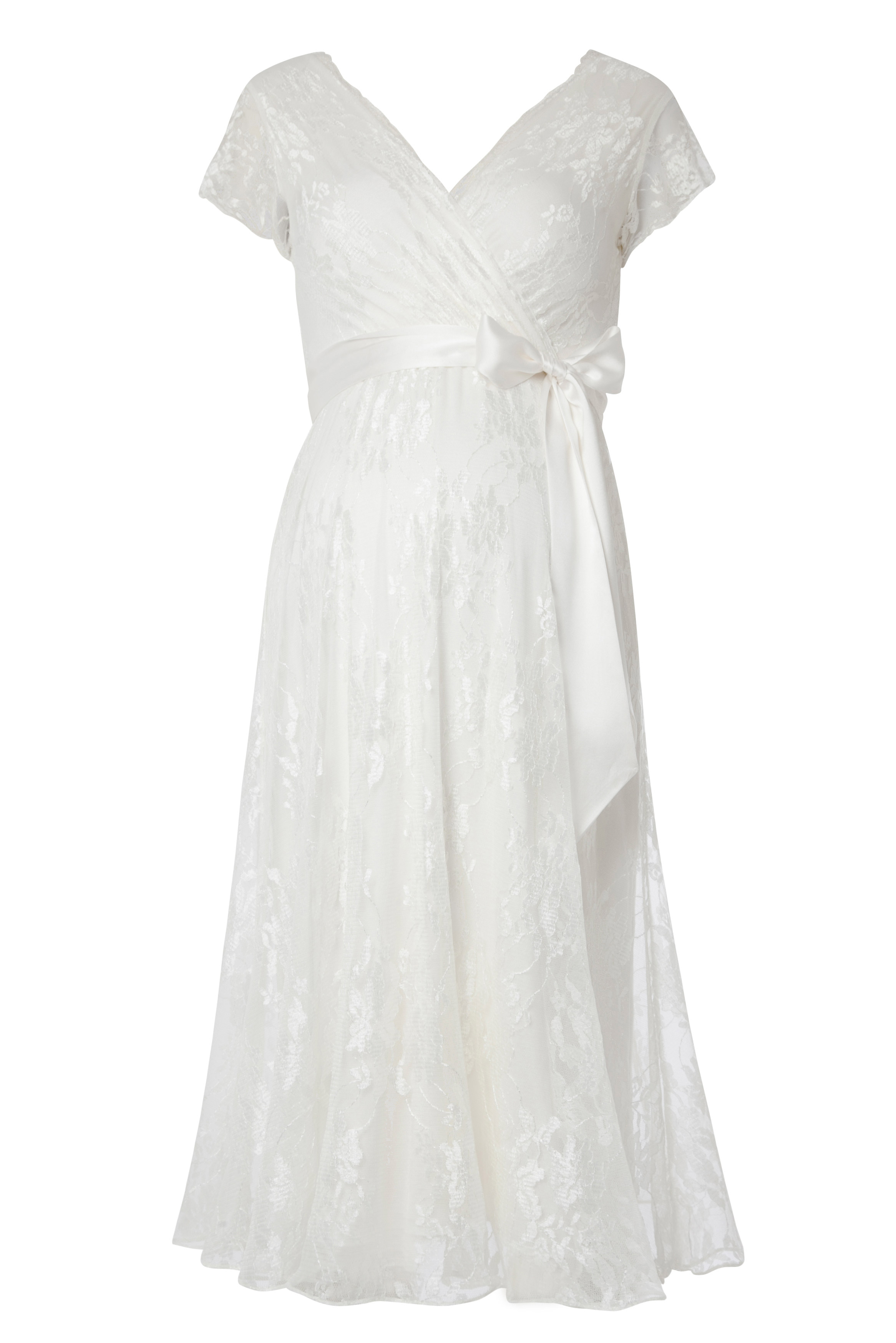 Umstandsbrautkleid aus feinster Spitze mit schwingendem Rockteil und Cache-Coeur-Ausschnitt. Kommt mit einer abnehmbaren Schärpe und besitzt transparente Ärmel. Farbe: elfenbein