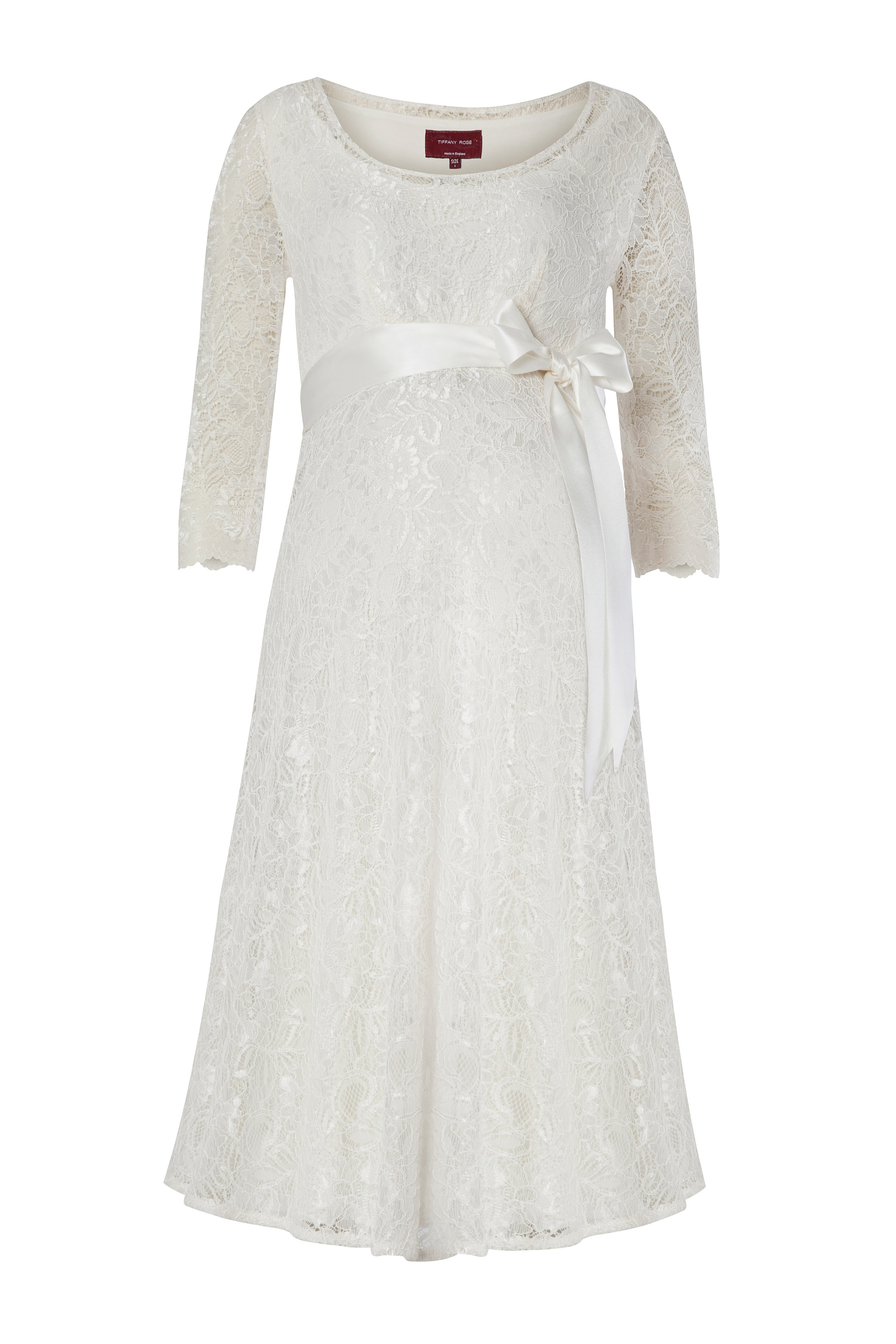 Knielanges Umstandsbrautkleid aus edler Spitze mit schwingendem Rockteil und transparenten 3/4 Ärmeln. Die abnehmbare Satin-Schärpe betont deine Empire-Linie besonders schön. Farbe: elfenbein