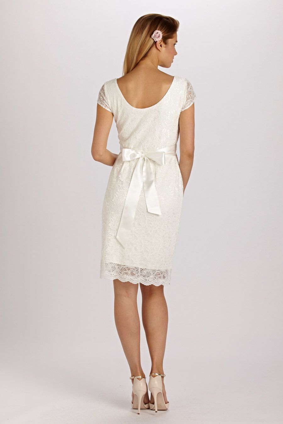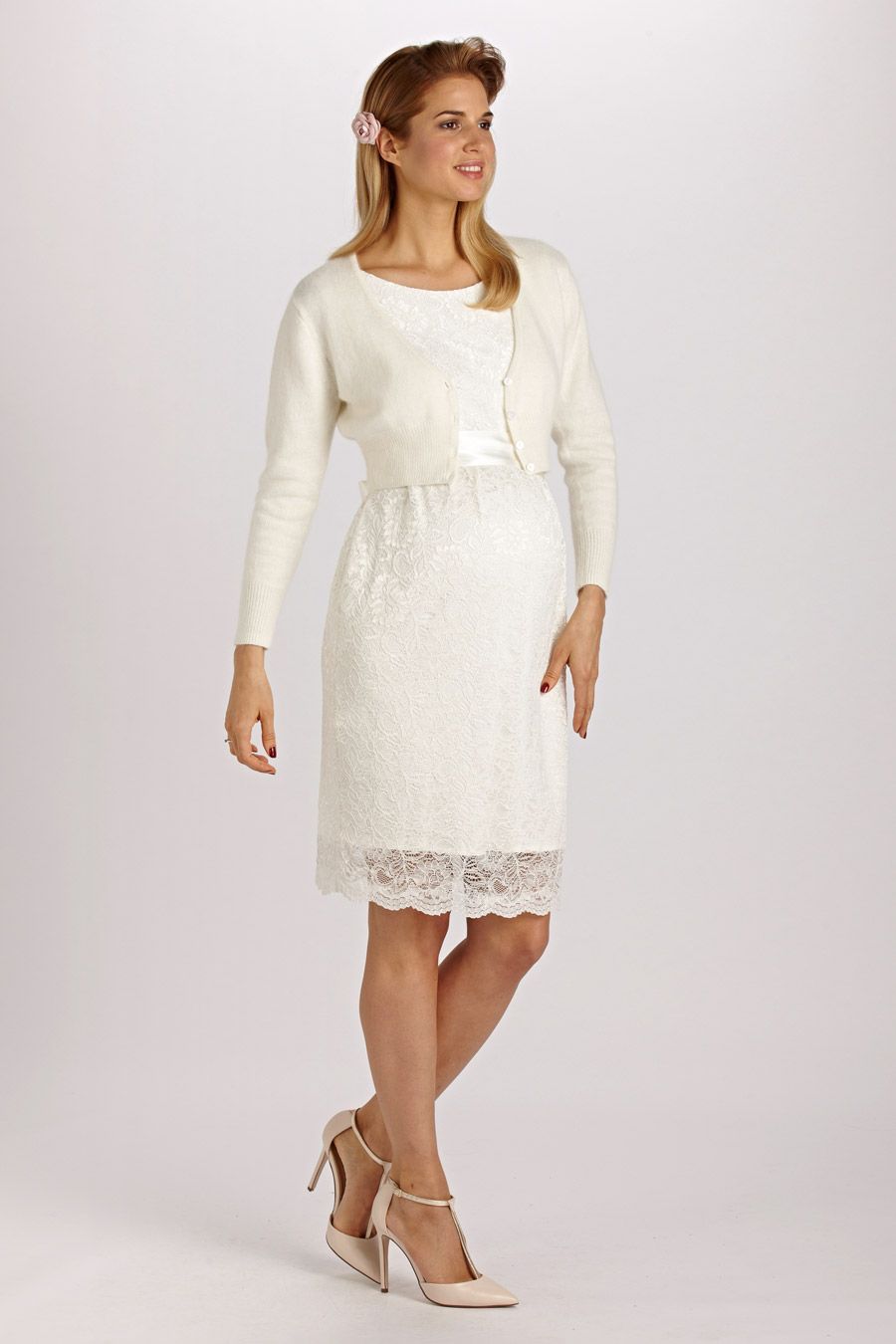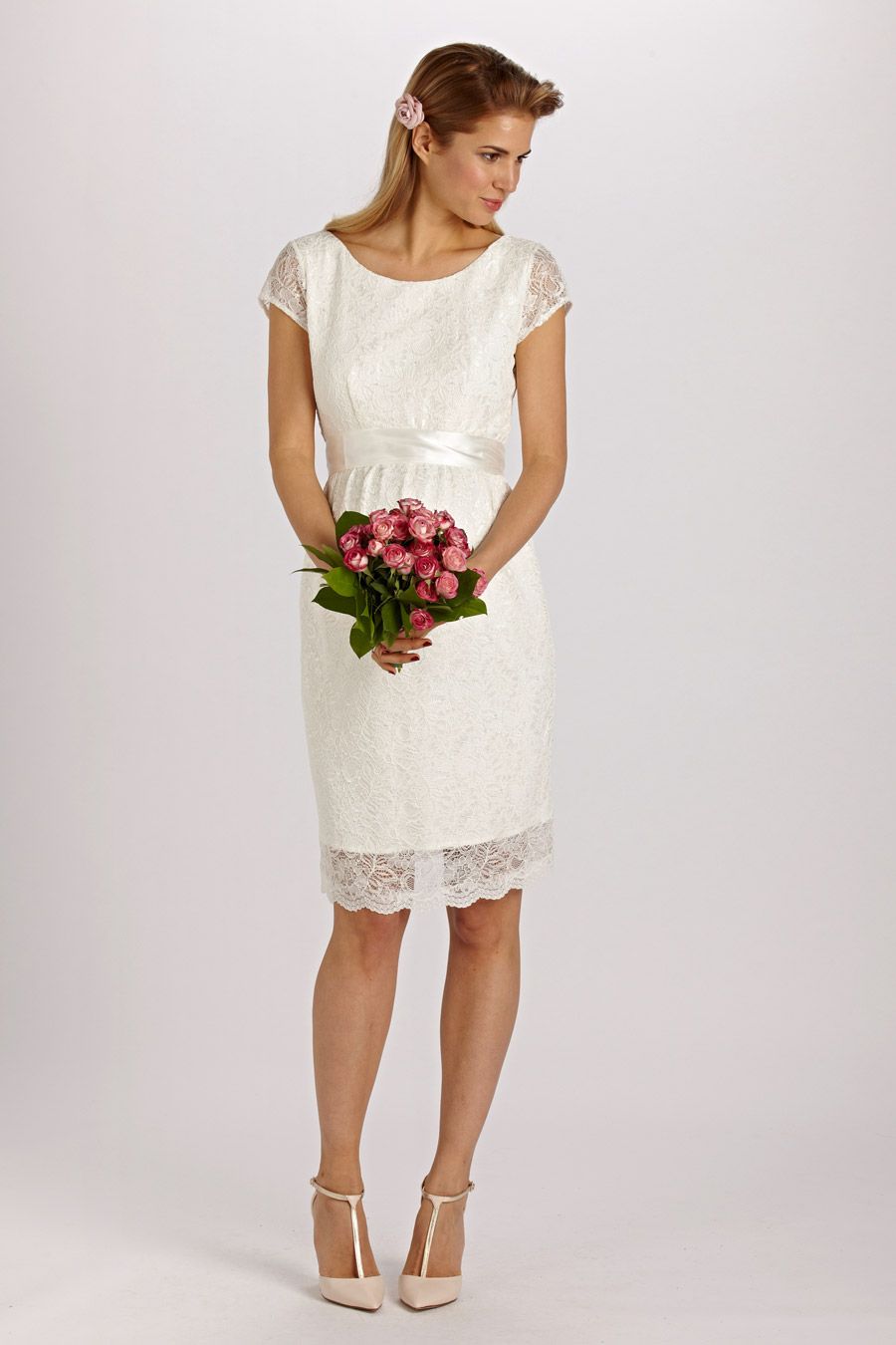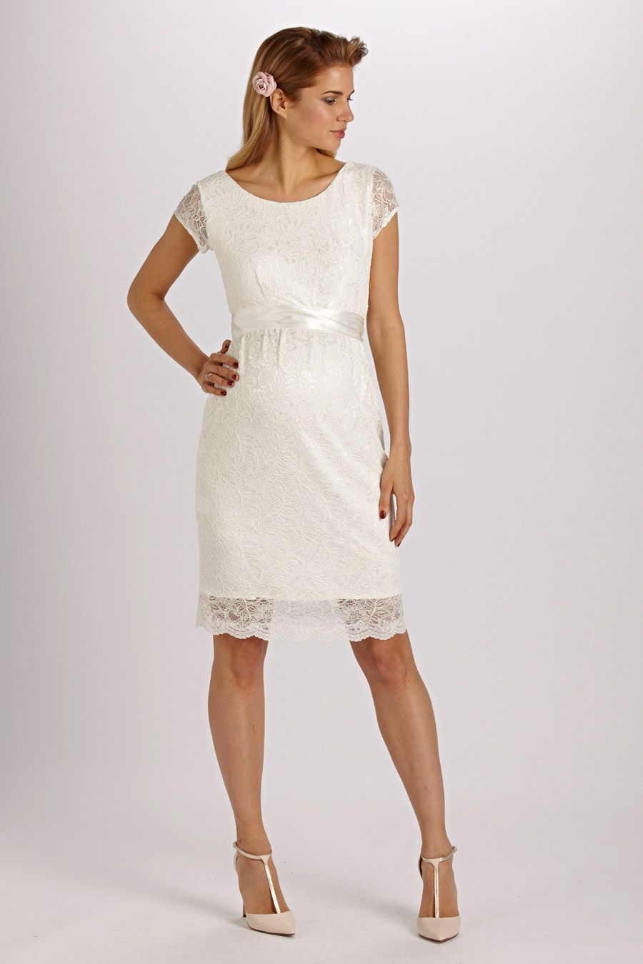 Kurz geschnittenes Umstandsbrautkleid mit feiner Spitze und transparenten Ärmeln. Kann mit einer Schärpe zur Betonung der Empire-Linie getragen werden. Die Schärpe ist nicht im Lieferumfang enthalten.