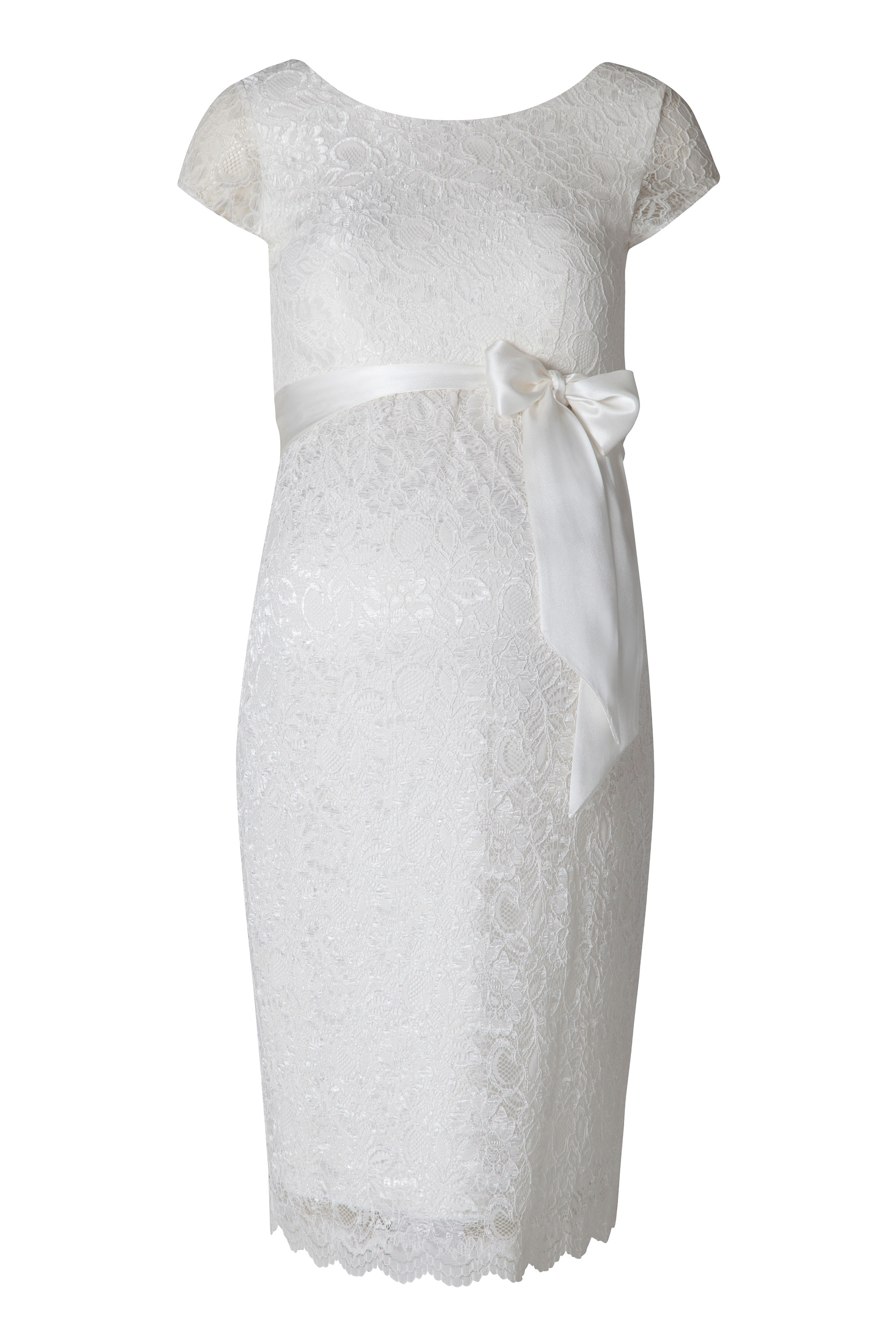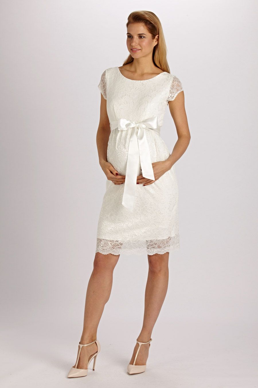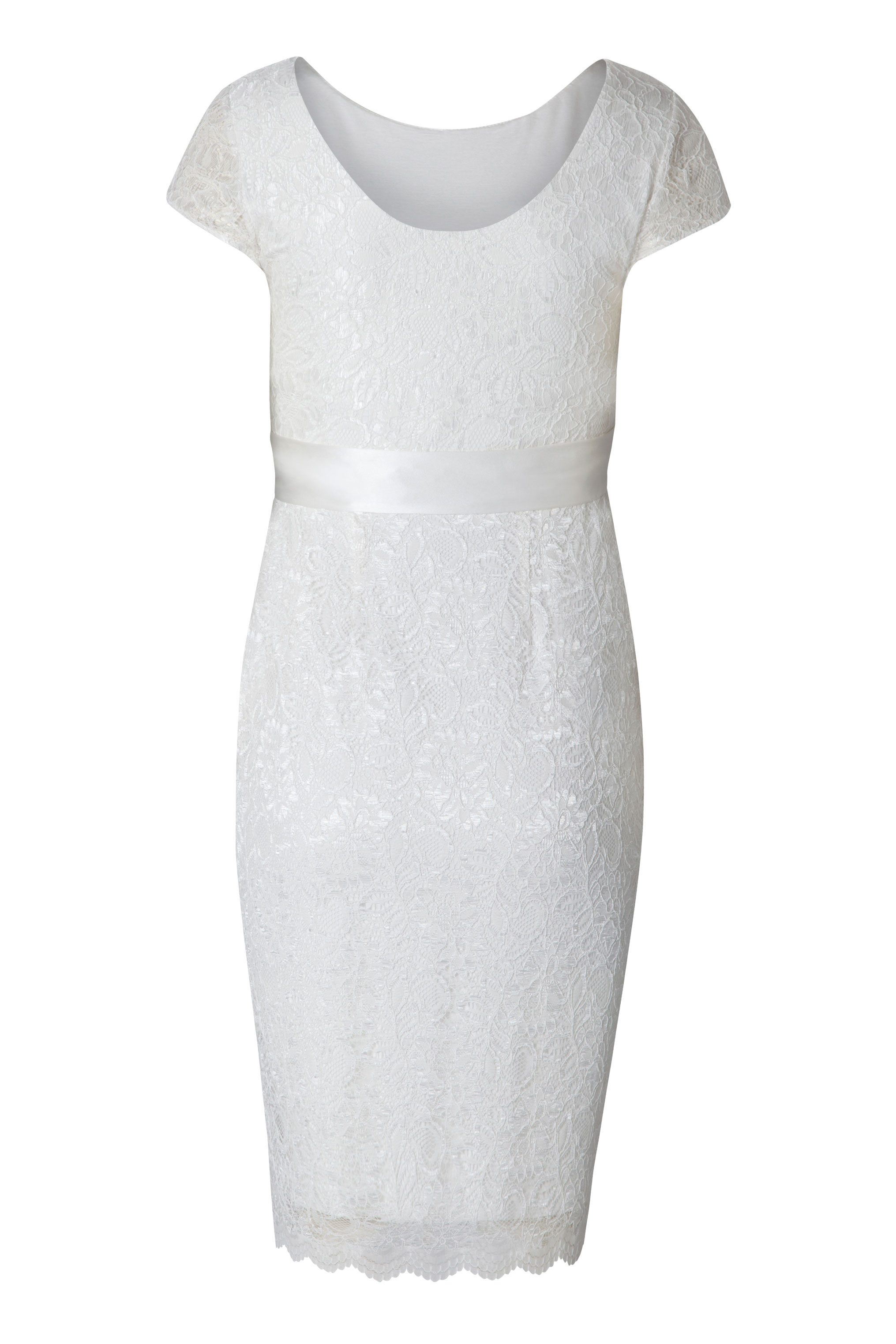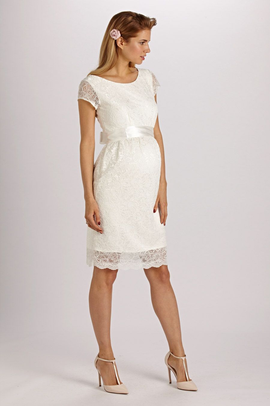Kurz geschnittenes Umstandsbrautkleid mit feiner Spitze und transparenten Ärmeln. Kann mit einer Schärpe zur Betonung der Empire-Linie getragen werden. Die Schärpe ist nicht im Lieferumfang enthalten.
