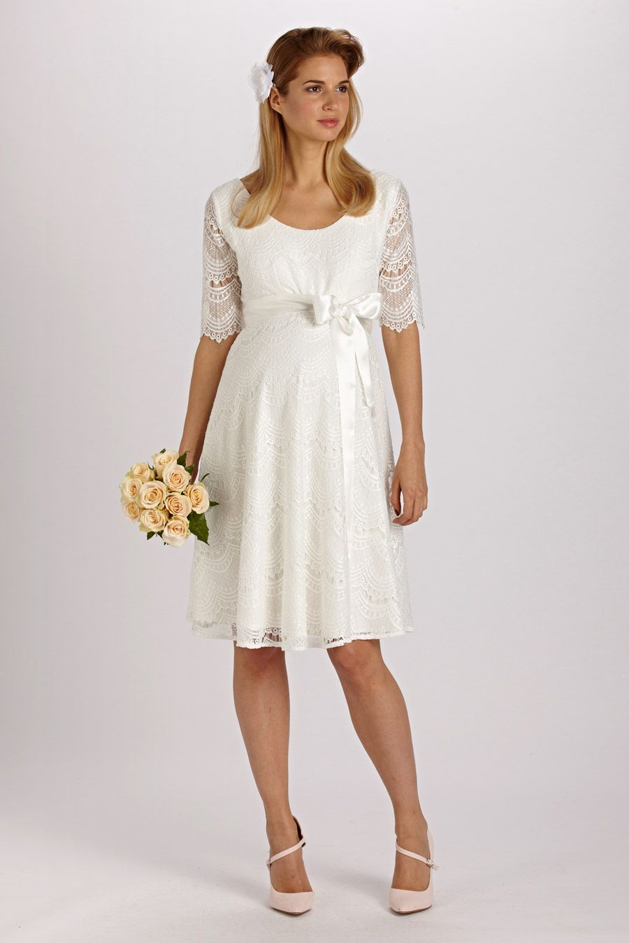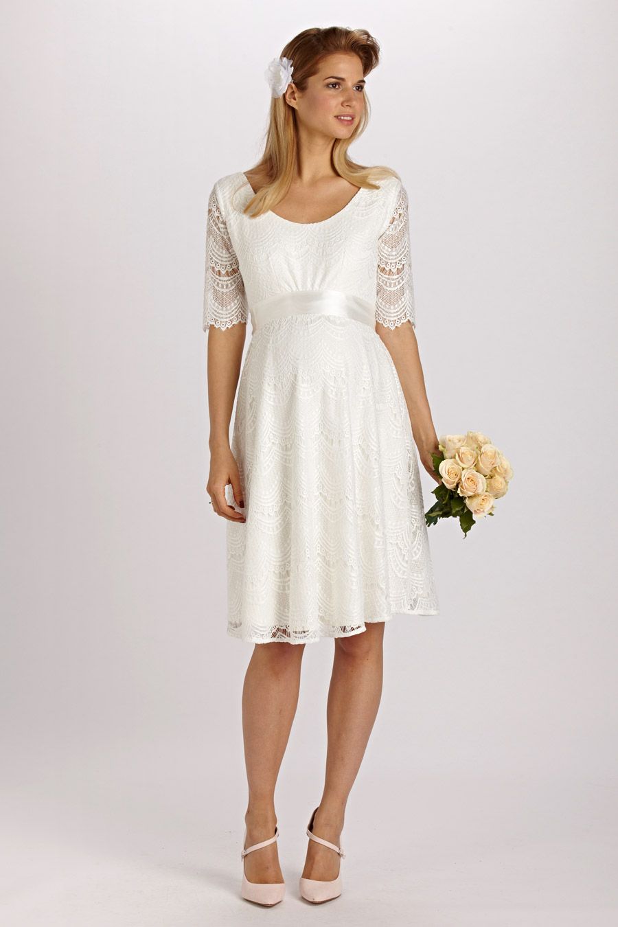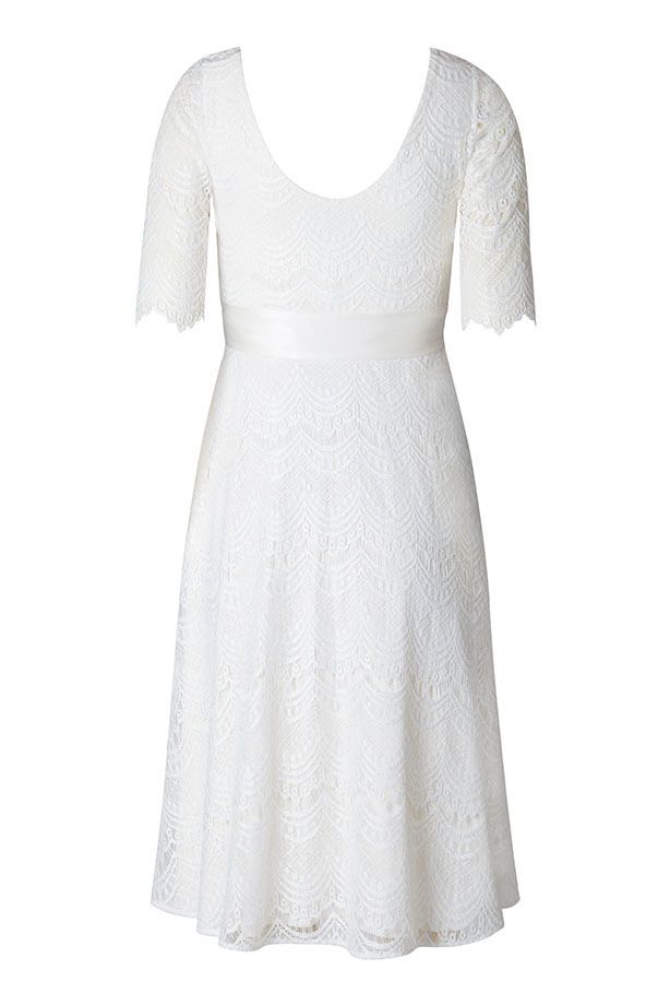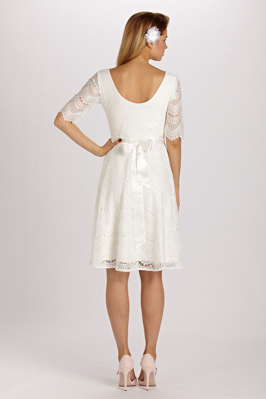 Knielanges Umstandsbrautkleid aus weicher Spitze und Muschelsaum mit 3/4 langen Ärmeln und großzügigem Rundhalsausschnitt vorne und hinten. Der schwingende Rockteil fällt wunderschön über deinen Babybauch, egal in welcher Schwangerschaftswoche du heiratest. Die abgebildete Schärpe ist nicht im Lieferumfang nicht enthalten, kann aber seperat dazubestellt werden. Farbe: elfenbein.