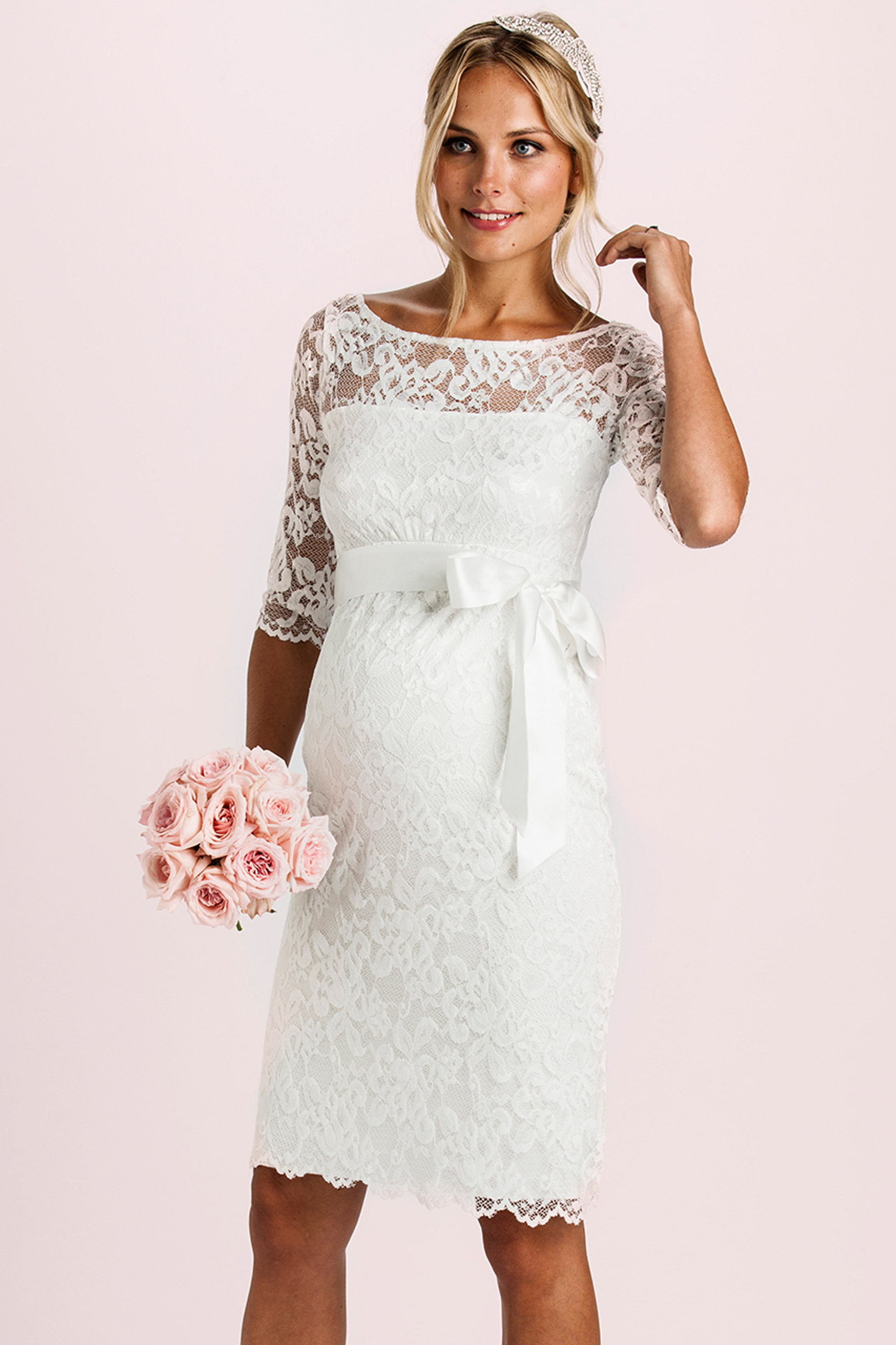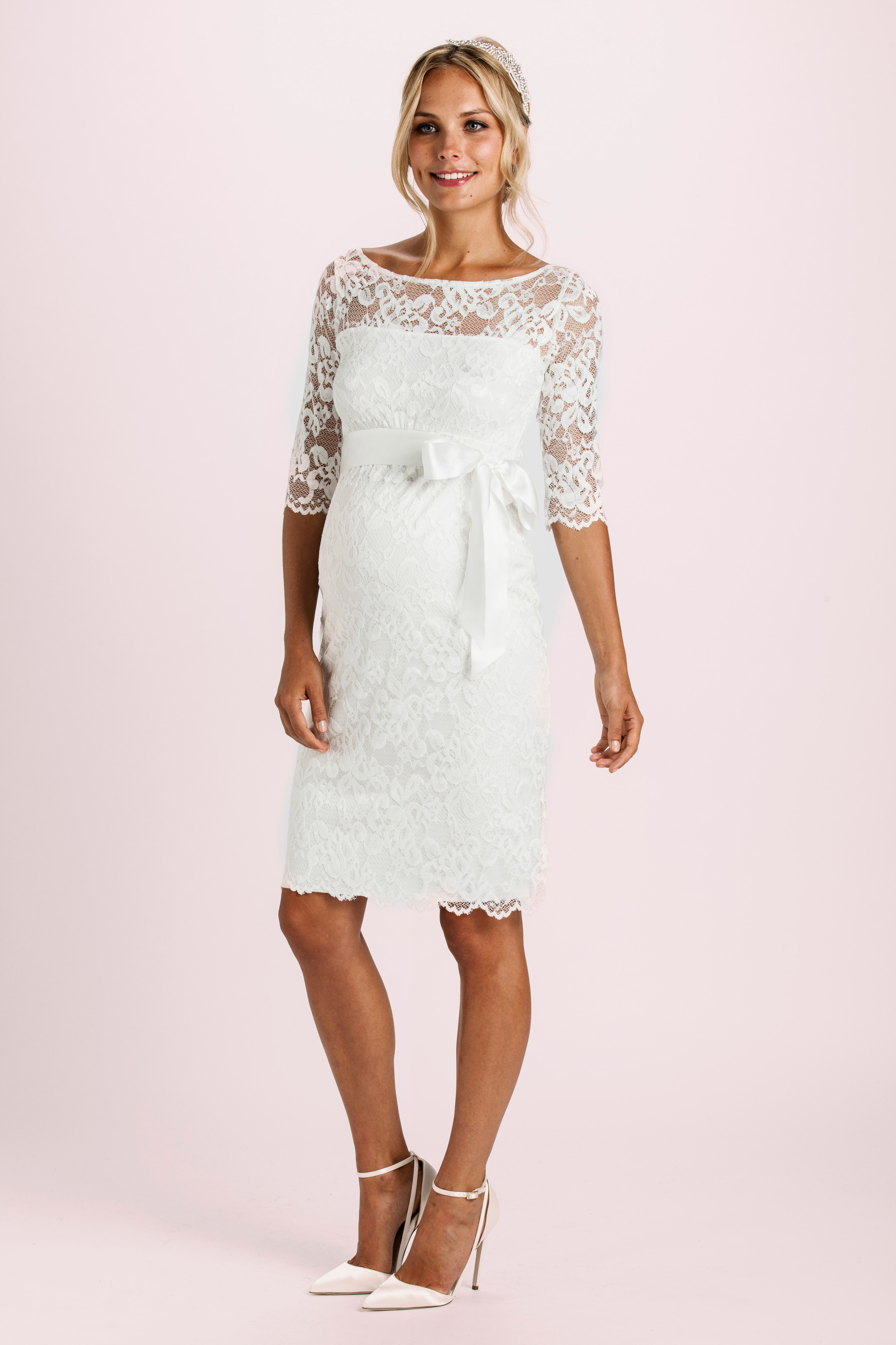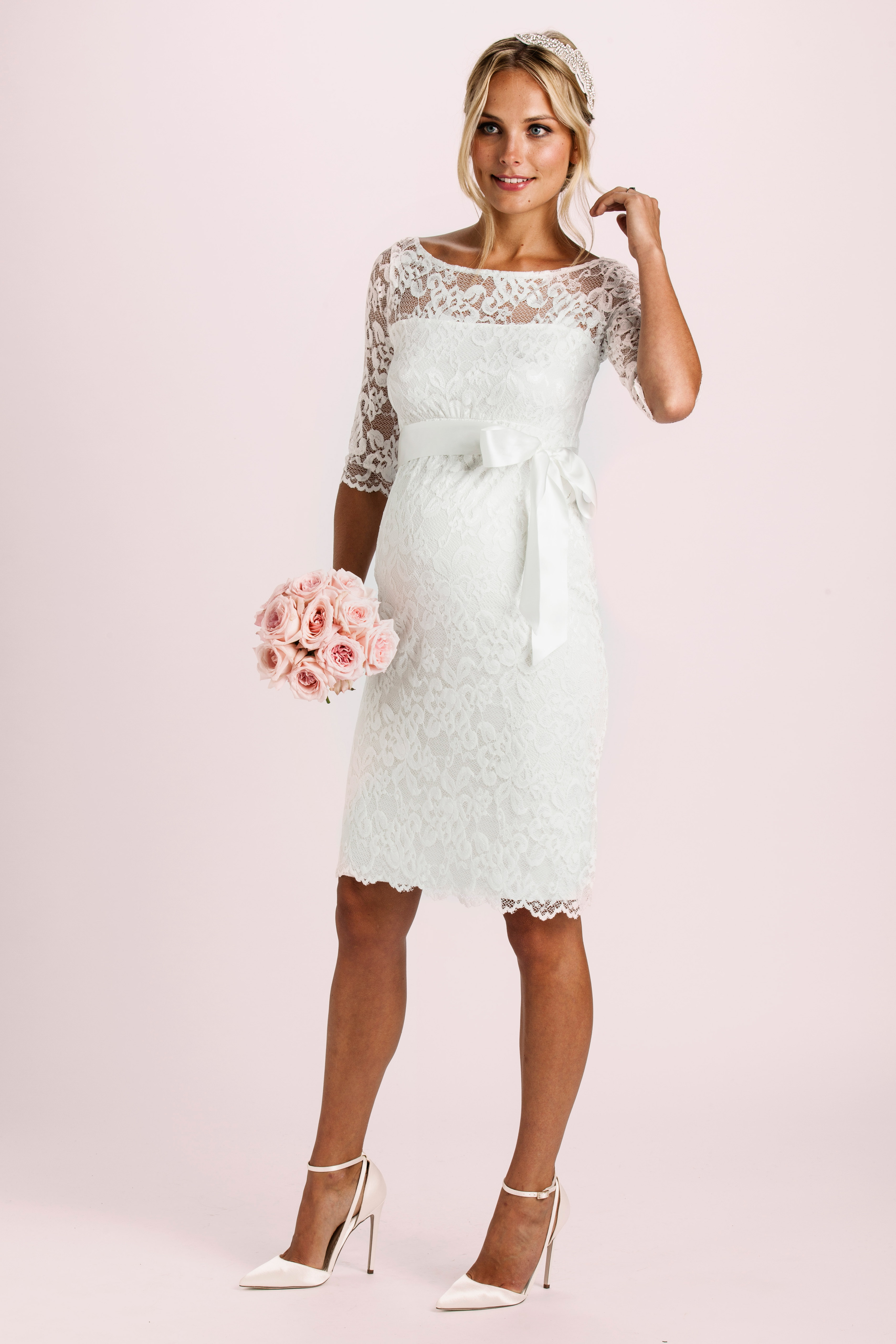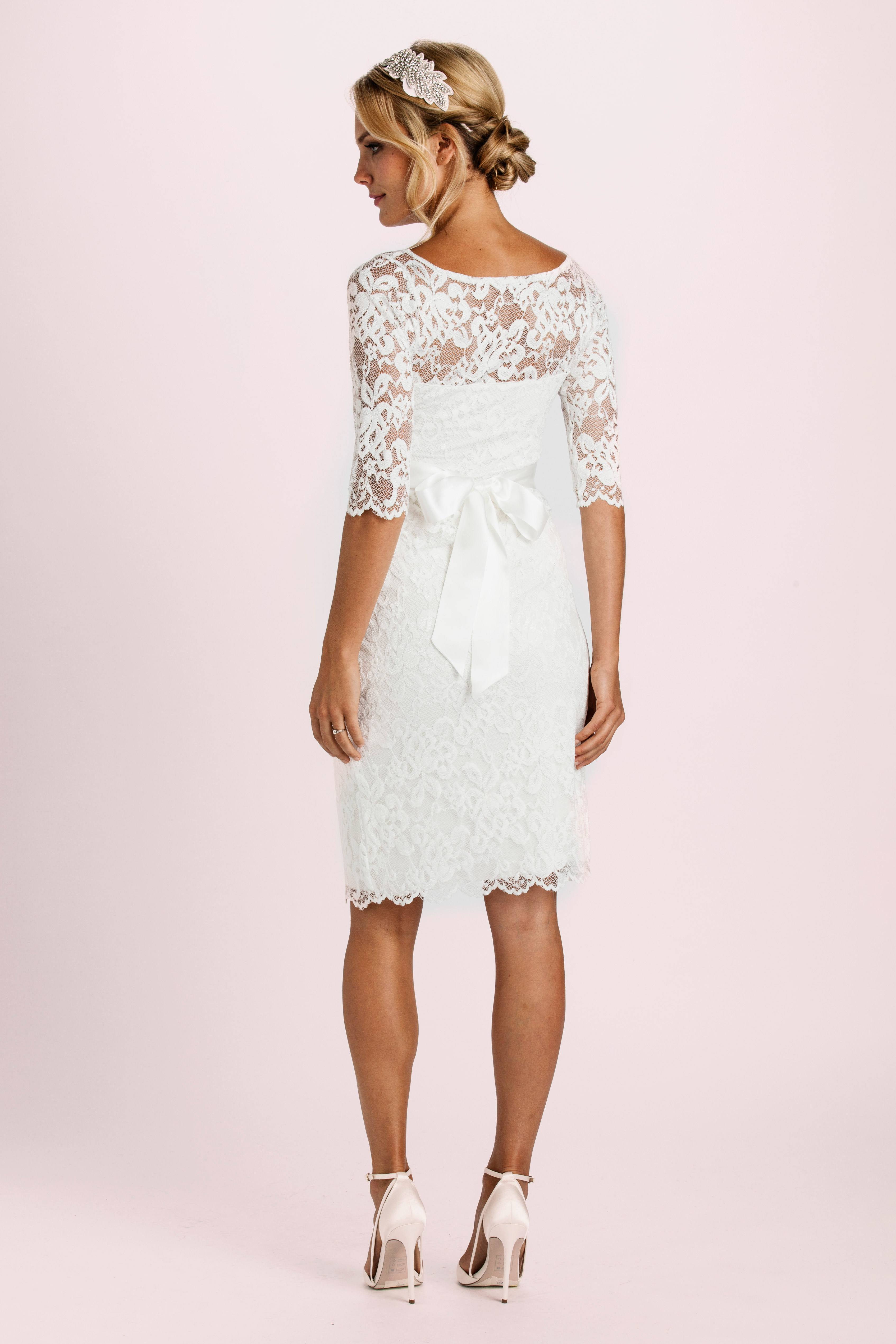 Kurzes Umstandsbrautkleid aus cremefarbener Spitze, das über einem stretchigen, bequemen Unterkleid getragen wird. Mit transparentem Spitzenausschnitt und 3/4 Ärmeln. Die Satinschärpe wird an der Empirelinie gebunden und schafft eine schöne Silhouette. Farbe: elfenbein