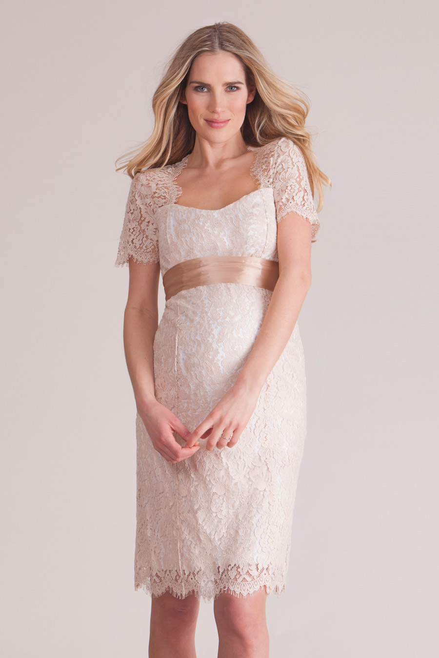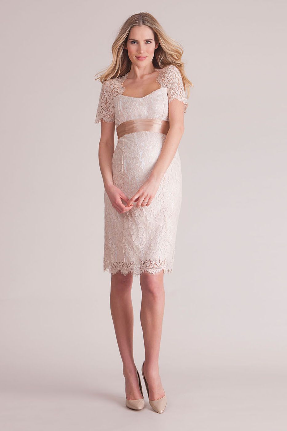 Romantisches Umstandsspitzenkleid mit aufregendem Cut-Out Detail am Rücken und Seiden-Schärpe an der Empire Linie. Farbe: champagner/rosé