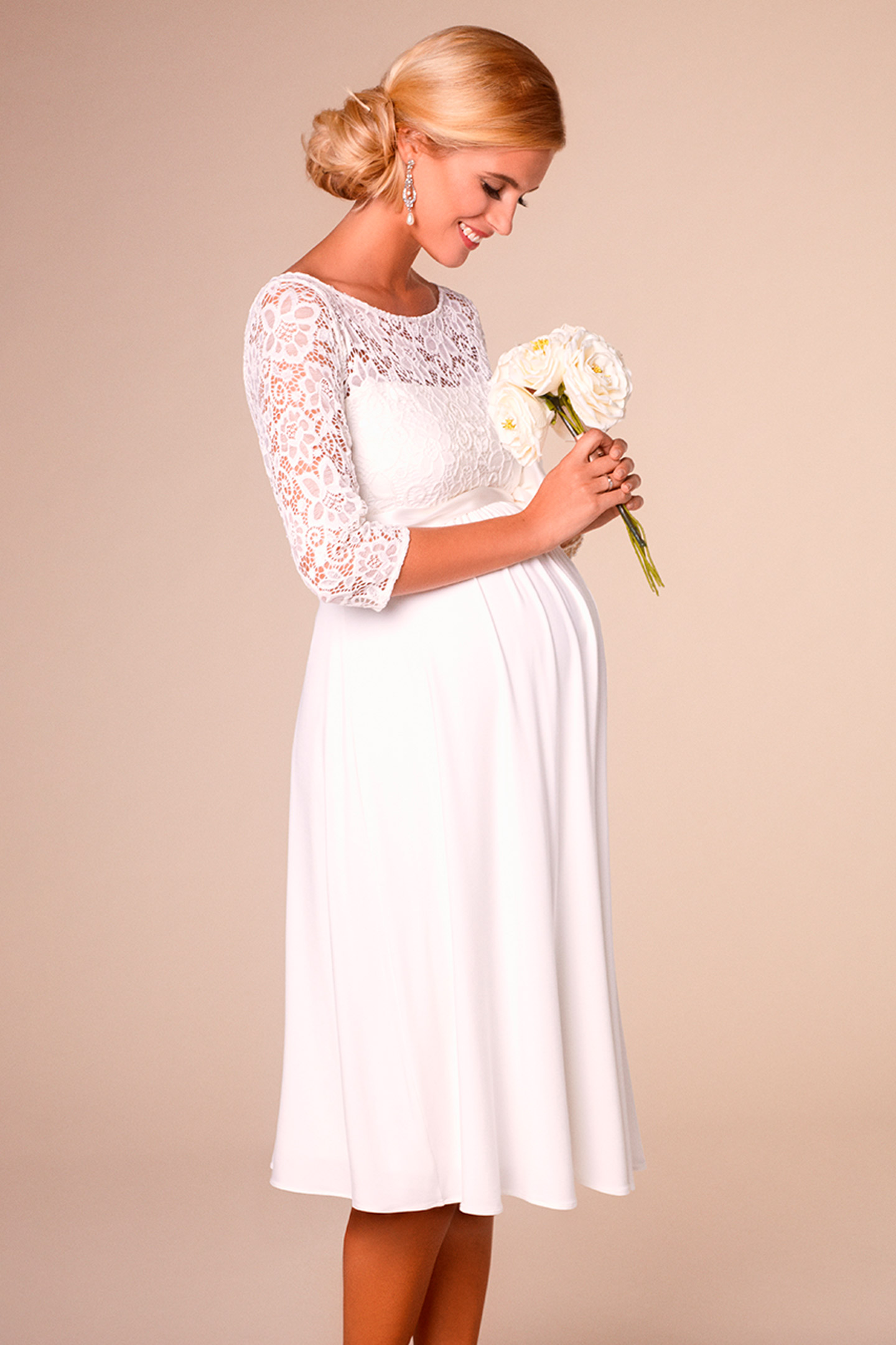 Knielanges Umstandsbrautkleid mit halblangen, transparenten Ärmeln, schwingendem Rock und Rundhalsausschnitt. Bustier und Ärmel sind aus feiner Spitze verarbeitet, die abnehmbare Schärpe betont deine Empire-Linie. Besonders schön: der tiefe V-Ausschnitt am Rücken. Farbe: elfenbein
