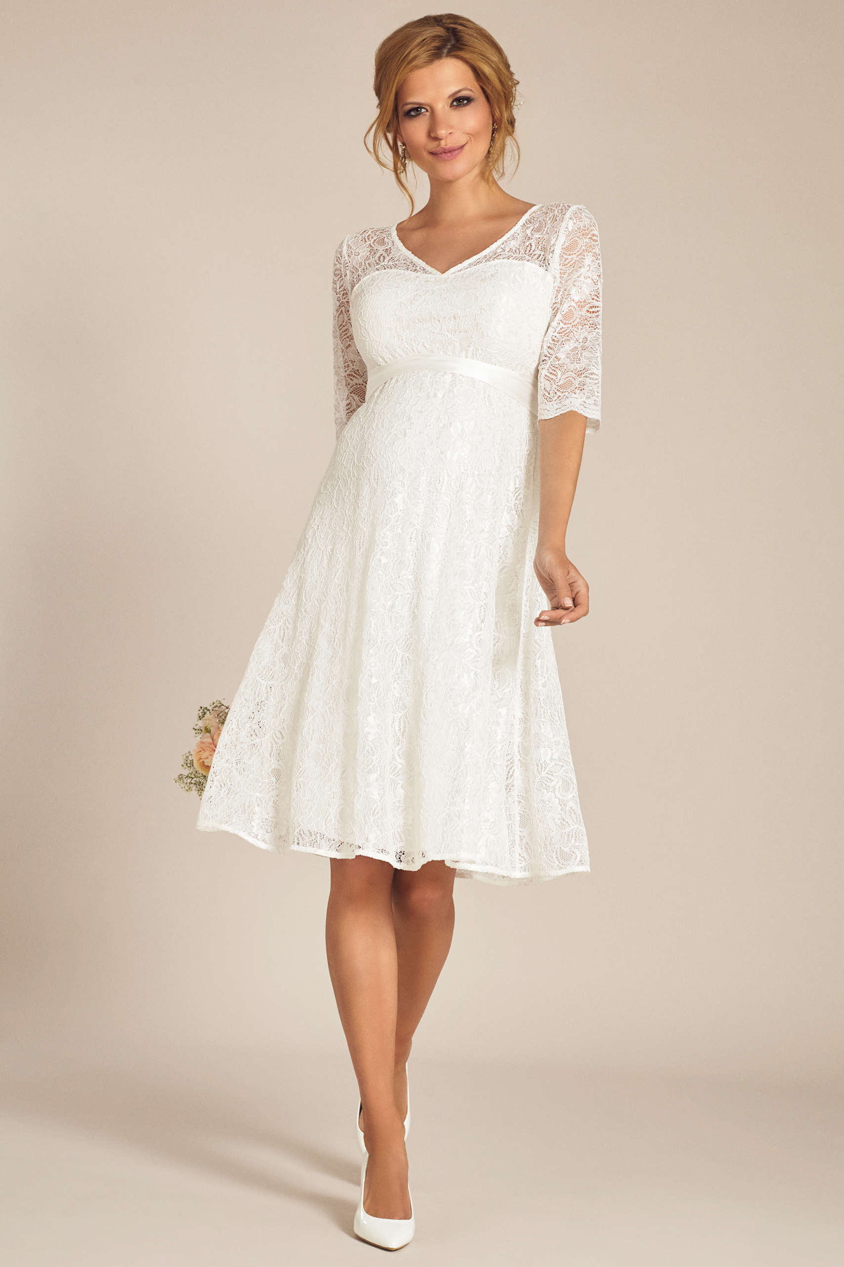 A-Linien Umstandsbrautkleid aus hochwertiger Spitze mit 3/4 Ärmeln, V-Ausschnitt und schwingendem Rockteil. Die abnehmbare Schärpe kann die Empire-Linie zusätzlich betonen. Farbe: elfenbein