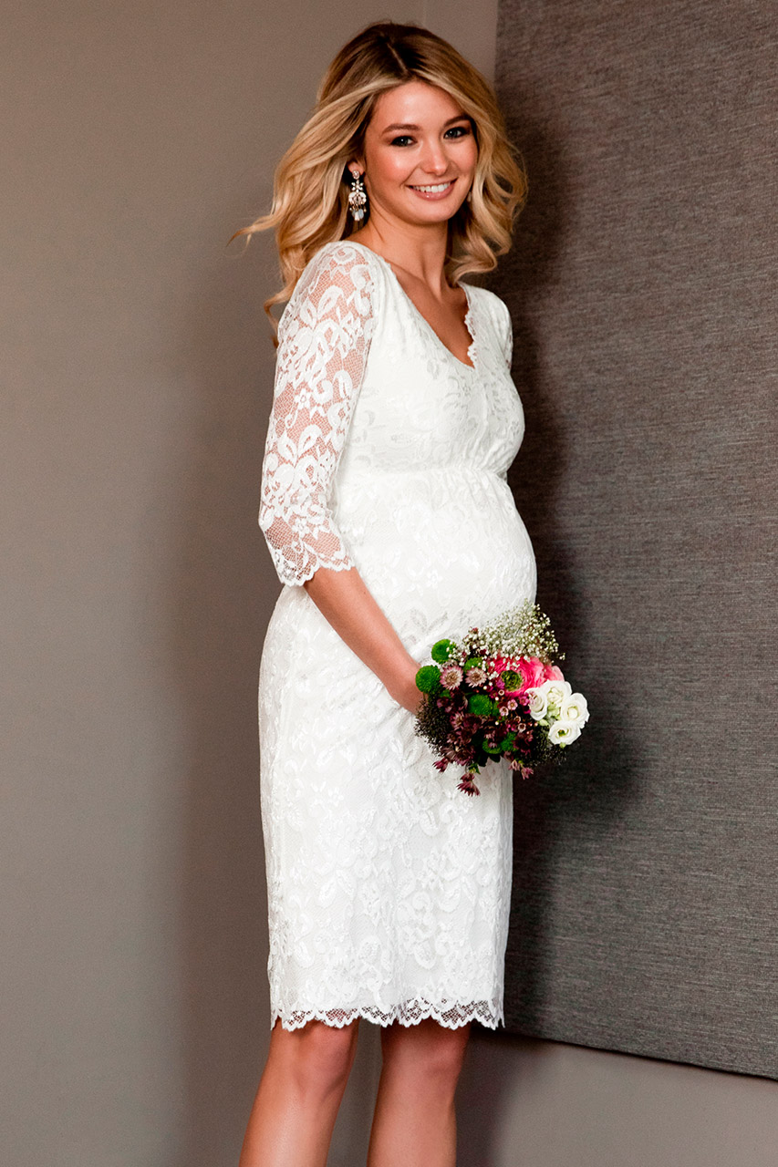 Knielanges Umstandsbrautkleid mit transparenten Spitzenärmeln aus wunderschöner Vintage-Spitze. Das Kleid wurde aus extra weichem Stretch-Material hergestellt und gibt deinem Bauch in jeder Phase der Schwangerschaft ausreichend Platz. Ausschnitt und Ärmelenden sind mit zarter, wellenförmiger Spitze eingefasst. Das Brautkleid kann wunderbar mit einer unserer Schärpen ergänzt werden (nicht im Lieferumfang enthalten). Farbe: elfenbein