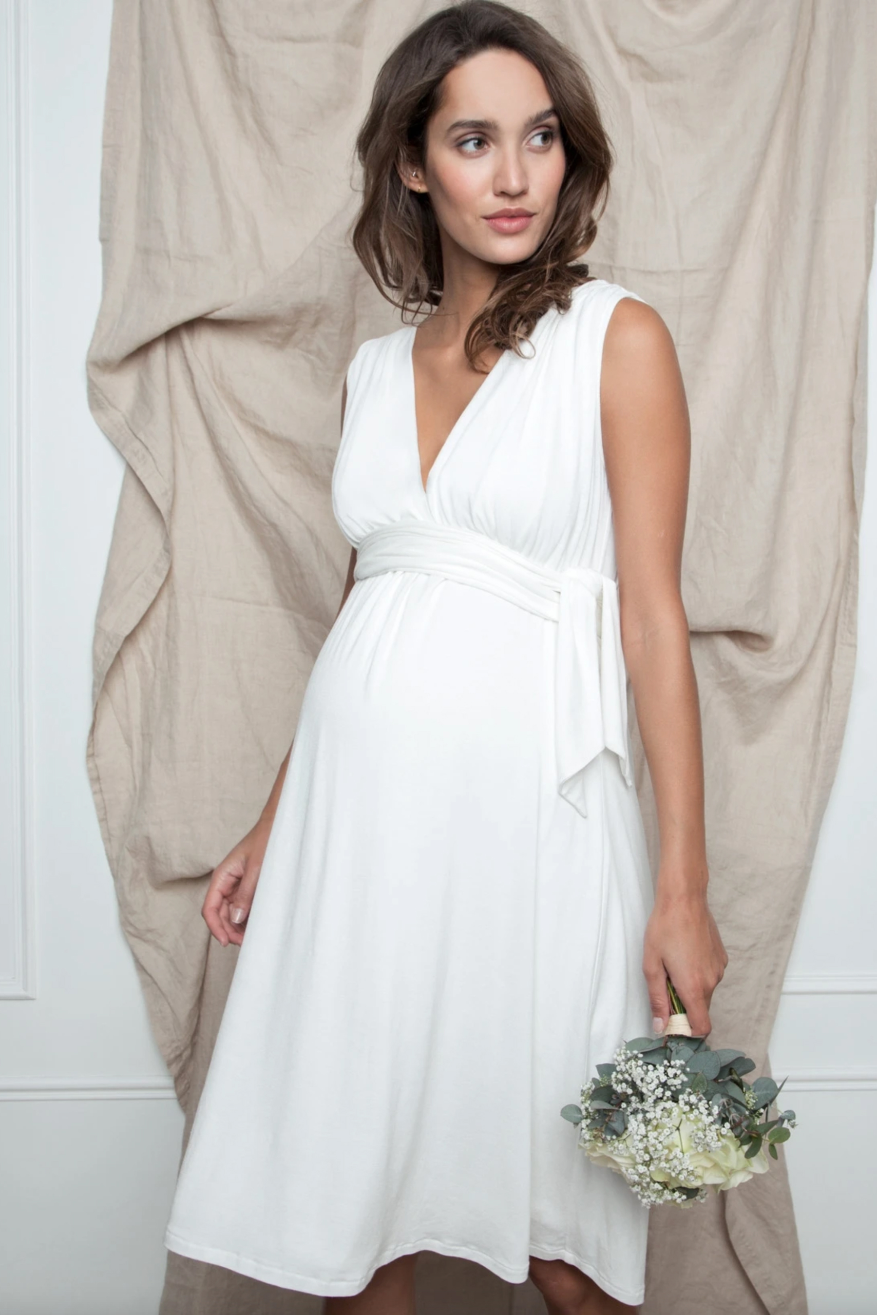 Umstandsbrautkleid in klassischem Look mit beidseitigem V-Ausschnitt, leichter Raffung an den Schultern und breitem Bindegürtel unterhalb der Brust. Der fließende Stoff umspielt sehr schön deinen wachsenden Babybauch und verleiht dir Eleganz. Du kannst es auch als Stillkleid tragen dank des flexiblem Cache-Couer Ausschnitts. Farbe: elfenbein