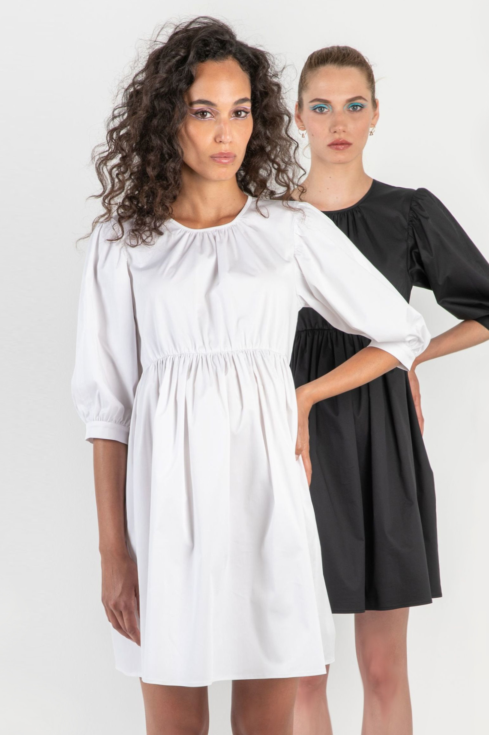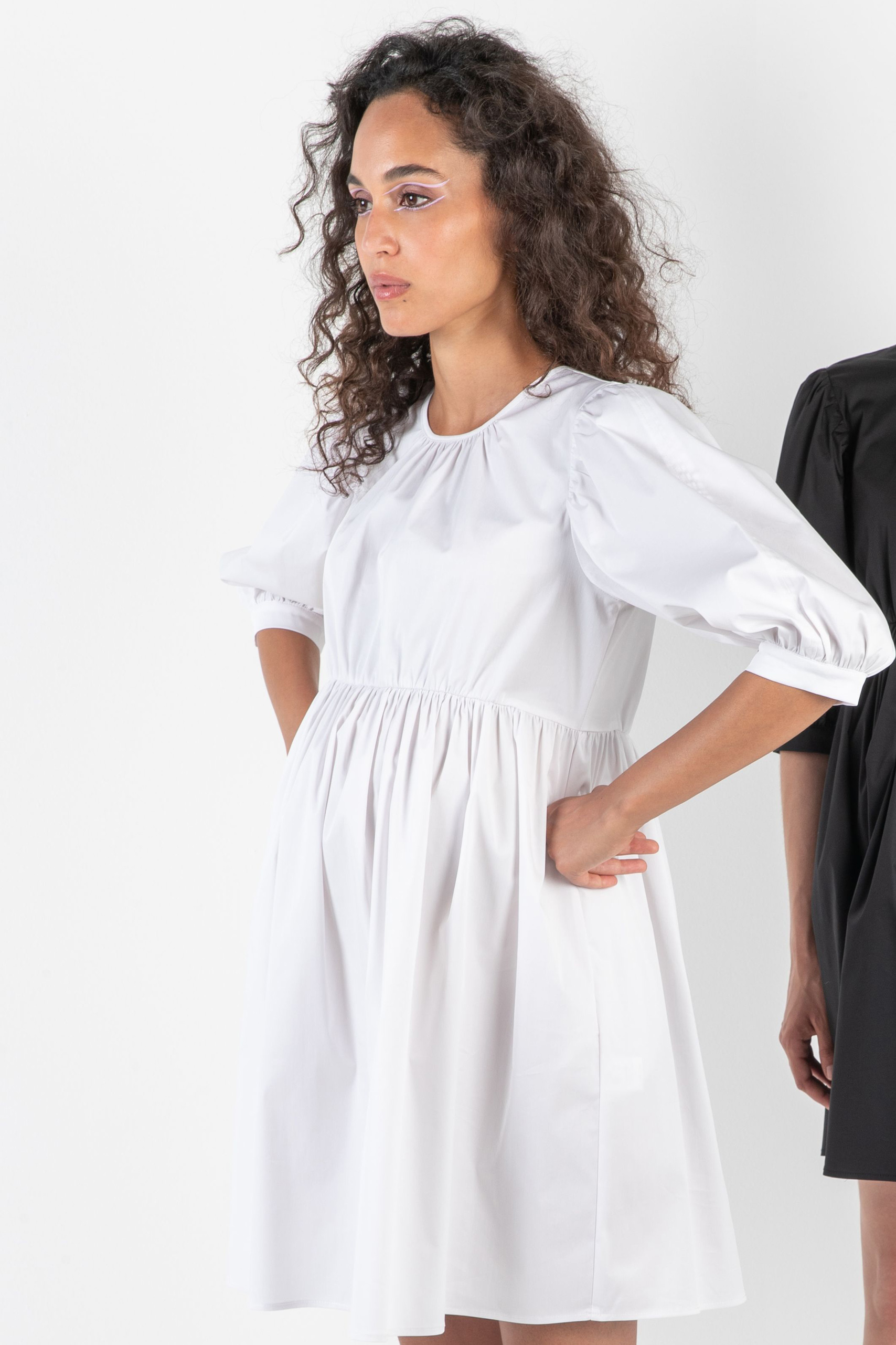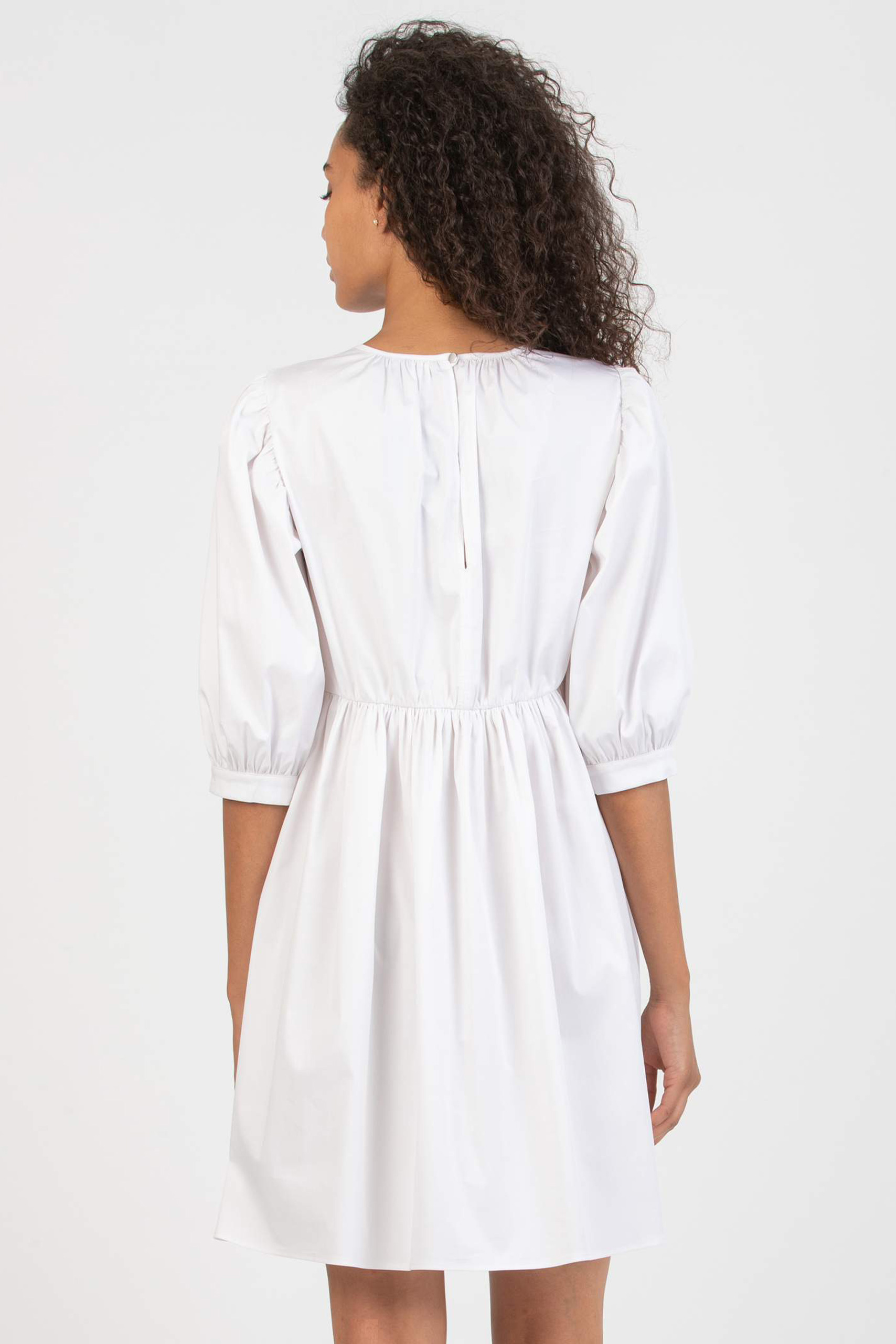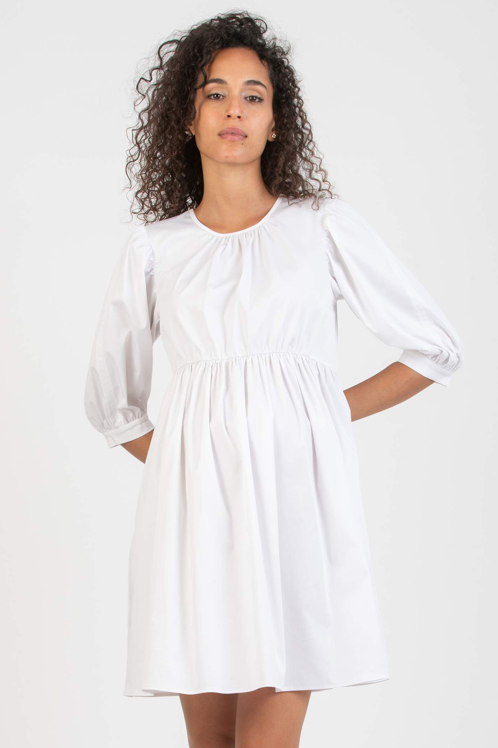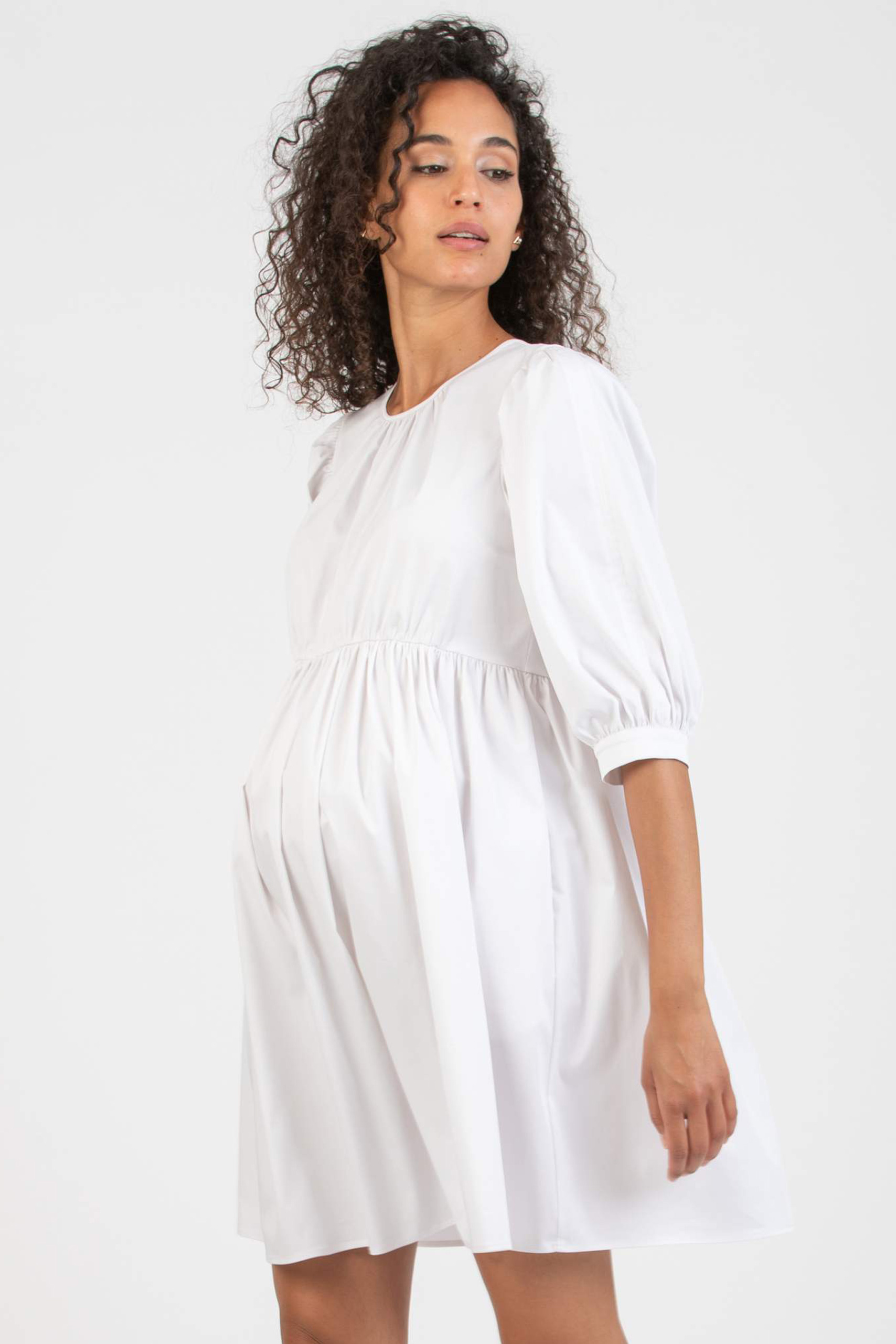 Mini Umstandskleid mit Puffärmeln in 3/4 Länge. Raffungen am Rundhalsausschnitt und der Empirenaht sorgen dafür, dass dein Baby Bauch und deine Brust jederzeit genügend Platz zum Wachsen haben. Farbe: weiß