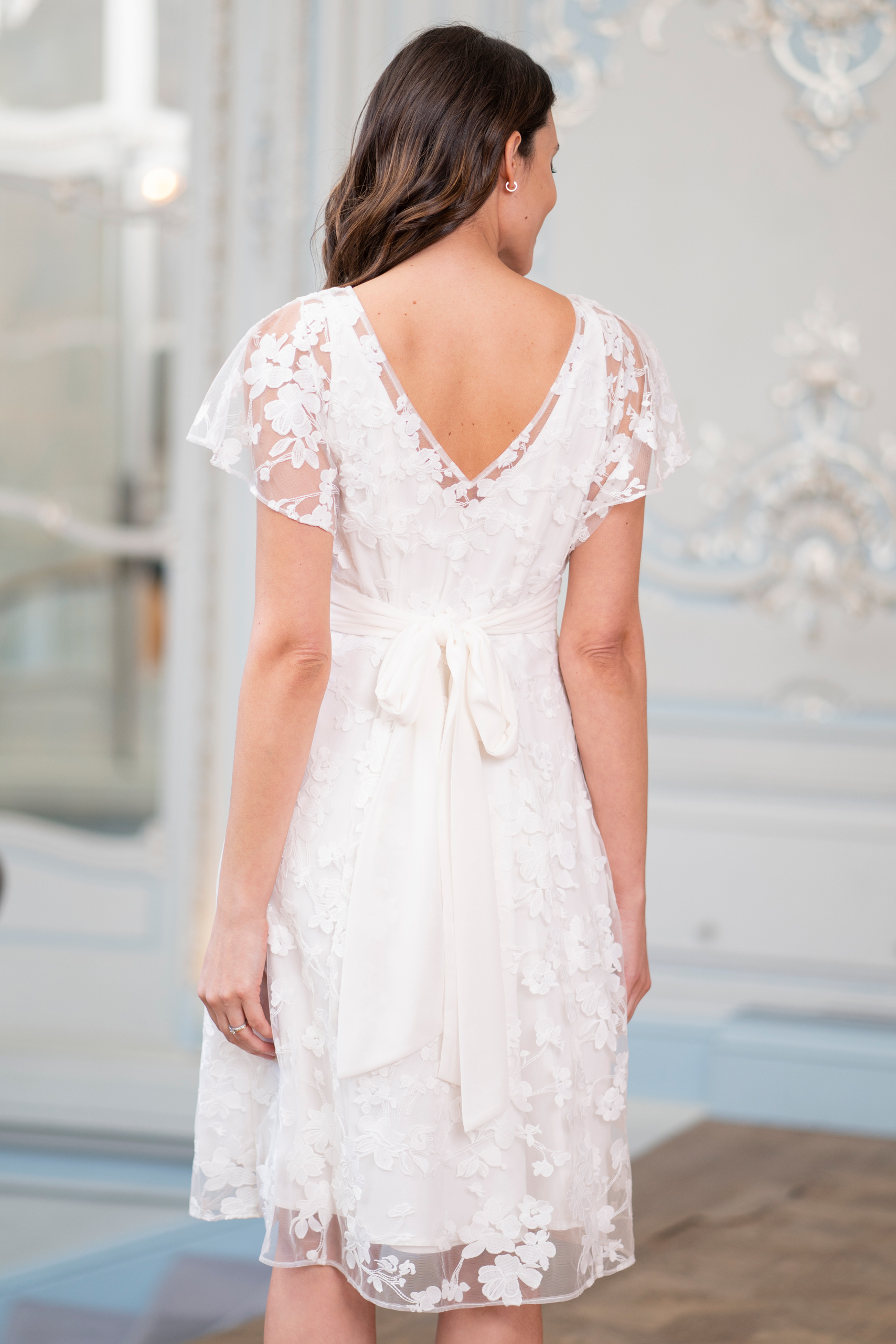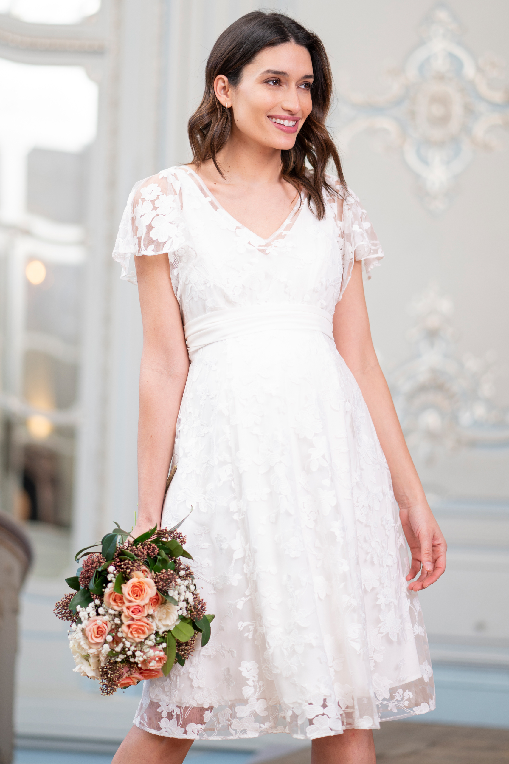 Umstandsbrautkleid aus zarter, transparenter Spitze mit Blumenapplikationen, mit Schärpe und Stillöffnung. Die transparenten Flügelärmel verleihen dem Kleid einen romantischen Look und das Unterkleid aus weicher Viskose sorgt für ein angenehmes Tragegefühl und passt sich deinem Babybauch perfekt an. Durch die geschickt, versteckte Stillöffnung kannst du jederzeit schnell und diskret stillen. Für einen traumhaft, romantischen Look an deinem großen Tag. Farbe: elfenbein