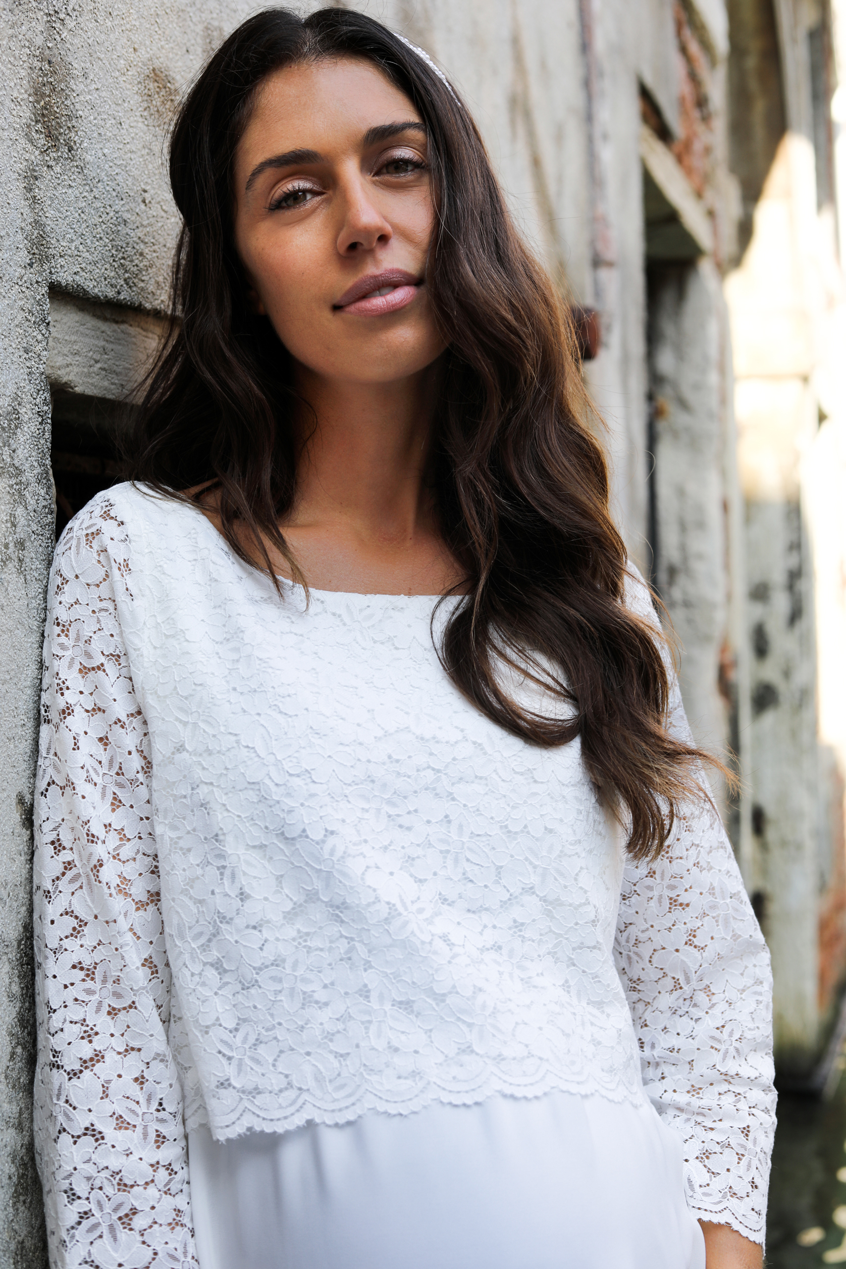 Umstandsbrautkleid mit Spitzenoberteil und transparenten 3/4 Ärmeln in A-Linie und Rundhalsausschnitt. Das Innenfutter aus weicher Viskose schmiegt sich angenehm an deine sensible Haut. Farbe: elfenbein