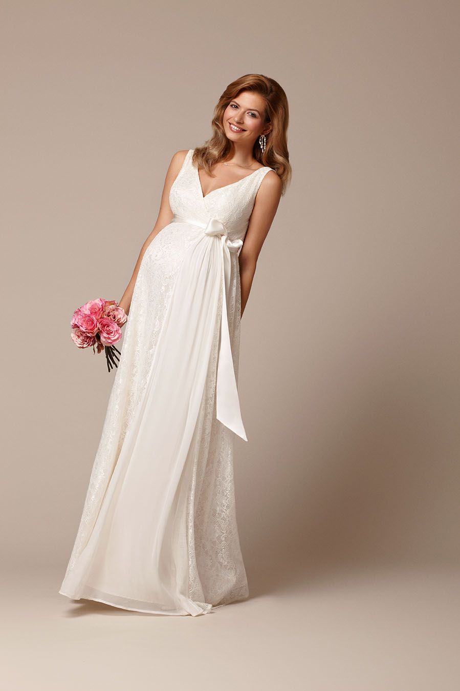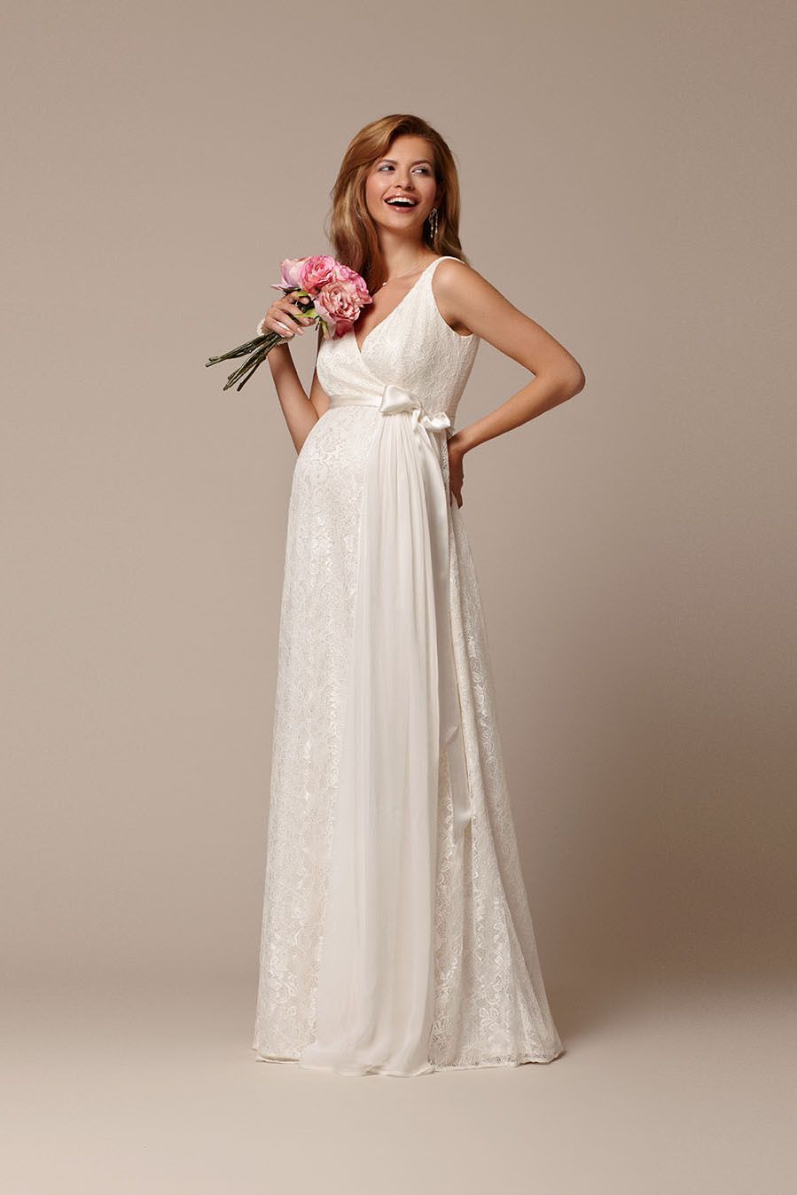 Langes Umstandsbrautkleid mit Spitze und Schärpe