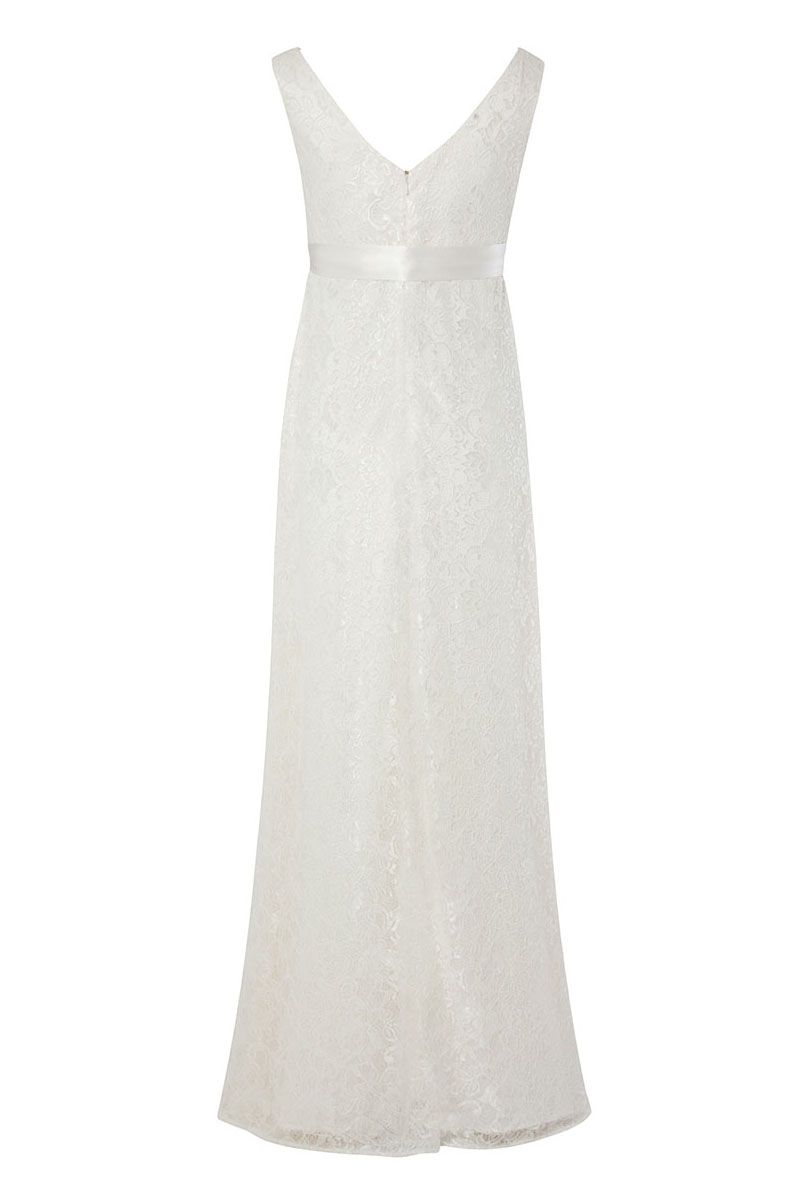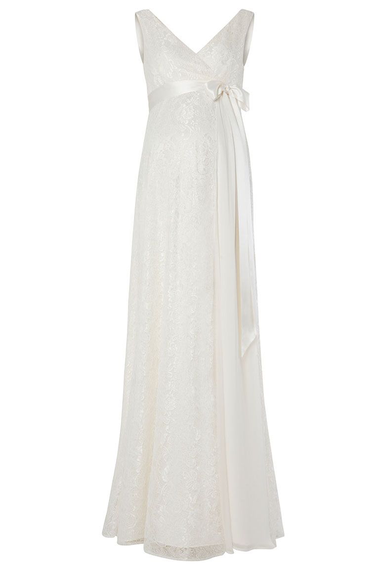 Bodenlanges Umstandsbrautkleid aus feinster Spitze mit schwingendem Rockteil und V-Ausschnitt. Die abnehmbare Schärpe betont deine Empire-Linie besonders schön. Pflegehinweis: nicht maschinenwaschbar, bitte in der Reinigung reinigen. Farbe: elfenbein