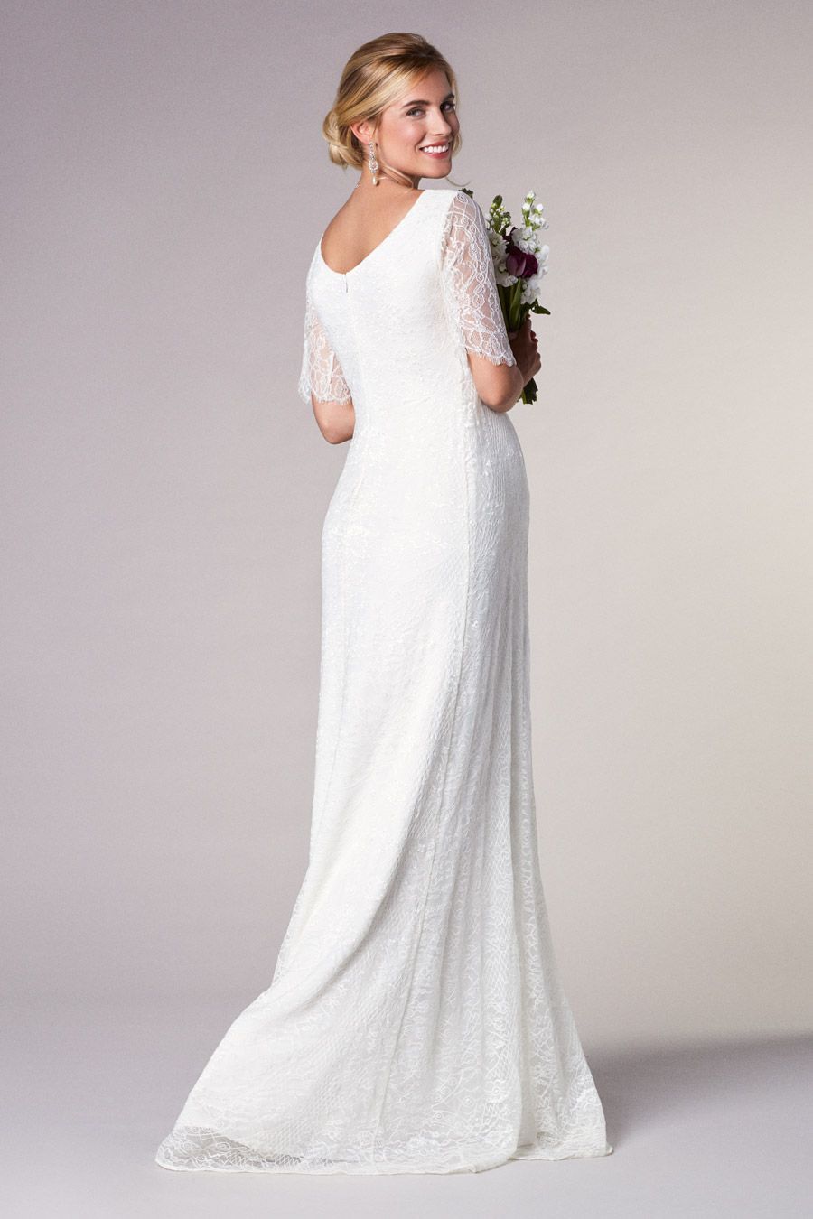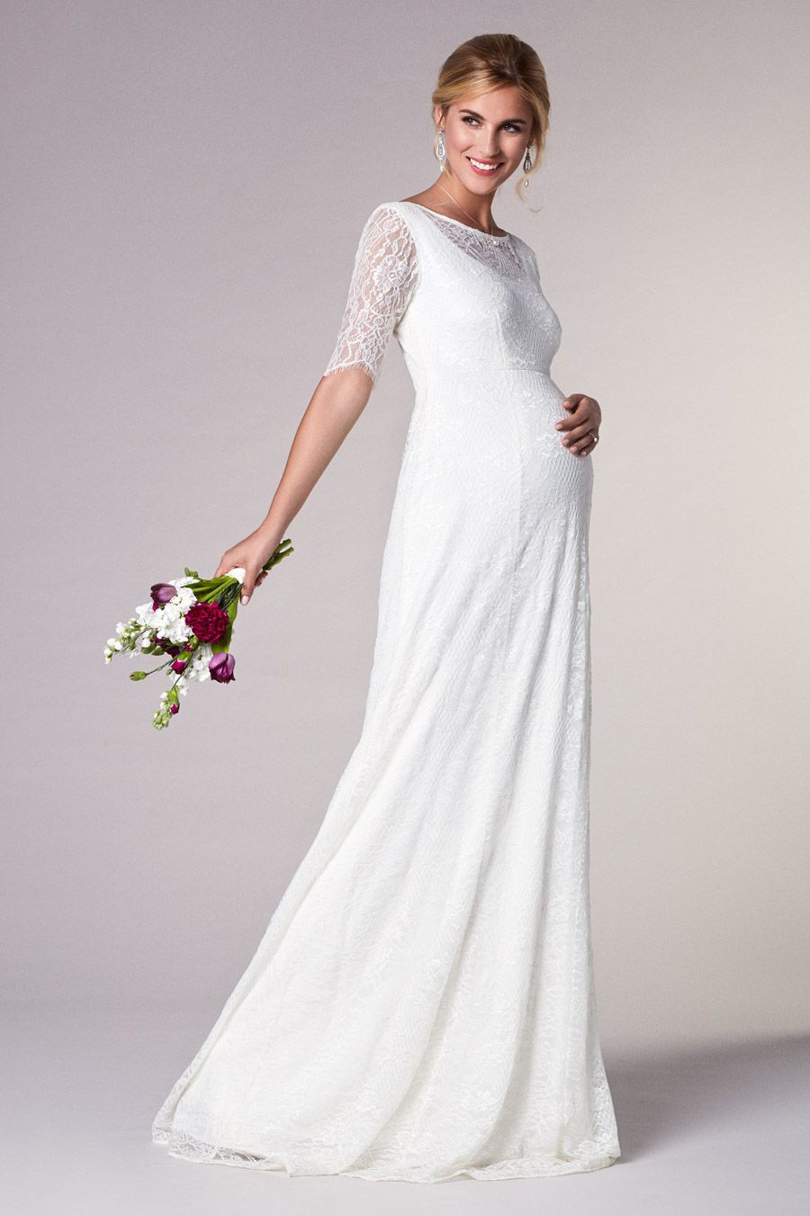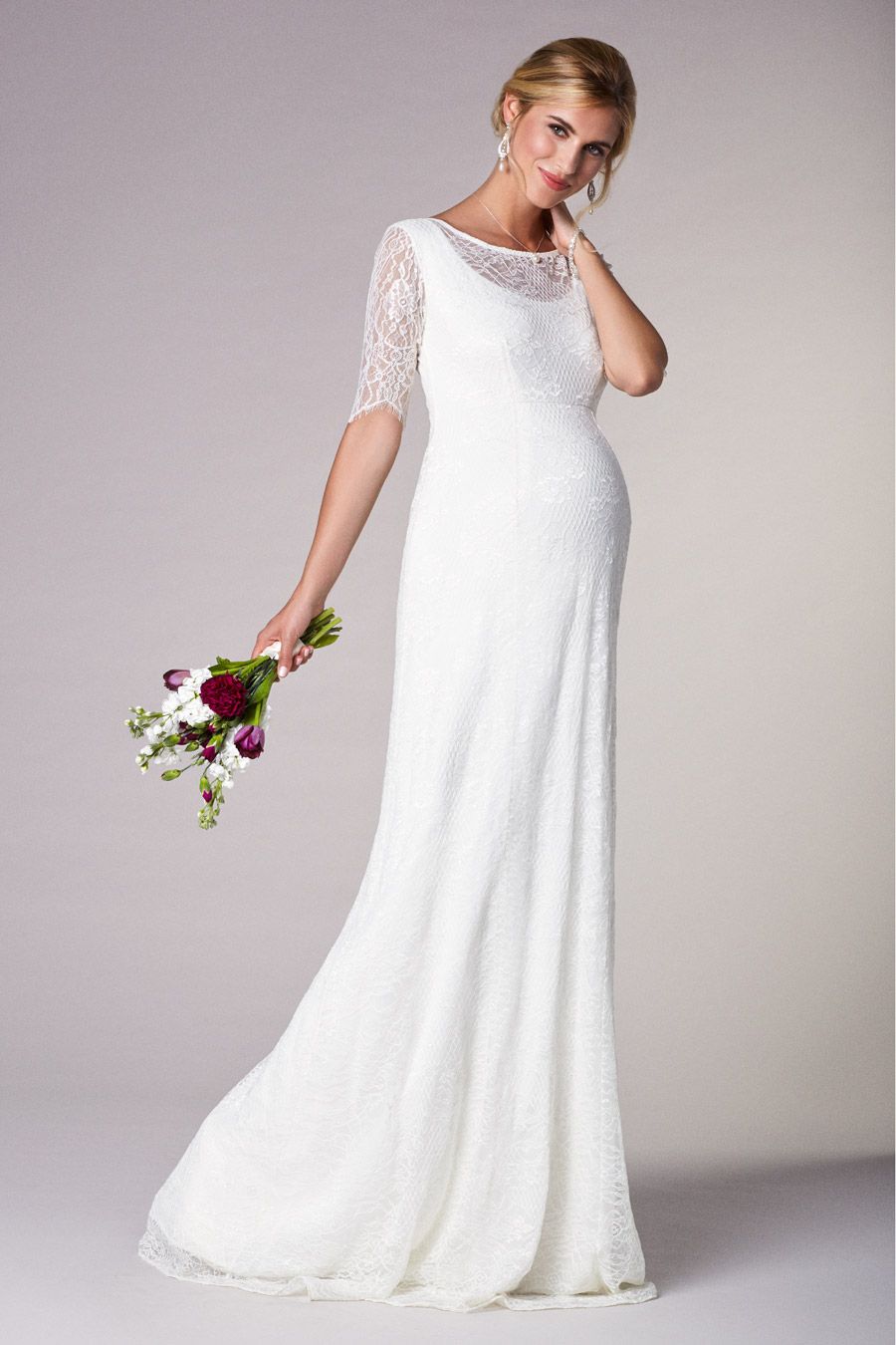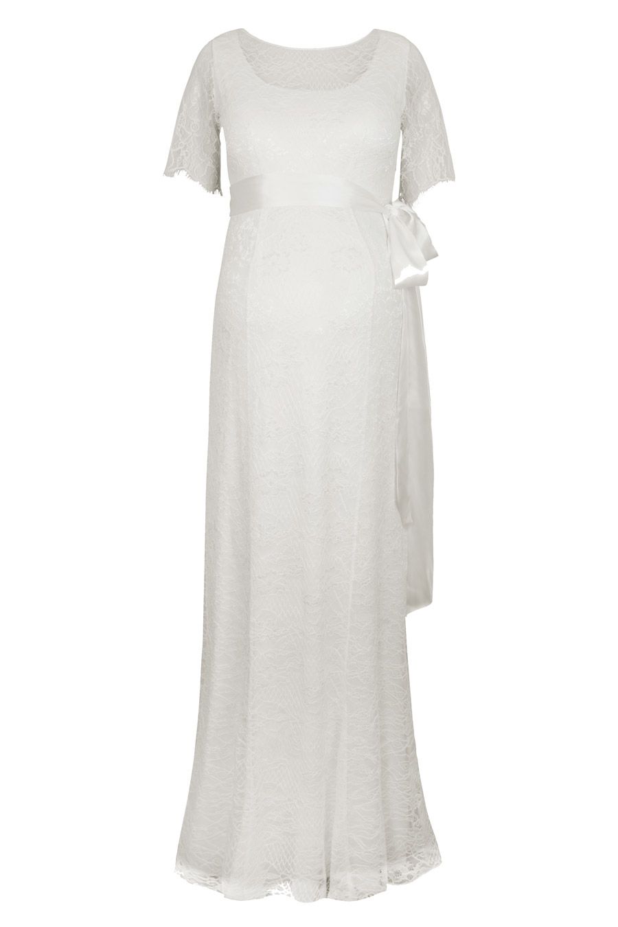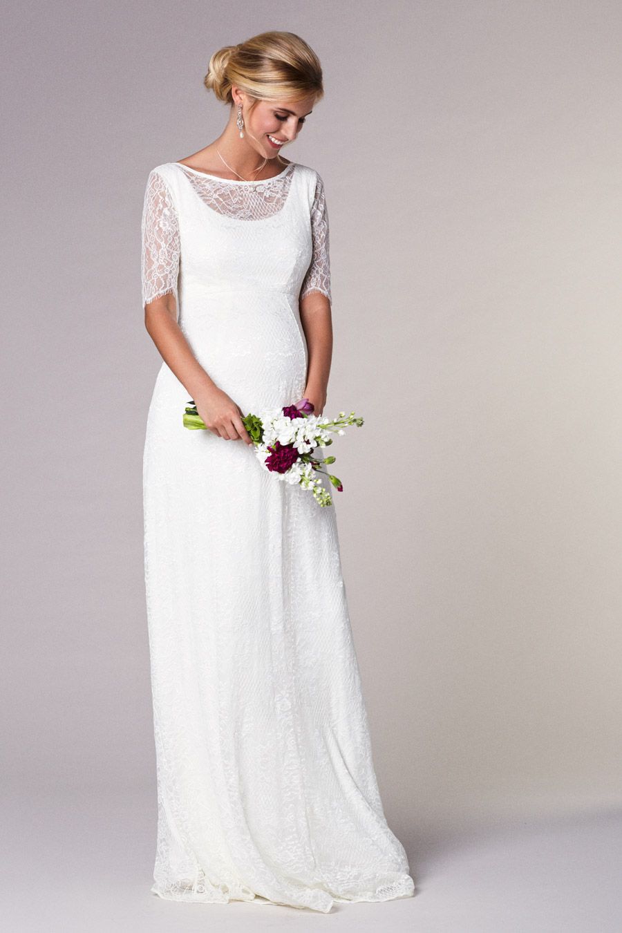 Bodenlanges Umstandsbrautkleid aus wunderschöner Spitze mit halblangen Ärmeln und Spitzen-Dekolleté. Das Kleid kommt ohne Schärpe. Pflegehinweis: nicht maschinenwaschbar, bitte in der Reinigung reinigen. Farbe: elfenbein