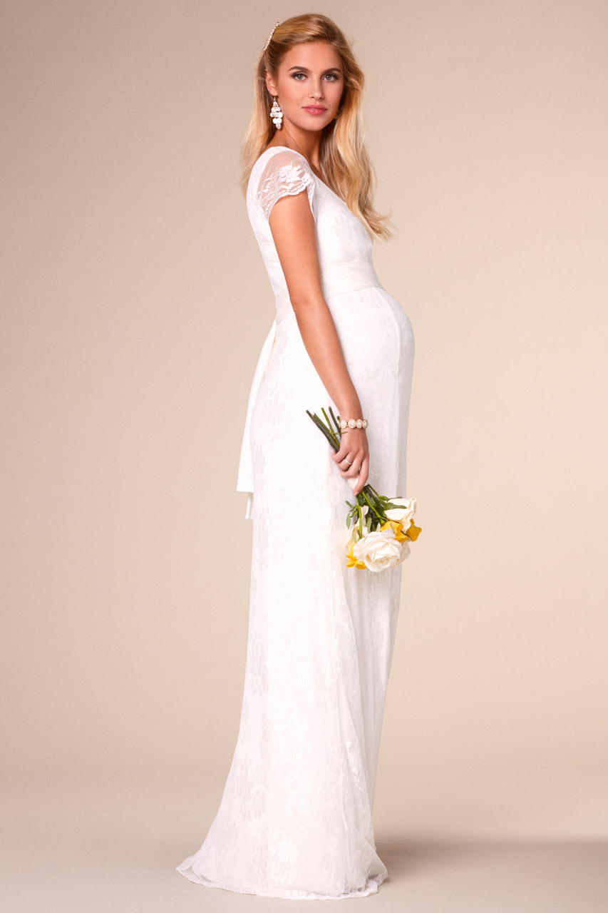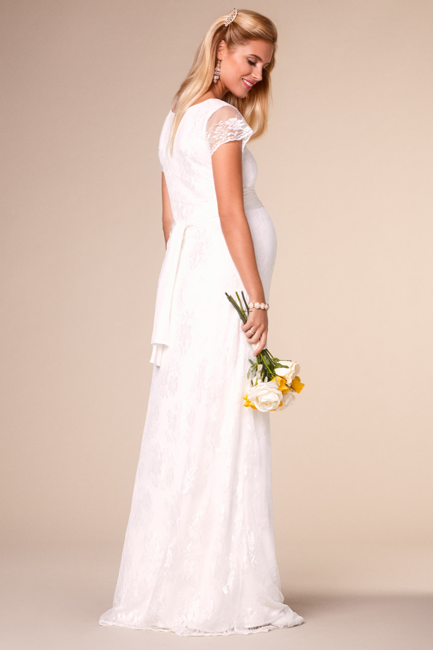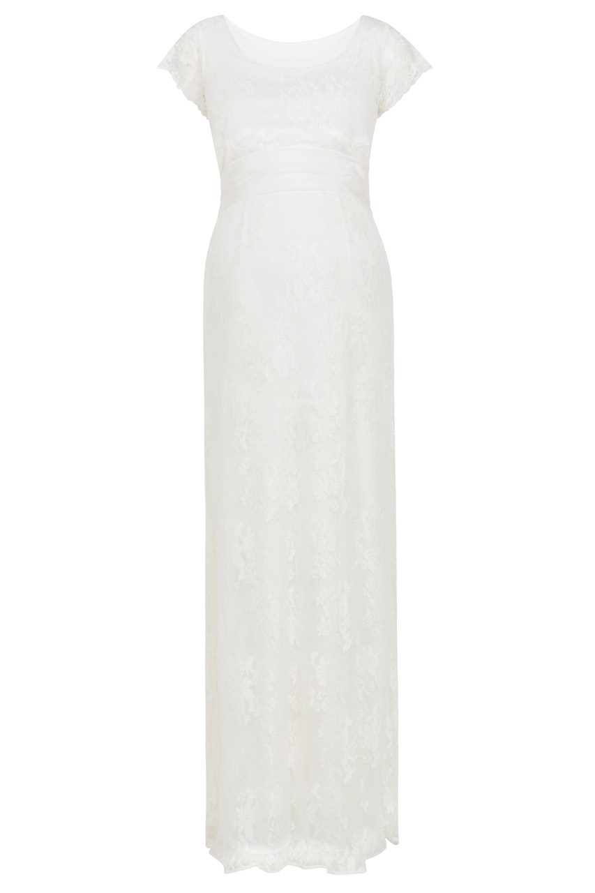 Bodenlanges Umstands- und Stillbrautkleid aus edler Spitze mit leicht ausgestelltem, kurzen, transparenten Ärmeln und Rundhalsausschnitt. Das doppellagige Bustier kann nach dem Aufbinden der Schärpe hochgeschoben werden und bietet einen einfachen Zugang zur Brust. Farbe: elfenbein