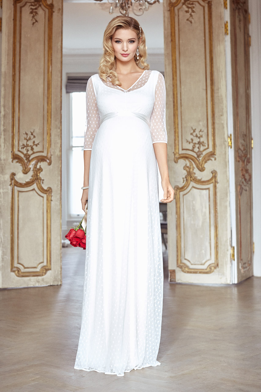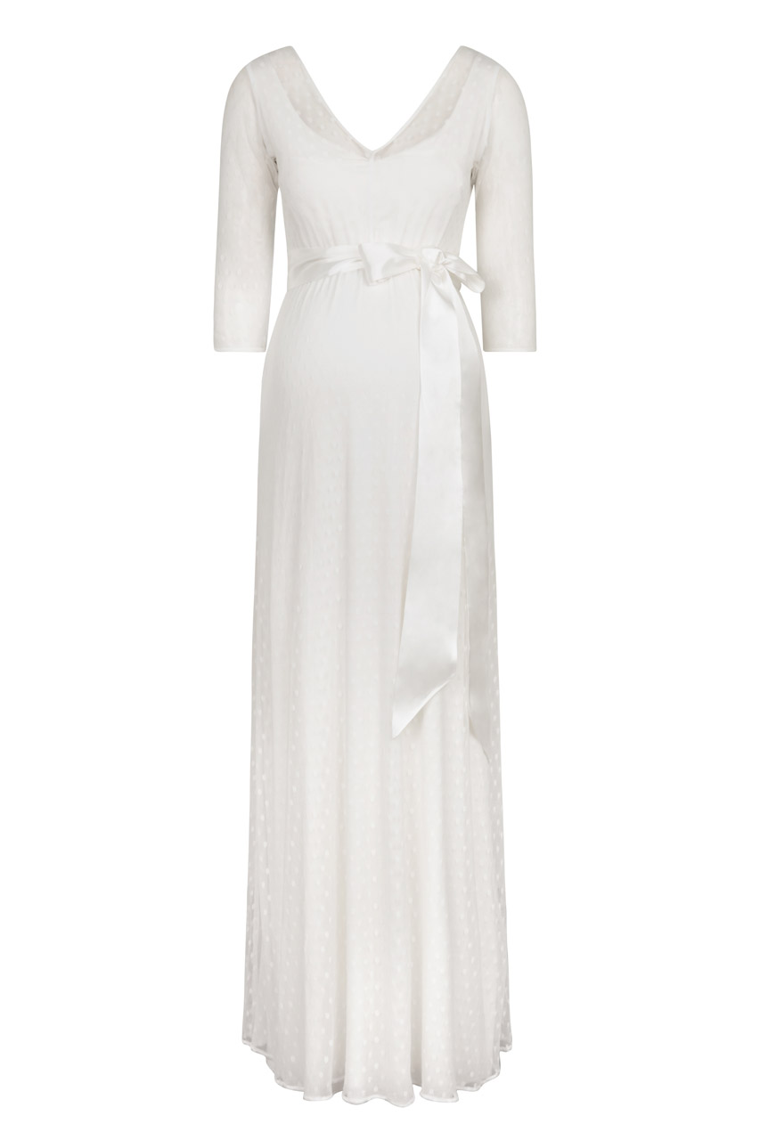 Umstandsbrautkleid mit transparenter Polka-Dot-Spitze, 3/4 Ärmeln, extra lang geschnittenem Rock und schönem Herzdekolleté. Die Empire Line kann durch die abnehmbare Schärpe zusätzlich betont werden. Das Kleid kommt ohne Schärpe. Farbe: elfenbein