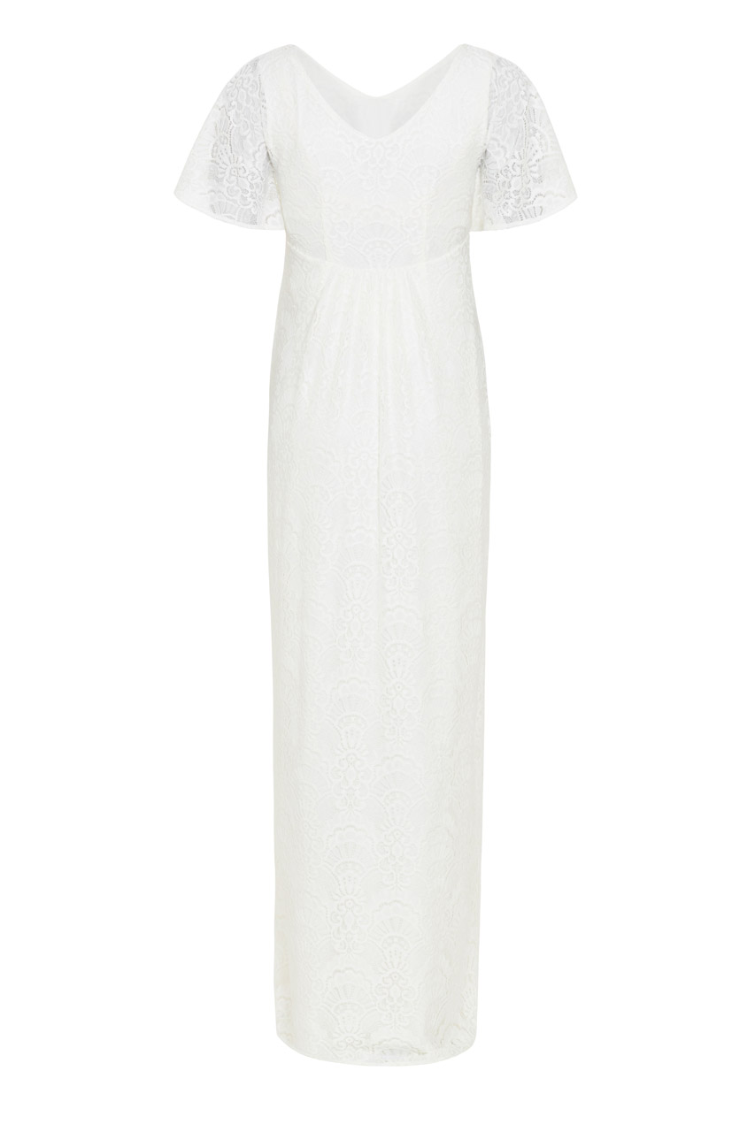 Umstandsbrautkleid aus edler Blumen-Spitze mit kurzen Kimonoärmeln, V-Ausschnitt und langem Rockteil. Eine zusätzliche Schärpe betont die Empire Line und kann zu einer schönen Schleife gebunden werden. Farbe: elfenbein