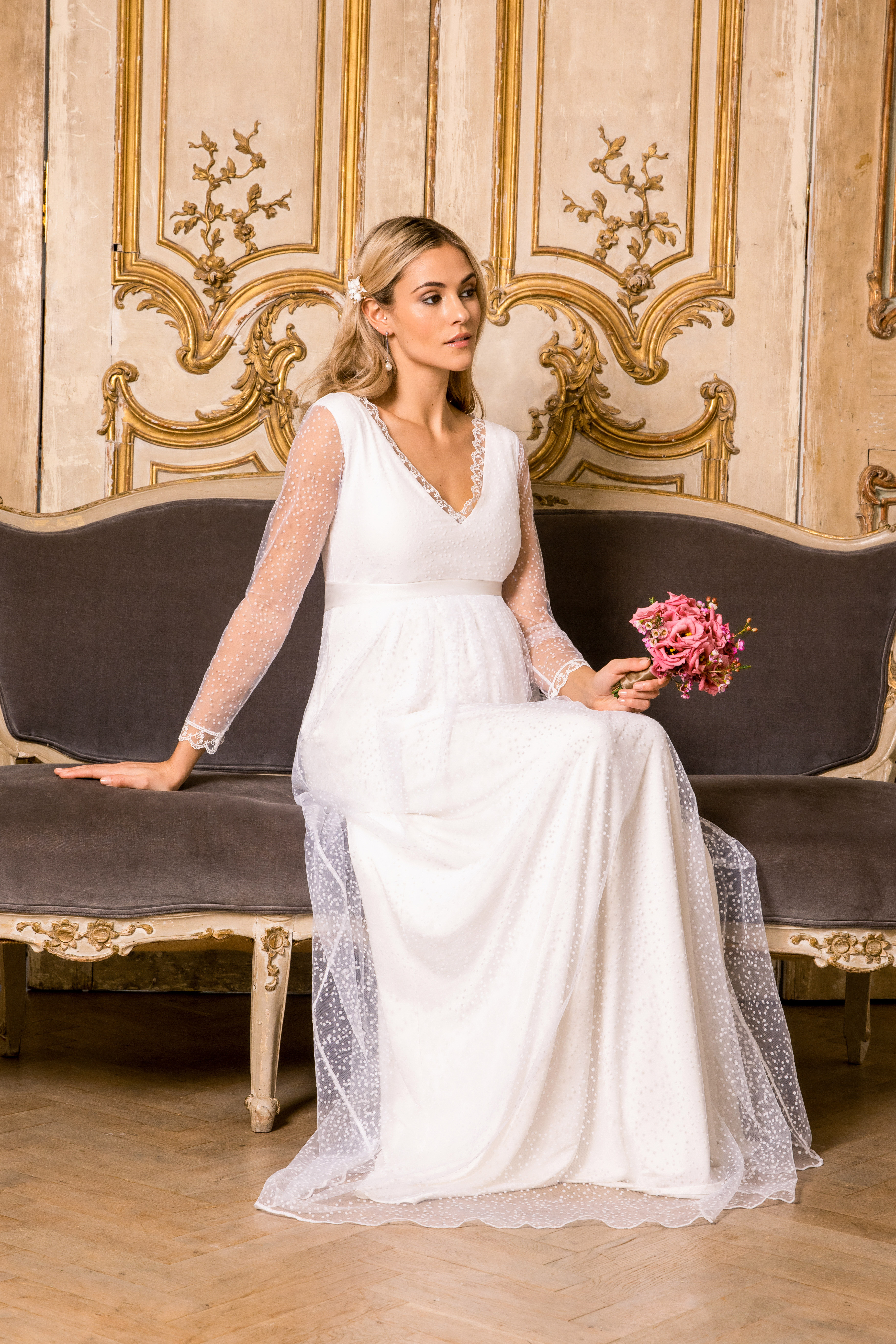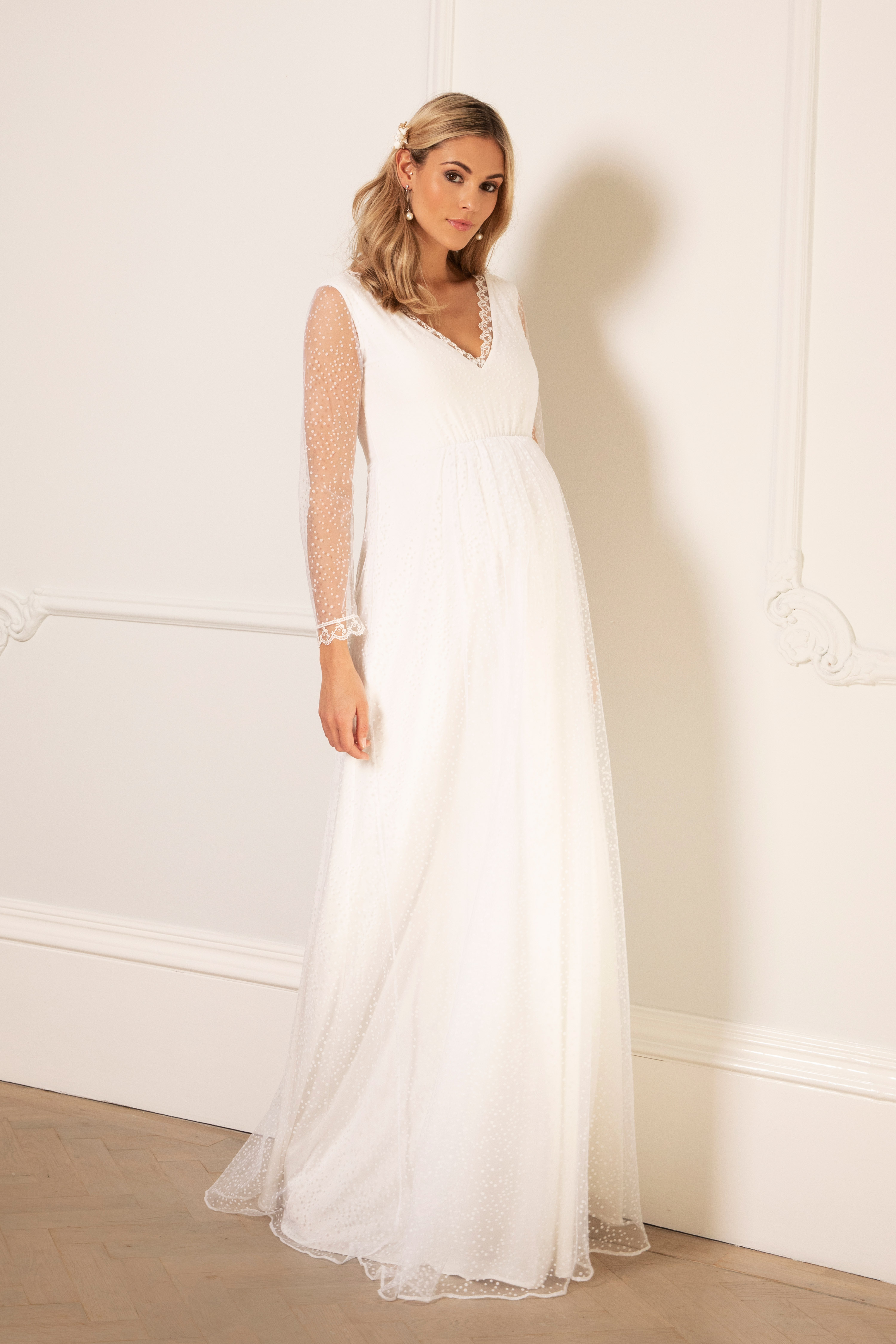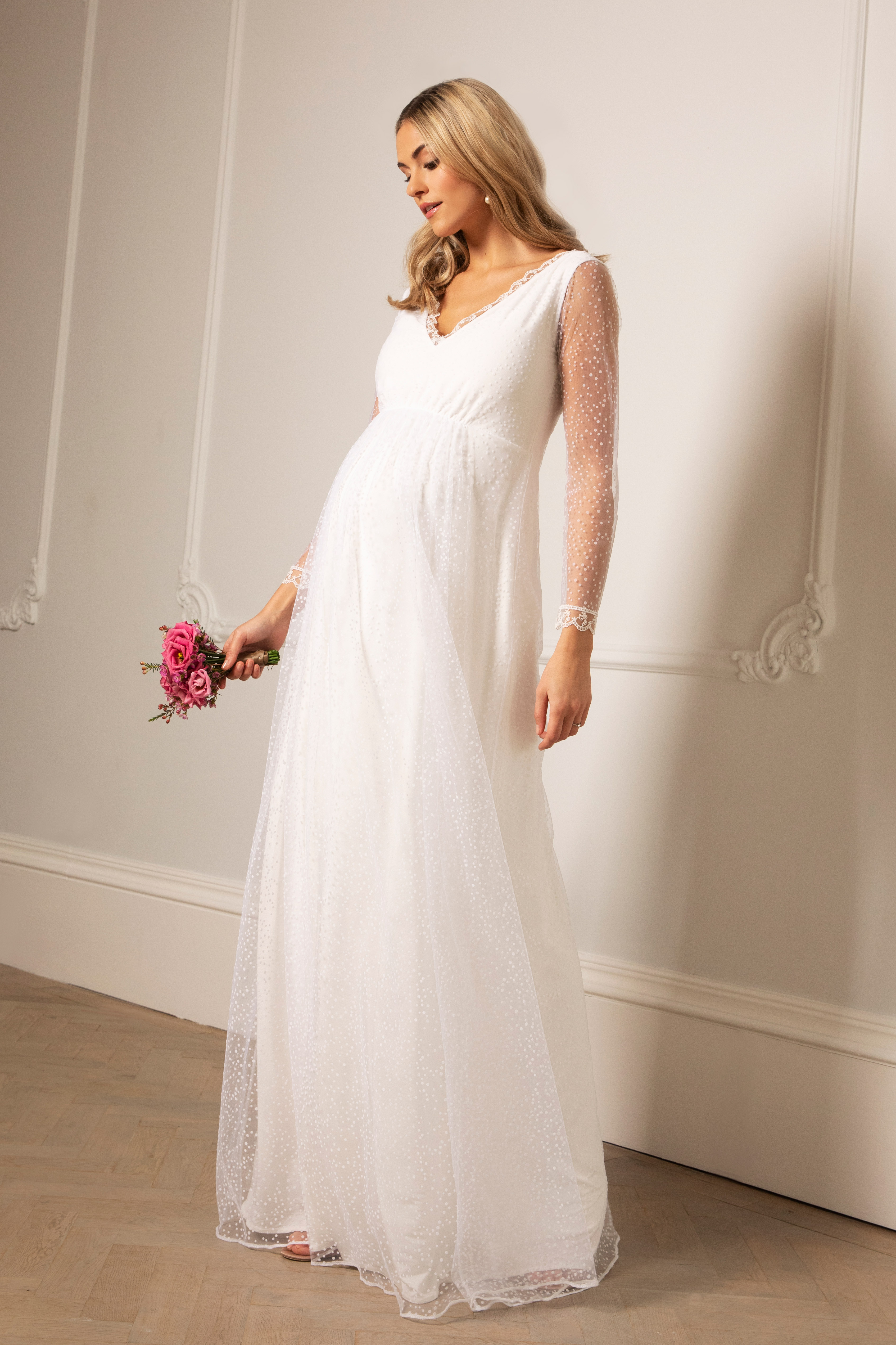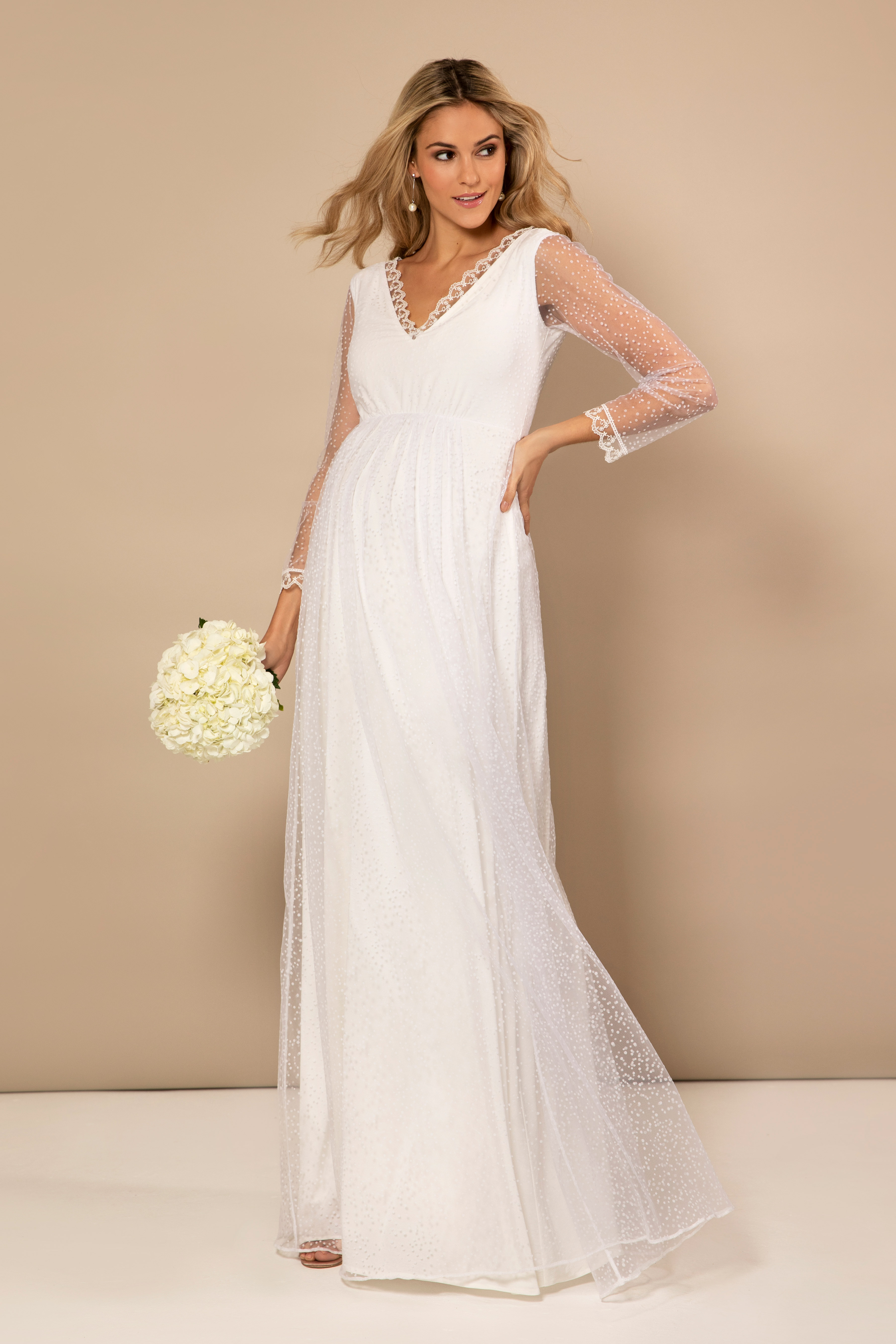 Zweilagiges, langes Umstandsbrautkleid aus zarter Pünktchenspitze mit transparenten Spitzenärmeln und schwingendem Rock. Die Säume an den Ärmeln und am V-Ausschnitt sind zusätzlich mit feinster Spitze verziert, die elastische Naht unterhalb der Brust betont wunderschön deinen wachsenden Bauch und gibt ihm genügend Spielraum. Farbe: weiß